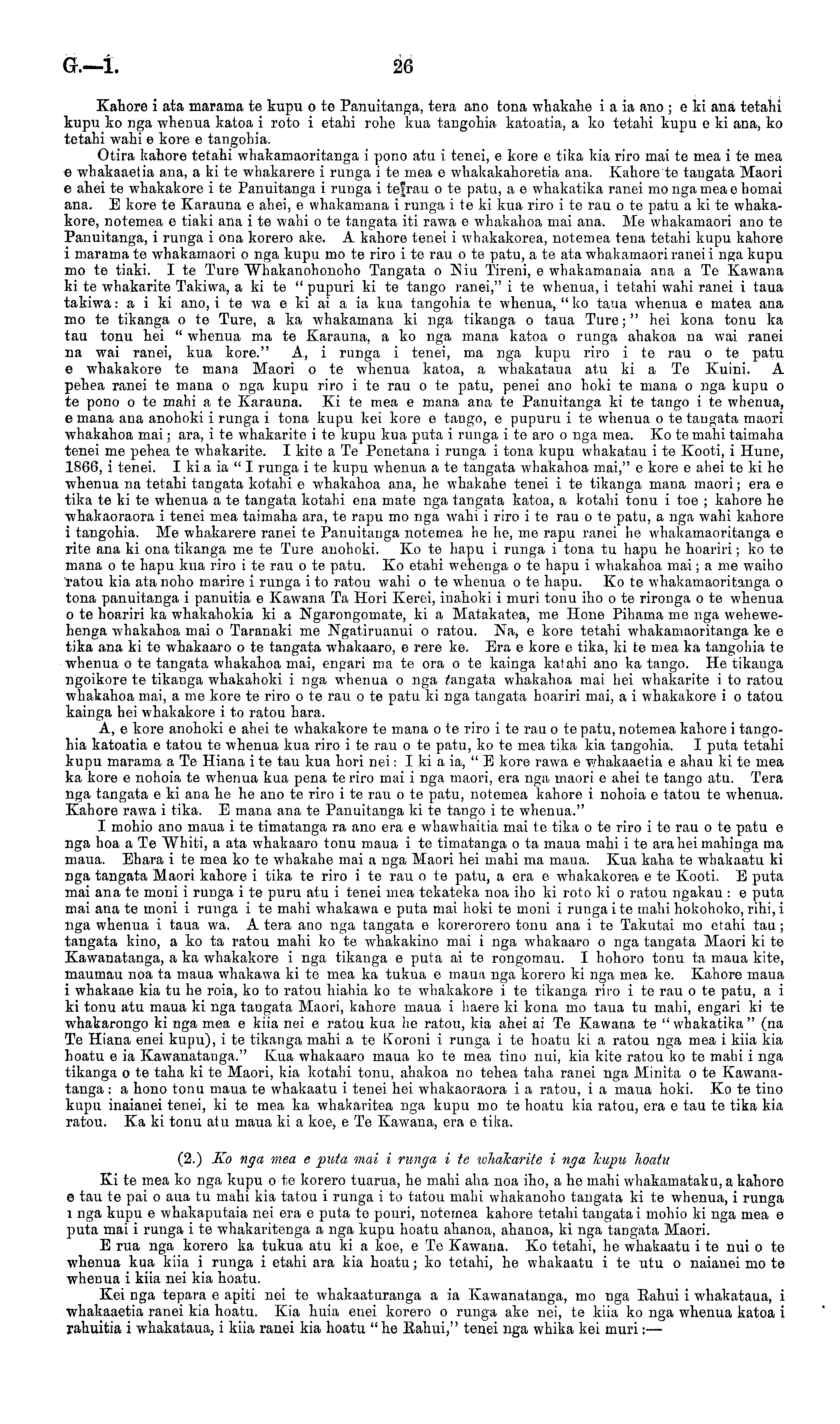 Kahore i ata marama te kupu o te Panuitanga, tera ano tona whakahe i a ia ano ; e ki ana tetahi kupu ko nga whenua katoa i roto i etahi rohe kua tangohia katoatia, a ko tetahi kupu e ki ana, ko tetahi wahi e kore e tangohia. Otira kahore tetahi whakamaoritanga i pono atu i tenei, e kore e tika kia riro mai te mea i te mea e whakaaetia ana, aki te whakarere i runga ite mea e whakakahoretia ana. Kahore te tangata Maori e ahei te whakakore i te Panuitanga i runga i tefrau o te patu, a e whakatika ranei mo nga mea e homai ana. E kore te Karauna e ahei, e whakamana i runga ite ki kua riro ite rau ote patu aki te whakakore, notemea e tiaki ana ite wahi ote tangata iti rawa e whakahoa mai ana. Me whakamaori ano te Panuitanga, i runga i ona korero ake. A kahore tenei i whakakorea, notemea tena tetahi kupu kahore i marama te whakamaori o nga kupu mo te riro i te rau o te patu, a te ata whakamaori ranei i nga kupu mo te tiaki. I te Ture Whakanohonoho Tangata o Niu Tireni, e whakamanaia ana a Te Kawana ki te whakarite Takiwa, a ki te " pupuri ki te tango ranei," i te whenua, i tetahi wahi ranei i taua takiwa: a i ki ano, i te wa e ki ai a ia kua tangohia te whenua, "ko taua whenua e matea ana mo te tikanga o te Ture, a ka whakamana ki nga tikanga o taua Ture;" hei kona tonu ka tau tonu hei " whenua ma te Karauna, a ko nga mana katoa o runga ahakoa na wai ranei na wai ranei, kua kore." A, i runga i tenei, ma nga kupu riro i te rau o te patu e whakakore te mana Maori o te whenua katoa, a whakataua atu ki a Te Kuini. A pehea ranei te mana o nga kupu riro i te rau o te patu, penei ano hoki te mana o nga kupu o te pono ote mahi ate Karauna. Ki te mea e mana ana te Panuitanga ki te tango ite whenua, e mana ana anohoki i runga i tona kupu kei kore e tango, e pupuru i te whenua o te tangata maori whakahoa mai; ara, ite whakarite ite kupu kua puta i runga ite aro o nga mea. Ko te mahi taimaha tenei me pehea te whakarite. I kite aTe Penetana i runga i tona kupu whakatau ite Kooti, i Hune, 1866, i tenei. Ikiaia " I runga ite kupu whenua ate tangata whakahoa mai," e kore e ahei te ki he whenua na tetahi tangata kotahi e whakahoa ana, he whakahe tenei i te tikanga mana maori; era e tika te ki te whenua a te tangata kotahi ena mate nga tangata katoa, a kotahi tonu i toe ; kahore he whakaoraora i tenei mea taimaha ara, te rapu mo nga wahi i riro i te rau o te patu, a nga wahi kahore i tangohia. Me whakarere ranei te Panuitanga notemea he he, me rapu ranei he whakamaoritanga e rite ana ki ona tikanga me te Ture anohoki. Ko te hapu i runga i tona tu hapu he hoariri; ko te mana ote hapu kua riro ite rau ote patu. Ko etahi wehenga ote hapu i whakahoa mai; ame waiho ratou kia ata noho marire i runga ito ratou wahi ote whenua ote hapu. Ko te whakamaoritanga o tona panuitanga i panuitia e Kawana Ta Hori Kerei, inahoki i muri tonu iho o te rironga o te whenua 0 te hoariri ka whakahokia ki a Ngarongomate, ki a Matakatea, me Hone Pihama me nga wehewehenga whakahoa mai o Taranaki me Ngatiruanui o ratou. Na, e kore tetahi whakamaoritanga ke e tika ana ki te whakaaro ote tangata whakaaro, e rere ke. Era e kore e tika, ki te mea ka tangohia te whenua ote tangata whakahoa mai, engari ma te ora o te kainga katahi ano ka tango. He tikanga ngoikore te tikanga whakahoki i nga whenua o nga tangata whakahoa mai hei whakarite i to ratou whakahoa mai, a me kore te riro o te rau o te patu ki nga tangata hoariri mai, a i whakakore i o tatou kainga hei whakakore i to ratou hara. A, e kore anohoki e ahei te whakakore te mana o te riro i te rau o te patu, notemea kahore i tangohia katoatia e tatou te whenua kua riro ite rau ote patu, ko te mea tika kia tangohia. I puta tetahi kupu marama aTe Hiana ite tau kua hori nei: Iki a ia, " E kore rawa e whakaaetia e ahau ki te mea ka kore e nohoia te whenua kua pena teriro mai i nga maori, era nga maori e ahei te tango atu. Tera nga tangata e ki ana he he ano te riro i te rau o te patu, notemea kahore i nohoia e tatou te whenua. Kahore rawa i tika. E mana ana te Panuitanga ki te tango ite whenua." I mohio ano maua i te timatanga ra ano era e whawhaitia mai te tika o te riro i te rau o te patu e nga hoa a Te Whiti, a ata whakaaro tonu maua i te timatanga o ta maua mahi i te ara hei mahinga ma maua. Ehara ite mea ko te whakahe mai a nga Maori hei mahi ma maua. Kua kaha te whakaatu ki nga tangata Maori kahore i tika te riro i te rau o te patu, a era e whakakorea ete Kooti. E puta mai ana te moni i runga i te puru atu i tenei mea tekateka noa iho ki roto ki o ratou ngakau : e puta mai ana te moni i runga i te mahi whakawa e puta mai hoki te moni i runga ite mahi hokohoko, rihi, i nga whenua i taua wa. A tera ano nga tangata e korerorero tonu ana i te Takutai mo etahi tau; tangata kino, a ko ta ratou mahi ko te whakakino mai i nga whakaaro o nga tangata Maori ki te Kawanatanga, aka whakakore i nga tikanga e puta ai te rongomau. I hohoro tonu ta maua kite, maumau noa ta maua whakawa ki te mea ka tukua e maua nga korero ki nga mea ke. Kahore maua i whakaae kia tu he roia, ko to ratou hiahia ko te whakakore i te tikanga riro i te rau o te patu, a i ki tonu atu maua ki nga tangata Maori, kahore maua i haere ki kona mo taua tu mahi, engari ki te whakarongo ki nga mea e kiia nei e ratou kua he ratou, kia ahei ai Te Kawana te " whakatika " (na Te Hiana enei kupu), i te tikanga mahi a te Koroni i runga i te hoatu ki a ratou nga mea i kiia kia hoatu eia Kawanatanga." Kua whakaaro maua ko te mea tino nui, kia kite ratou ko te mahi i nga tikanga o te taha ki te Maori, kia kotahi tonu, ahakoa no tehea taha ranei nga Minita o te Kawanatanga : a hono tonu maua te whakaatu i tenei hei whakaoraora i a ratou, i a maua hoki. Ko te tino kupu inaianei tenei, ki te mea ka whakaritea nga kupu mo te hoatu kia ratou, era e tau te tika kia ratou. Ka ki tonu atu maua ki a koe, eTe Kawana, era e tika. (2.) Ko nga mea e puta mai i runga i te ivhakarite i nga kupu, hoatu Ki te mea ko nga kupu o te korero tuarua, he mahi aha noa iho,
