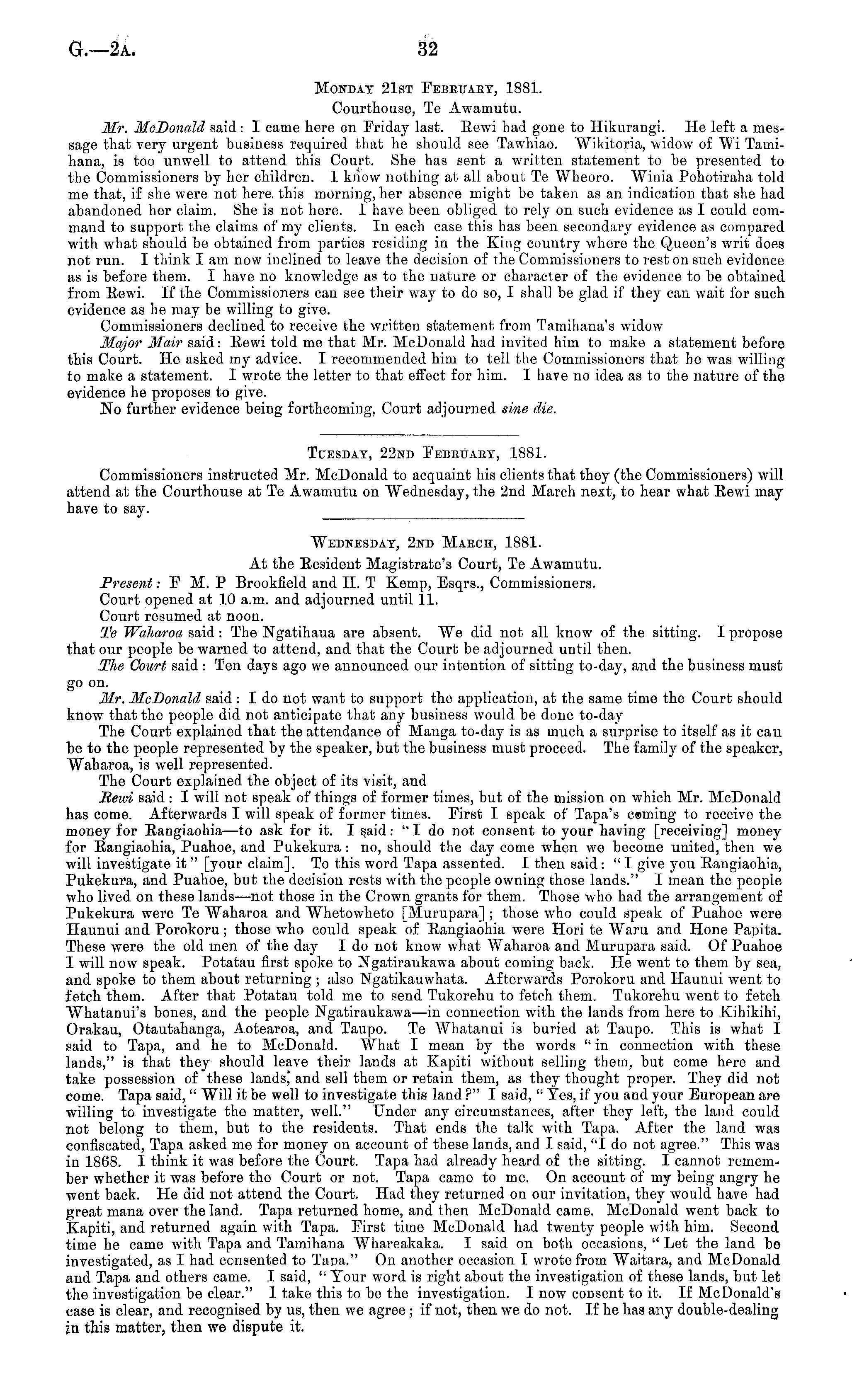Wednesday, 2nd March, 1881. At the Resident Magistrate's Court, Te Awamutu. Present: F M. P Brookfield and H. T Kemp, Esqrs., Commissioners. Court opened at 10 a.m. and adjourned until 11. Court resumed at noon. Te Waharoa said : The Ngatihaua are absent. We did not all know of the sitting. I propose that our people be warned to attend, and that the Court be adjourned until then. The Court said : Ten days ago we announced our intention of sitting to-day, and the business must go on. Mr. McDonald said : I do not want to support the application, at the same time the Court should know that the people did not anticipate that any business would be done to-day The Court explained that the attendance of Manga to-day is as much a surprise to itself as it cau be to the people represented by the speaker, but the business must proceed. The family of the speaker, Waharoa, is well represented. The Court explained the object of its visit, and Rewi said : I will not speak of things of former times, but of the mission on which Mr. McDonald has come. Afterwards I will speak of former times. First I speak of Tapa's coming to receive the money for Rangiaohia —to ask for it. I said: ''I do not consent to your having [receiving] money for Rangiaohia, Puahoe, and Pukekura : no, should the day come when we become united, then we will investigate it" [your claim]. To this word Tapa assented. I then said: "I give you Rangiaohia, Pukekura, and Puahoe, but the decision rests with the people owning those lands." I mean the people who lived on these lands —not those in the Crown grants for them. Those who had the arrangement of Pukekura were Te Waharoa and Whetowheto [Murupara] ; those who could speak of Puahoe were Haunui and Porokoru; those who could speak of Rangiaohia were Hori te Waru and Hone Papita. These were the old men of the day Ido not know what Waharoa and Murupara said. Of Puahoe I will now speak. Potatau first spoke to Ngatiraukawa about coming back. He went to them by sea, and spoke to them about returning ; also Ngatikauwhata. Afterwards Porokoru and Haunui went to fetch them. After that Potatau told me to send Tukorehu to fetch them. Tukorehu went to fetch Whatanui's bones, and the people Ngatiraukawa—in connection with the lands from here to Kihikihi, Orakau, Otautahanga, Aotearoa, and Taupo. Te Whatanui is buried at Taupo. This is what I said to Tapa, and he to McDonald. What I mean by the words "in connection with these lands," is that they should leave their lands at Kapiti without selling them, but come here and take possession of these landsj and sell them or retain them, as they thought proper. They did not come. Tapa said," Will it be well to investigate this land ?" I said, " Yes, if you and your European are willing to investigate the matter, well." Under any circumstances, after they left, the land could not belong to them, but to the residents. That ends the talk with Tapa. After the land was confiscated, Tapa asked me for money on account of these lands, and I said, "I do not agree." This was in 1868. I think it was before the Court. Tapa had already heard of the sitting. I cannot remember whether it was before the Court or not. Tapa came to me. On account of my being angry he went back. He did not attend the Court. Had they returned on our invitation, they would have had great mana over the land. Tapa returned home, and then McDonald came. McDonald went back to Kapiti, and returned again with Tapa. First time McDonald had twenty people with him. Second time he came with Tapa and Tamihana AVhareakaka. I said on both occasions, " Let the land be investigated, as I had consented to Tapa." On another occasion I wrote from Waitara, and McDonald and Tapa and others came. I said, " Your word is right about the investigation of these lands, but let the investigation be clear." 1 take this to be the investigation. I now consent to it. If McDonald's case is clear, and recognised by us, then we agree ; if not, then we do not. If he has any double-dealing in this matter, then we dispute it.