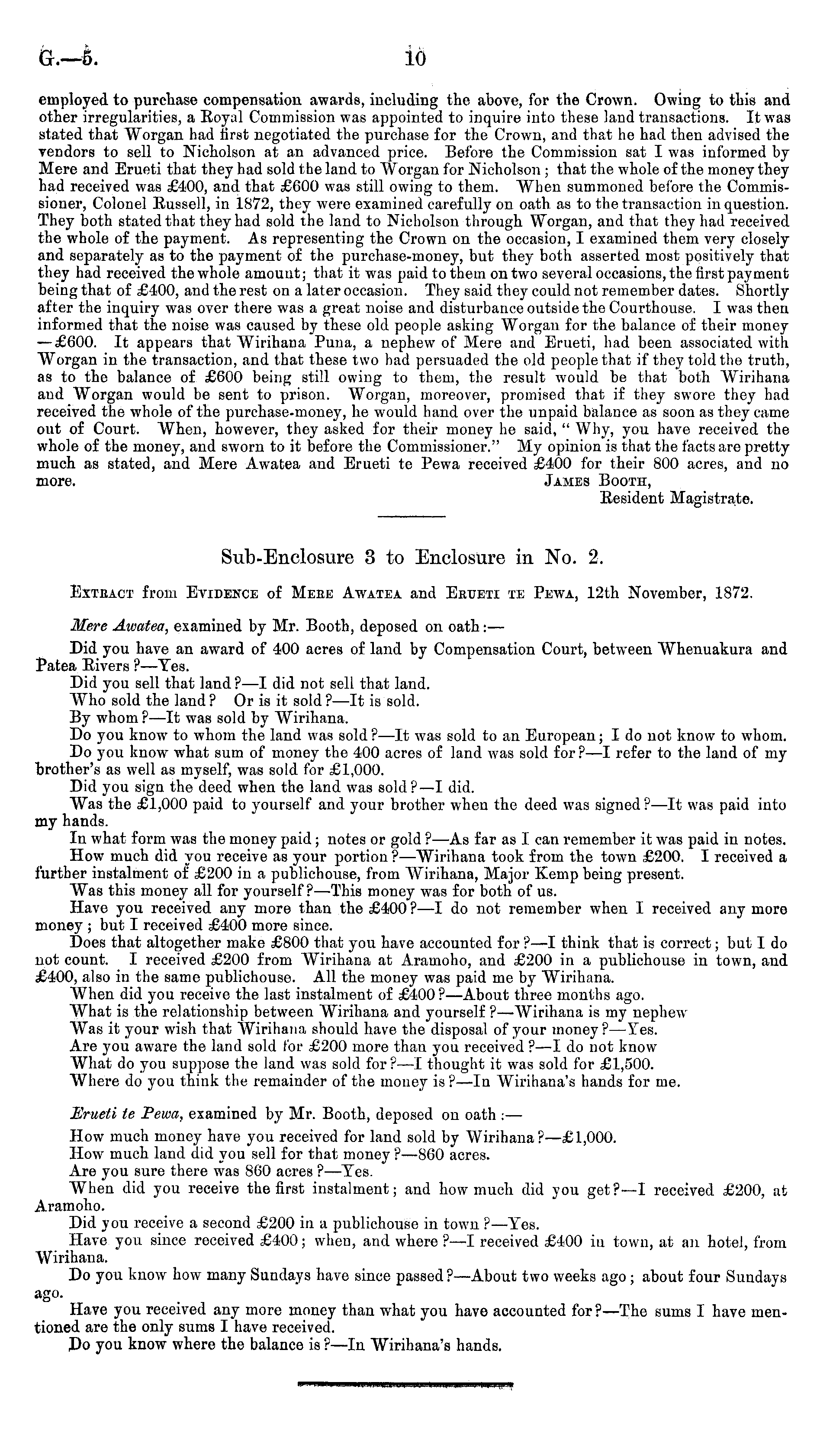 Sub-Enclosure 3 to Enclosure in No. 2. Exteact from Evidence of Mccc Awatea and Eetjeti te Pewa, 12th November, 1872. Mere Awatea, examined by Mr. Booth, deposed on oath: — Did you have an award of 400 acres of land by Compensation Court, between Whenuakura and Patea Eivers ?—Yes. Did you sell that land ? —I did not sell that land. Who sold the land ? Or is it sold ?—lt is sold. By whom ? —lt was sold by Wirihana. Do you know to whom the land was sold ?—lt was sold to an European; Ido not know to whom. Do you know what sum of money the 400 acres of land was sold for?—l refer to the land of my brother's as well as myself, was sold for £1,000. Did you sign the deed when the land was sold? —I did. Was the £1,000 paid to yourself and your brother when the deed was signed? —It was paid into my hands. In what form was the money paid ; notes or gold ?—As far as I can remember it was paid in notes. How much did you receive as your portion ? —Wirihana took from the town £200. I received a further instalment of £200 in a publichouse, from Wirihana, Major Kemp being present. Was this money all for yourself?— This money was for both of us. Have you received any more than the £400 ? —I do not remember when I received any more money ; but I received £400 more since. Does that altogether make £800 that you have accounted for ? —I think that is correct; but Ido not count. I received £200 from Wirihana at Aratnoho, and £200 in a publichouse in town, and £400, also in the same publichouse. All the money was paid me by Wirihana. When did you receive the last instalment of £400?— About three months ago. What is the relationship between Wirihana and yourself ?—Wirihana is my nephew Was it your wish that Wirihana should have the disposal of your money?— Yes. Are you aware the land sold for £200 more than you received ?—1 do not know What do you suppose the land was sold for ? —I thought it was sold for £1,500. Where do you think the remainder of the money is ?—ln Wirihana's hands for me. Erueti te Pewa, examined by Mr. Booth, deposed on oath : — How much money have you received for land sold by Wirihana?—£l,ooo. How much land did you sell for that money ? —B6O acres. Are you sure there was 860 acres ?—Yes. When did you receive the first instalment; and how much did you get?—l received £200, at Aramoho. Did you receive a second £200 in a publichouse in town ?—Yes. Have you since received £400; when, and where ? —I received £400 in town, at an hotel, from Wirihana. Do you know how many Sundays have since passed? —About two weeks ago; about four Sundays ago. Have you received any more money than what you have accounted for?— The sums I have mentioned are the only sums I have received. Do you know where the balance is ?—ln Wirihana's hands.