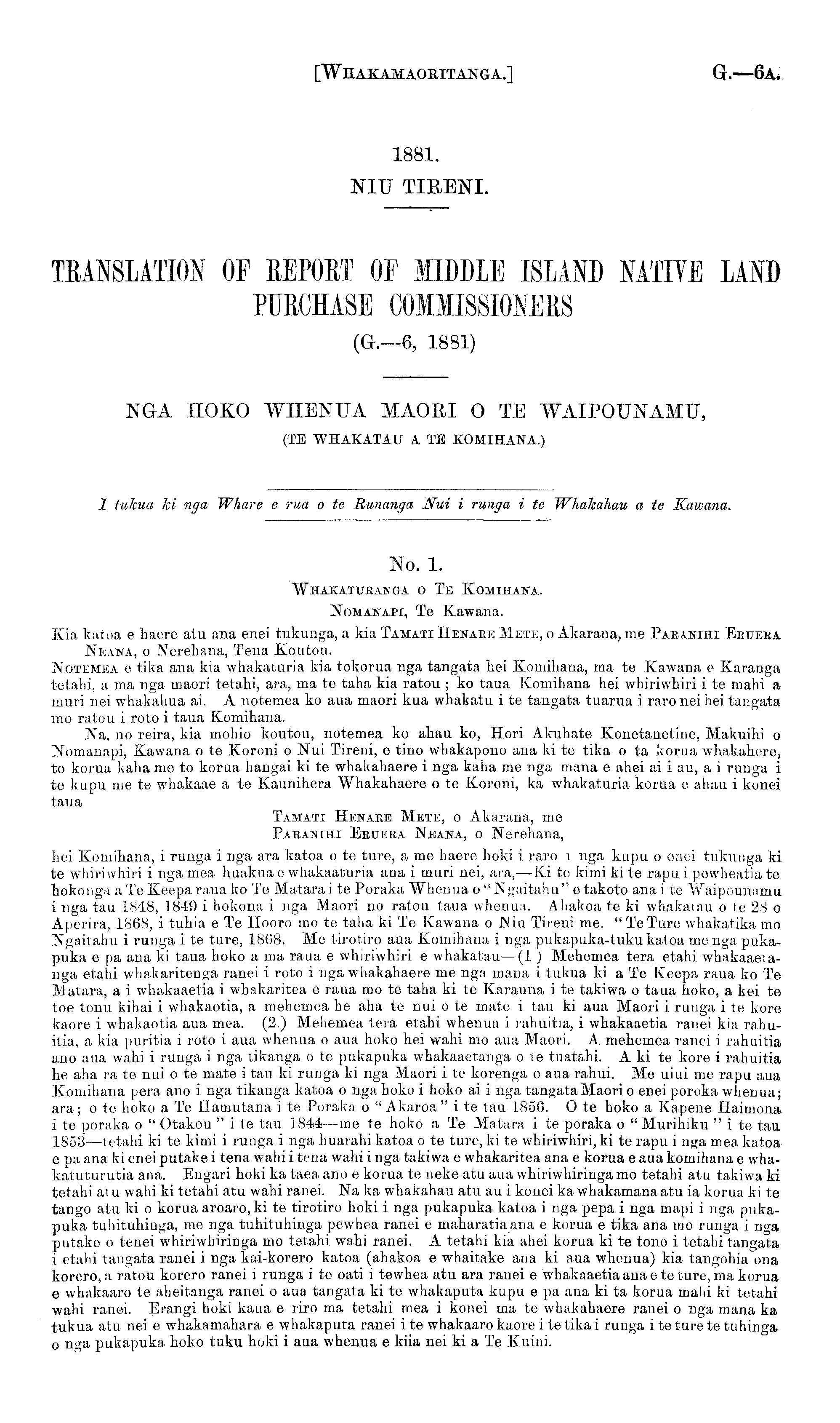 No. 1. Whakatueanga o Te Komihana. Nomanapi, Te Kawana. Kia katoa c haere atu ana enei tukunga, a kia Tasiati Henaee Mete, o Akaraua, me Paranthi Eeiteea. Neana, o Nerehana, Tena Koutou. Notemea c tika ana kia whakaturia kia tokorua nga tangata hei Koinihana, ma te Kawana c Karanga tetahi, a ma nga maori tetahi, ara, ma te taha kia ratou ; ko taua Koinihana hei whiriwhiri i te mahi a muri nei whakahua ai. A notemea ko aua maori kua whakatu ite tangata tuarua i raroneihei tangata mo ratou i roto i taua Komihana. Na, no reira, kia mohio koutou, notemea ko ahau ko, Hori Akuhate Konetauetine, Makuihi o JSTomanapi, Kawana o te Koroni o Nui Tireui, c tino whakapono ana kite tika o ta kortia whakahere, to korua kaha me to korua hangai kite whakahaere i nga kaha me nga mana c ahei ai i au, a i runga i te kupu me te whakaae a te Kaunihera Whakahaere o te Koroni, ka whakaturia korua c ahau i konei taua Tamati Henaee Mete, o Akarana, me Pakanihi Ebueea Neana, o Nerehana, hei Koniihana, i runga i nga ara katoa o te ture, a me haere hoki i raro i nga kupu o enei tukunga ki te whiriwhiri i nga rnea huakua c whakaaturia ana i muri nei, ara,—Ki te kimi kite rapu i pewheatia te hokongaaTeKeepara.ua ko Te Matarai te Poraka Whenua o"Ngaitahu" etakoto ana i te Waipounamu i nga tau 1848, 1849 i hokona i nga Maori no ratou taua whenua. Ahakoa te ki whakalau ote2B o Aperira, 1868, i tuhia c Te Hooro mo te taha ki Te Kawana o JNiu Tireni me. " TeTure whakatika mo Ngaitahu i runga ite ture, 1868. Me tirotiro aua Komihana i nga pukapuka-tuku katoa me nga pukapuka c pa ana ki taua hoko a ma raua c whiriwhiri c whakatau—(l) Mehemea tera etahi whakaaetanga etahi whakaritenga ranei i roto i nga whakahaere me nga mana i tukua ki a Te Keepa raua ko Te Matara, a i whakaaetia i whakaritea c raua mo te taha kite Karauna i te takiwa o taua hoko, a kei te toe tonu kihai i whakaotia, a mehemea he aha te nui o te mate i tau ki aua Maori i runga i te kore kaore i whakaotia aua mea. (2.) Mehemea tera etahi whenua i rahuitia, i whakaaetia ranei kia rahuitia, a kia puritia i roto i aua whenua o aua hoko hei wahi mo aua Maori. A mehemea ranei i rahuitia ano aua wahi i runga i nga tikanga ote pukapuka whakaaetanga oxe tuatahi. Aki te kore i rahuitia he aha rate nui ote mate i tau ki runga ki nga Maori ite korenga o aua rahui. Me uiui me rapu aua Komihana pera ano i nga tikanga katoa o nga hoko i hoko ai i nga tangata Maori o enei poroka whenua; ara; ote hoko aTe Hamutana ite Poraka o " Akaroa "i te tau 1856. ote hoko a Kapene Haimona i te poraka o " Otakou " i te tau 1844 —me te hoko a Te Matara i te poraka o "Murihiku " i te tau 1853 —tetahi kite kimi i runga i nga huarahi katoa o te ture, kite whiriwhiri, kite rapu i nga mea katoa c pa ana ki enei putake i tena wahi i tena wahi i nga takiwa c whakaritea ana c korua c auakomihana c whakatuturutia ana. Engari hoki ka taea ano c korua te neke atu aua whiriwhiringa mo tetahi atu takiwa ki tetahi am wahi ki tetahi atu wahi ranei. Na ka whakahau atu au i konei ka whakamana atu ia korua kite tango atu ki o korua aroaro, kite tirotiro hoki i nga pukapuka katoa i nga pepa i nga mapi i nga pukapuka tuhituhinga, me nga tuhituhinga pewhea ranei c maharatia ana c korua c tika ana mo runga i nga putake o tenei whiriwhiringa mo tetahi wahi ranei. A tetahi kia ahei korua kite tono i tetahi tangata i etahi tangata ranei i nga kai-korero katoa (ahakoa c whaitake ana ki aua whenua) kia tangohia ona korero, a ratou korero ranei i runga i te oati i tewhea atu ara ranei c whakaaetia ana c te ture, ma korua c whakaaro te aheitanga ranei o aua tangata kite whakaputa kupu c pa ana ki ta korua mahi ki tetahi wahi ranei. Erangi hoki kaua c riro ma tetahi mea i konei ma te whakahaere rauei o nga inana ka tukua atu nei c whakamahara c whakaputa ranei i te whakaaro kaore i te tika i runga i te ture te tuhinga o nga pukapuka hoko tuku hoki i aua whenua c kiia nei ki a Te Kuini.