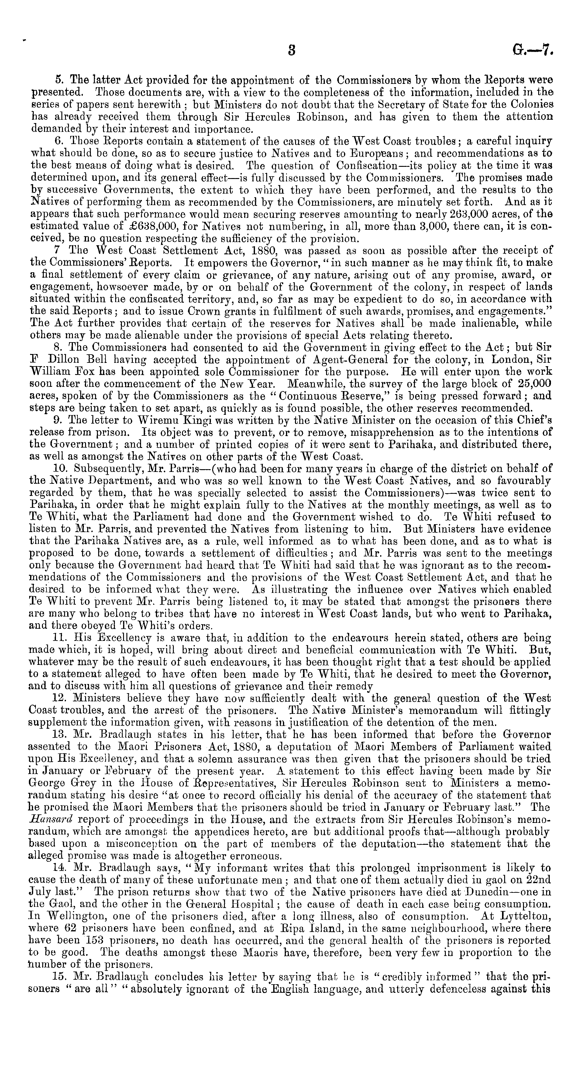 5. The latter Act provided for the appointment of the Commissioners by whom the Reports were presented. Those documents are, with a view to the completeness of the information, included in the series of papers sent herewith ; but Ministers do not doubt that the Secretary of State for the Colonies has already received them through Sir Hercules Robinson, and has given to them the attention demanded by their interest and importance. 6. Those Reports contain a statement of the causes of the West Coast troubles ; a careful inquiry what should be done, so as to secure justice to Natives and to Europeans; and recommendations as to the best means of doing what is desired. The question of Confiscation—its policy at the time it was determined upon, and its general efi'ect —is fully discussed by the Commissioners. The promises made by successive Governments, the extent to which they have been performed, and the results to the Natives of performing them as recommended by the Commissioners, are minutely set forth. And as it appears that such performance would mean securing reserves amounting to nearly 263,000 acres, of the estimated value of £638,000. for Natives not numbering, in all, more than 3,000, there can, it is conceived, be no question respecting the sufficiency of the provision. 7 The West Coast Settlement Act, 1880, was passed as soon as possible after the receipt of the Commissioners' Reports. It empowers the Governor, "in such manner as he may think fit, to make a final settlement of every claim or grievance, of any nature, arising out of any promise, award, or engagement, howsoever made, by or on behalf of the Government of the colony, in respect of lands situated within the confiscated territory, and, so far as may be expedient to do so, in accordance with the said Reports ; and to issue Crown grants in fulfilment of such awards, promises, and engagements." The Act further provides that certain of the reserves for Natives shall be made inalienable, while others may be made alienable under the provisions of special Acts relating thereto. 8. The Commissioners had consented to aid the Government in giving effect to the Act; but Sir "F Dillon Bell having accepted the appointment of Agent-General for the colony, in London, Sir William Fox has been appointed sole Commissioner for the purpose. He will enter upon the work soon after the commencement of the New Tear. Meanwhile, the survey of the large block of 25,000 acres, spoken of by the Commissioners as the " Continuous Reserve," is being pressed forward; and. steps are being taken to set apart, as quickly as is found possible, the other reserves recommended. 9. The letter to Wiremu Kingi was written by the Native Minister on the occasion of this Chief's release from prison. Its object was to prevent, or to remove, misapprehension as to the intentions of the Government; and a number of printed copies of it were sent to Parihaka, and distributed there, as well as amongst the Natives on other parts of the West Coast. 10. Subsequently, Mr. Parris—(who had been for many years in charge of the district on behalf of the Native Department, and who was so well known to the West Coast Natives, and so favourably regarded by them, that he was specially selected to assist the Commissioners) —was twice sent to Parihaka, in order that he might explain fully to the Natives at the monthly meetings, as well as to Te Whiti, what the Parliament had done and the Government wished to do. Te VVhiti refused to listen to Mr. Parris, and prevented the Natives from listening to him. But Ministers have evidence that the Parihaka Natives are, as a rule, well informed as to what has been done, and as to what is proposed to be done, towards a settlement of difficulties; and Mr. Parris was sent to the meetings only because the Government had heard that Te Whiti had said that he was ignorant as to the recommendations of the Commissioners and the provisions of the West Coast Settlement Act, and that he desired to be informed what they were. As illustrating the influence over Natives which enabled Te Whiti to prevent Mr. Parris being listened to, it may be stated that amongst the prisoners there are many who belong to tribes that have no interest in West Coast lands, but who went to Parihaka, and there obeyed Te Whiti's orders. 11. His Excellency is aware that, in addition to the endeavours herein stated, others are being made which, it is hoped, will bring about direct and beneficial communication with Te Whiti. But, whatever may be the result of such endeavours, it has been thought right that a test should be applied to a statement alleged to have often been made by Te Whiti, that he desired to meet the Governor, and to discuss with him all questions of grievance and their remedy 12. Ministers believe they have now sufficiently dealt with the general question of the West Coast troubles, and the arrest of the prisoners. The Native Minister's memorandum will fittingly supplement the information given, with reasons ia justification of the detention of the men. 13. Mr. Bradlaugh states in his letter, that he has been informed that before the Governor assented to the Maori Prisoners Act, 1880, a deputation of Maori Members of Parliament waited upon His Excellency, and that a solemn assurance was then given that the prisoners should be tried in January or February of the present year. A statement to this effect having been made by Sir George Grey in the House of Representatives, Sir Hercules Robinson sent to Ministers a memorandum stating his desire "at once to record officially his denial of the accuracy of the statement that he promised the Maori Members that the prisoners should be tried in January or February last." The Hansard report of proceedings in the House, and the extracts from Sir Hercules Robinson's memorandum, which are amongst the appendices hereto, are but additional proofs that —although probably based upon a misconception on the part of members of t
