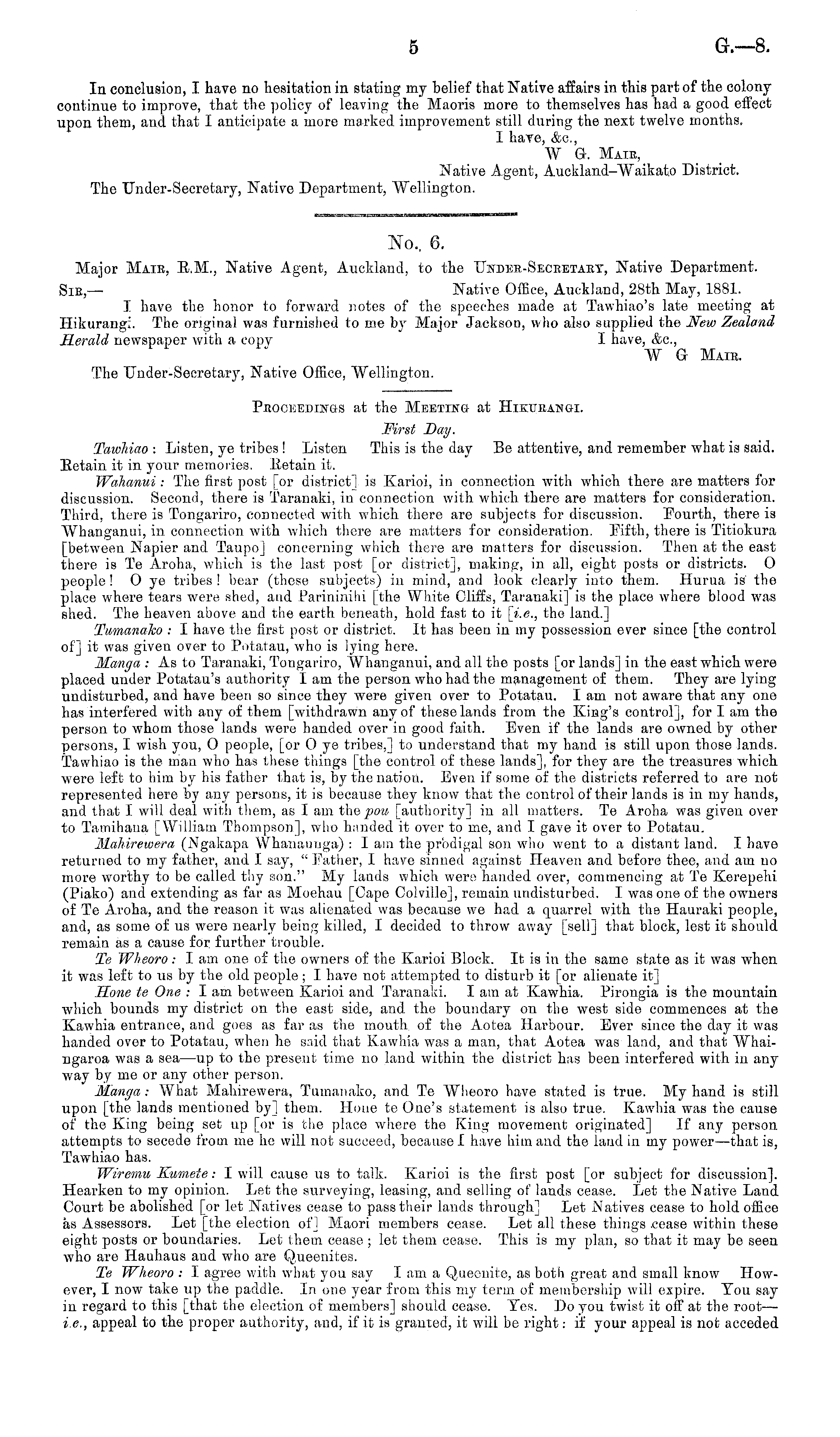 No.. 6. Major Maie, E.M., Native Agent, Auckland, to the Under-Secretary, Native Department. Sir,— Native Office, Auckland, 28th May, 1881. I have the honor to forward notes of the speeches made at Tawhiao's late meeting at Hikurang:. The original was furnished to me by Major Jackson, who also supplied the New Zealand Herald newspaper with a copy I have, &c, W G Maie. The Under-Secretary, Native Office, "Wellington.