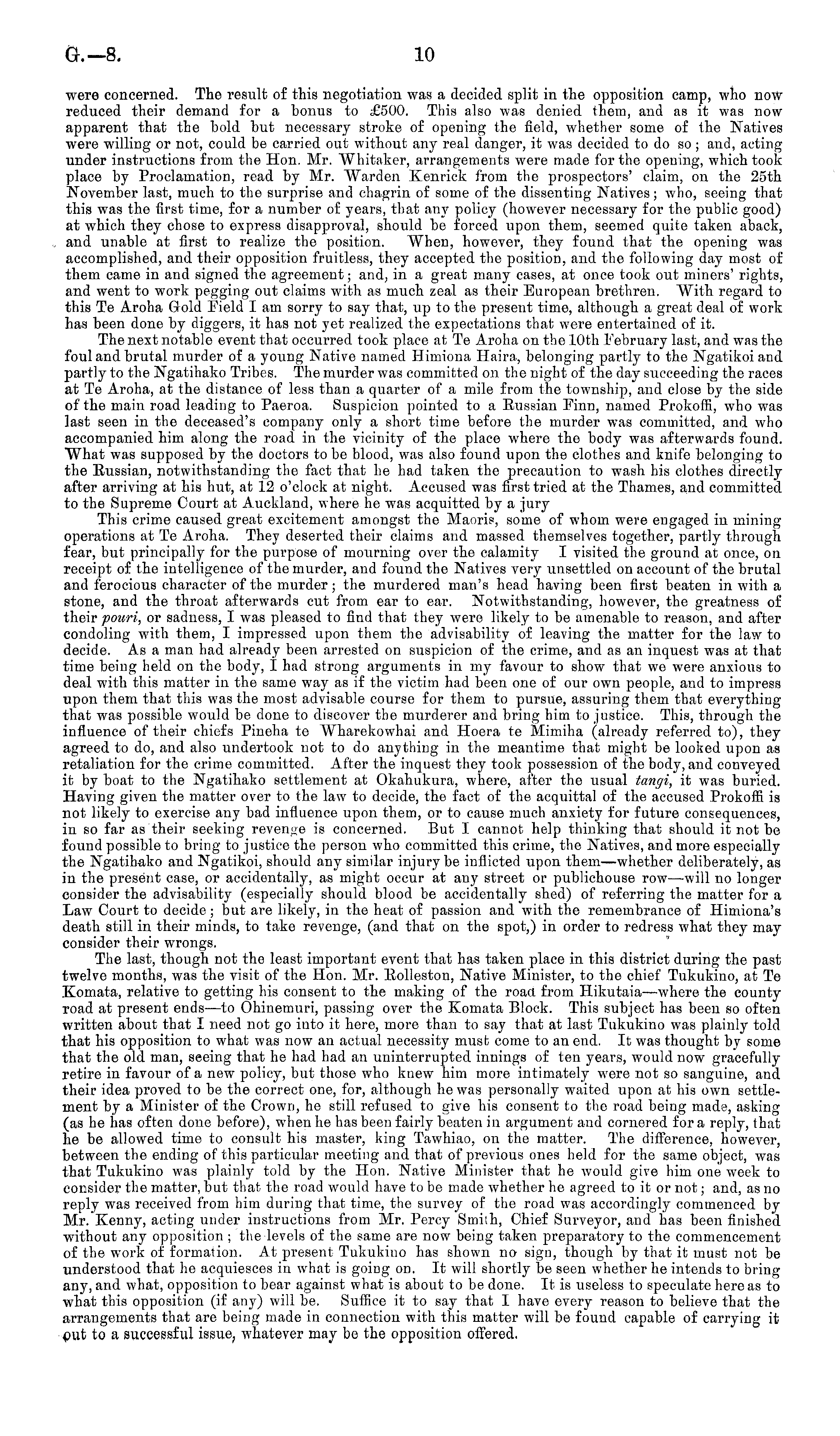were concerned. The result of this negotiation was a decided split in the opposition camp, who now reduced their demand for a bonus to £500. This also was denied them, and as it was now apparent that the bold but necessary stroke of opening the field, whether some of the Natives were willing or not, could be carried out without any real danger, it was decided to do so ; and, acting under instructions from the Hon. Mr. Whitaker, arrangements were made for the opening, which took place by Proclamation, read by Mr. Warden Kenrick from the prospectors' claim, on the 25th November last, much to the surprise and chagrin of some of the dissenting Natives; who, seeing that this was the first time, for a number of years, that any policy (however necessary for the public good) at which they chose to express disapproval, should be forced upon them, seemed quite taken aback, and unable at first to realize the position. When, however, they found that the opening was accomplished, and their opposition fruitless, they accepted the position, and the following day most of them came in and signed the agreement; and, in a great many cases, at once took out miners' rights, and went to work pegging out claims with as much zeal as their European brethren. "With regard to this Te Aroha Gold Field I am sorry to say that, up to the present time, although a great deal of work has been done by diggers, it has not yet realized the expectations that were entertained of it. The next notable event that occurred took place at Te Aroha on the 10th February last, and was the foul and brutal murder of a young Native named Hiiniona Haira, belonging partly to the Ngatikoi and partly to the Ngatihako Tribes. The murder was committed on the night of the day succeeding the races at Te Aroha, at the distance of less than a quarter of a mile from the township, and close by the side of the main road leading to Paeroa. Suspicion pointed to a Russian Finn, named Prokoffi, who was last seen in the deceased's company only a short time before the murder was committed, and who accompanied him along the road in the vicinity of the place where the body was afterwards found. What was supposed by the doctors to be blood, was also found upon the clothes and knife belonging to the Russian, notwithstanding the fact that he had taken the precaution to wash his clothes directly after arriving at his hut, at 12 o'clock at night. Accused was first tried at the Thames, and committed to the Supreme Court at Auckland, where he was acquitted by a jury This crime caused great excitement amongst the Maoris, some of whom were engaged in mining operations at Te Aroha. They deserted their claims and massed themselves together, partly through fear, but principally for the purpose of mourning over the calamity I visited the ground at once, on receipt of the intelligence of the murder, and found the Natives very unsettled on account of the brutal and ferocious character of the murder; the murdered man's head having been first beaten in with a stone, and the throat afterwards cut from ear to ear. Notwithstanding, however, the greatness of their potiri, or sadness, I was pleased to find that they were likely to be amenable to reason, and after condoling with them, I impressed upon them the advisability of leaving the matter for the law to decide. As a man had already been arrested on suspicion of the crime, and as an inquest was at that time being held on the body, I had strong arguments in my favour to show that we were anxious to deal with this matter in the same way as if the victim had been one of our own people, and to impress upon them that this was the most advisable course for them to pursue, assuring them that everything that was possible would be done to discover the murderer and bring him to justice. This, through the influence of their chiefs Pineha te Wharekowhai and Hoera te Mimiha (already referred to), they agreed to do, and also undertook not to do anything in the meantime that might be looked upon as retaliation for the crime committed. After the inquest they took possession of the body, and conveyed it by boat to the Ngatihako settlement at Okahukura, where, after the usual tangi, it was buried. Having given the matter over to the law to decide, the fact of the acquittal of the accused Prokoffi is not likely to exercise any bad influence upon them, or to cause much anxiety for future consequences, in so far as their seeking revenue is concerned. But I cannot help thinking that should it not be found possible to bring to justice the person who committed this crime, the Natives, and more especially the Ngatihako and Ngatikoi, should any similar injury be inflicted upon them—whether deliberately, as in the present case, or accidentally, as might occur at any street or publichouse row —-will no longer consider the advisability (especially should blood be accidentally shed) of referring the matter for a Law Court to decide; but are likely, in the heat of passion and with the remembrance of Himiona's death still in their minds, to take revenge, (and that on the spot,) in order to redress what they may consider their wrongs. The last, though not the least important event that has taken place in this district during the past twelve months, was the visit of the Hon. Mr. Rolleston, Native Minister, to the chief Tukukino, at Te Komata, relative to getting his consent to the making of the road, from Hikutaia—where the county road at present ends —to Ohinemuri, passing over the Komata Block. This subject has been so often written about that I need not go into it here, more than to say that at last Tukukino was plainly told that his opposition to what was now an actual necessity must come to an end. It was thought by some that the old. man, seeing that he had had an uninterrupted innings of ten years, would now gracefully retire in favour of a new policy, but those who knew him more intimately were not so sanguine, and their idea proved to be the