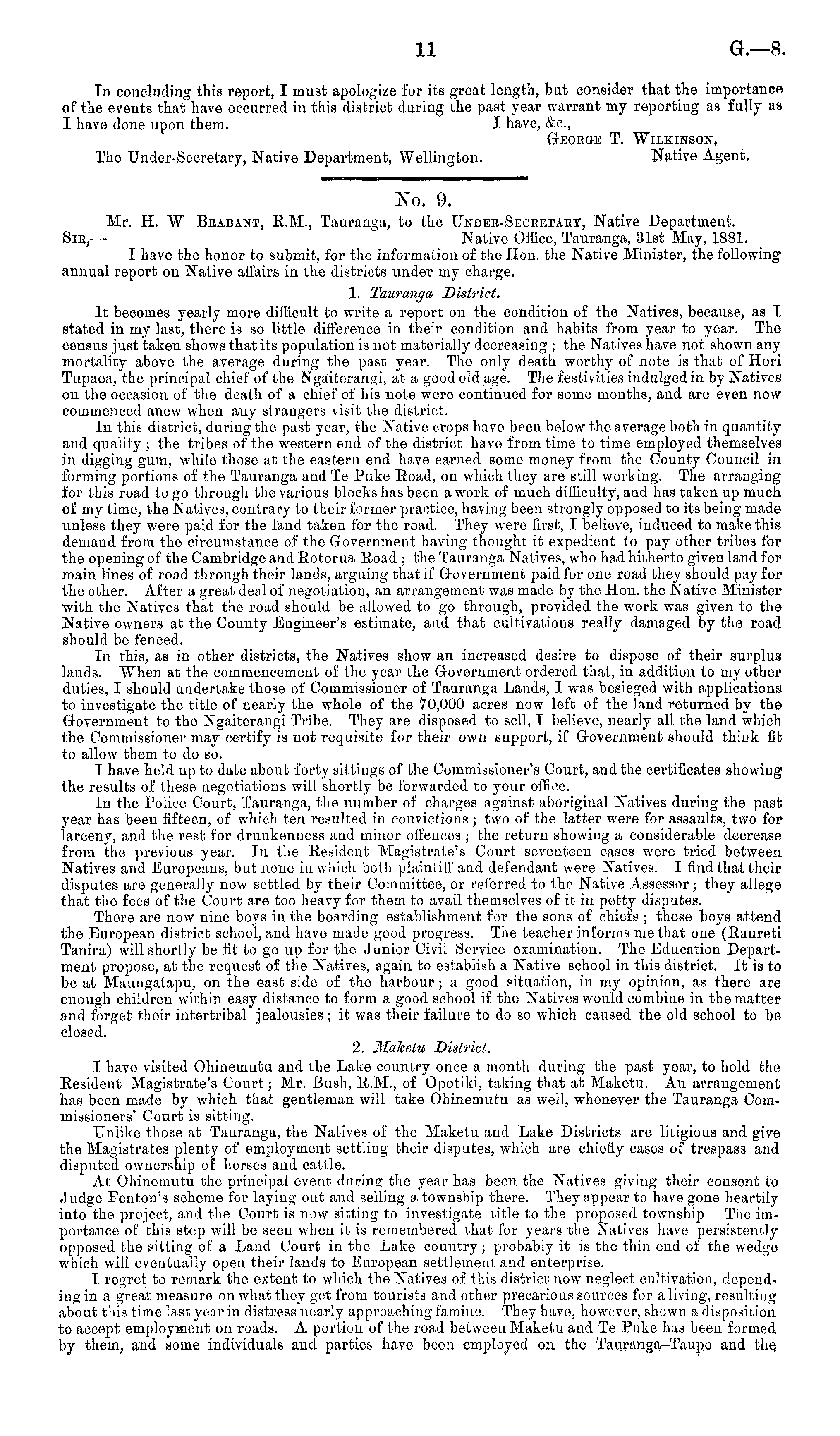 No. 9. Mr. H. W Beabant, R.M., Tauranga, to the Undee-Seceetaey, Native Department. Sib,— Native Office, Tauranga, 31st May, 1881. I have the honor to submit, for the information of the Hon. the Native Minister, the following annual report on Native affairs in the districts under my charge. 1. Tauranga District. It becomes yearly more difficult to write a report on the condition of the Natives, because, as I stated in my last, there is so little difference in their condition and habits from year to year. The census just taken shows that its population is not materially decreasing ; the Natives have not shown any mortality above the average during the past year. The only death worthy of note is that of Hori Tupaea, the principal chief of the Ngaiteranai, at a good old age. The festivities indulged in by Natives on the occasion of the death of a chief of his note were continued for some months, and are even now commenced anew when any strangers visit the district. In this district, during the past year, the Native crops have been below the average both in quantity and quality ; the tribes of the western end of the district have from time to time employed themselves in digging gum, while those at the eastern end have earned some money from the County Council in forming portions of the Tauranga and Te Puke Road, on which they are still working. The arranging for this road to go through the various blocks has been a work of much difficulty, and has taken up much of my time, the Natives, contrary to their former practice, having been strongly opposed to its being made unless they were paid for the land taken for the road. They were first, I believe, induced to make this demand from the circumstance of the Government having thought it expedient to pay other tribes for the opening of the Cambridge and Rotorua Eoad ; the Tauranga Natives, who had hitherto given land for main lines of road through their lands, arguing that if Government paid for one road they should pay for the other. After a great deal of negotiation, an arrangement was made by the Hon. the Native Minister with the Natives that the road should be allowed to go through, provided the work was given to the Native owners at the County Engineer's estimate, and that cultivations really damaged by the road should be fenced. In this, as in other districts, the Natives show an increased desire to dispose of their surplus lands. When at the commencement of the year the Government ordered that, in addition to my other duties, I should undertake those of Commissioner of Tauranga Lands, I was besieged with applications to investigate the title of nearly the whole of the 70,000 acres now left of the land returned by the Government to the Ngaiterangi Tribe. They are disposed to sell, I believe, nearly all the land which the Commissioner may certify is not requisite for their own support, if Government should think fit to allow them to do so. I have held up to date about forty sittings of the Commissioner's Court, and the certificates showing the results of these negotiations will shortly be forwarded to your office. In the Police Court, Tauranga, the number of charges against aboriginal Natives during the past year has been fifteen, of which ten resulted in convictions ; two of the latter were for assaults, two for larceny, and the rest for drunkenness and minor offences ; the return showing a considerable decrease from the previous year. In the Resident Magistrate's Court seventeen cases were tried between Natives and Europeans, but none in which both plaintiff and defendant were Natives. I find that their disputes are generally now settled by their Committee, or referred to the Native Assessor; they allege that the fees of the Court are too heavy for them to avail themselves of it in petty disputes. There are now nine boys in the boarding establishment for the sons of chiefs ; these boys attend the European district school, and have made good progress. The teacher informs me that one (Raureti Tanira) will shortly be fit to go up for the Junior Civil Service examination. The Education Depart, ment propose, at the request of the Natives, again to establish a Native school in this district. It is to be at Maungatapu, on the east side of the harbour; a good situation, in my opinion, as there are enough children within easy distance to form a good school if the Natives would combine in the matter and forget their intertribal jealousies ; it was their failure to do so which caused the old school to be closed. 2. Maketu District. I have visited Ohinemutu and the Lake country once a month during the past year, to hold the Resident Magistrate's Court; Mr. Bush, R.M., of Opotiki, taking that at Maketu. An arrangement has been made by which that gentleman will take Ohinemutu as well, whenever the Tauranga Commissioners' Court is sitting. Unlike those at Tauranga, the Natives of the Maketu and Lake Districts are litigious and give the Magistrates plenty of employment settling their disputes, which are chiefly cases of trespass and disputed ownership of horses and cattle. At Ohinemutu the principal event during the year has been the Natives giving their consent to Judge Fenton's scheme for laying out and selling a, township there. They appear to have gone heartily into the project, and the Court is now sitting to investigate title to the proposed township. The importance of this step will be seen when it is remembered that for years the Natives have persistently opposed the sitting of a Land Court in the Lake country; probably it is the thin end of the wedge which will eventually open their lands to European settlement and enterprise. I regret to remark the extent to which the Natives of this district now neglect cultivation, depending in a great measure on what they get from tourists and other precarious sources for a living, resulting about this time last year in distress nearly approaching famino. They have, however, shown a disposition to accept emp