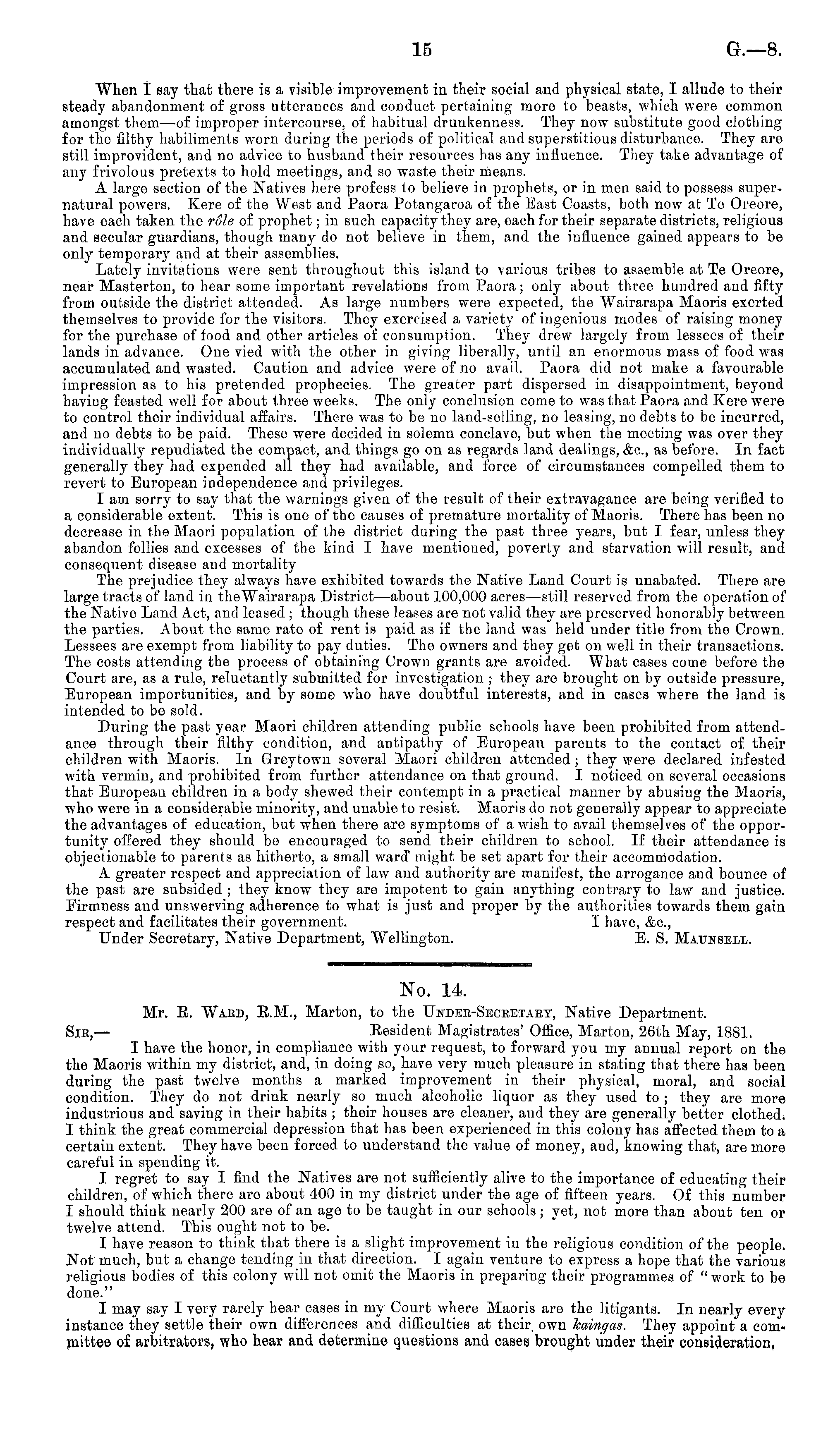 No. 14. Mr. E. Ward, E,M., Marton, to the ITfdek-Seceetaey, Native Department. Sib,— Resident Magistrates' Office, Marton, 26th May, 1881. I have the honor, in compliance with your request, to forward you my annual report on the the Maoris within my district, and, in doing so, have very much pleasure in stating that there has been during the past twelve months a marked improvement in their physical, moral, and social condition. They do not drink nearly so much alcoholic liquor as they used to ; they are more industrious and saving in their habits ; their houses are cleaner, and they are generally better clothed. I think the great commercial depression that has been experienced in this colony has affected them to a certain extent. They have been forced to understand the value of money, and, knowing that, are more careful in spending it. I regret to say I find the Natives are not sufficiently alive to the importance of educating their children, of which there are about 400 in my district under the age of fifteen years. Of this number I should think nearly 200 are of an age to be taught in our schools ; yet, not more than about ten or twelve attend. This ought not to be. I have reason to think that there is a slight improvement in the religious condition of the people. Not much, but a change tending in that direction. I again venture to express a hope that the various religious bodies of this colony will not omit the Maoris in prejiaring their programmes of " work to be done." I may say I very rarely hear cases in my Court where Maoris are the litigants. In nearly every instance they settle their own differences and difficulties at their own Icainqas. They appoint a committee of arbitrators, who hear and determine questions and cases brought under their consideration,