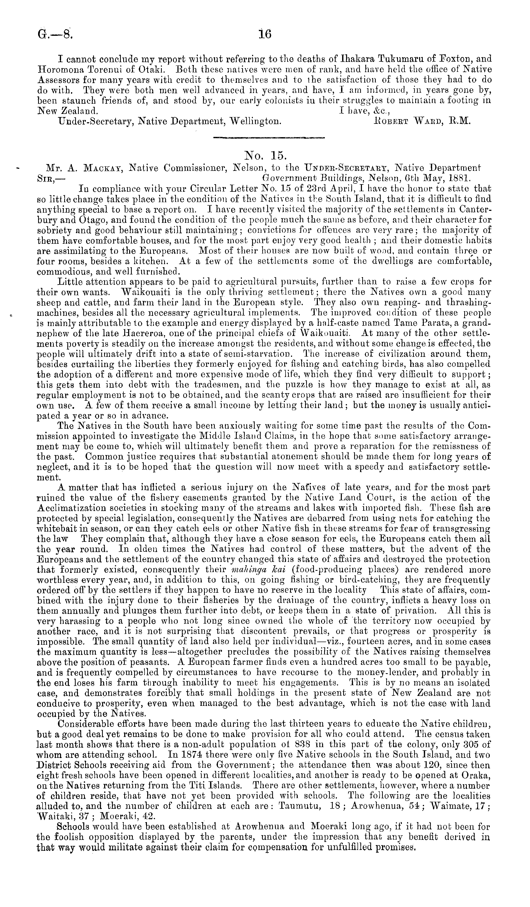 No. 15. Mr. A. Mackat, Native Commissioner, Nelson, to the Undeb-Secketaey, Native Department Sir, — Government Buildings, Nelson, 6th May, 1881. In compliance with your Circular Letter No. 15 of 23rd April, I have the honor to state that so little change takes place in the condition of the Natives in the South Island, that it is difficult to find anything special to base a report on. I have recently visited the majority of the settlements in Canterbury and Otago, and found the condition of the people much the same as before, and their character for sobriety and good behaviour still maintaining; convictions for offences are very rare; the majority of them have comfortable houses, and for the most part enjoy very good health ; and their domestic habits are assimilating to the Europeans. Most of their houses are now built of wood, and contain three or four rooms, besides a kitchen. At a few of the settlements some of tho dwellings are comfortable, commodious, and well furnished. Little attention appears to be paid to agricultural pursuits, further than to raise a few crops for their own wants. Waikouaiti is the only thriving settlement; there the Natives own a good many sheep and cattle, and farm their land in the European style. They also own reaping- and thrashingmachines, besides all the necessary agricultural implements. The improved condition of these people is mainly attributable to the example and energy displayed by a half-caste named Tame Parata, a grandnephew of the late Haereroa, one of the principal chiefs of Waikouaiti. At many of the other settlements poverty is steadily on the increase amongst the residents, and without some change is effected, the people will ultimately drift into a state of semi-starvation. The increase of civilization around them, besides curtailing the liberties they formerly enjoyed for fishing and catching birds, has also compelled the adoption of a different and more expensive mode of life, which they find very difficult to support; this gets them into debt with the tradesmen, and the puzzle is how they manage to exist at all, as regular employment is not to be obtained, and the scanty crops that are raised are insufficient for their own use. A few of them receive a small income by letting their land; but the money is usually anticipated a year or so in advance. The Natives in the South have been anxiously waiting for some time past the results of the Commission appointed to investigate the Middle Island Claims, in the hope that some satisfactory arrangement may be come to, which will ultimately benefit them and prove a reparation for the rcmissness of the past. Common justice requires that substantial atonement should be made them for long years of neglect, and it is to be hoped that the question will now meet with a speedy and satisfactory settlement. A matter that has inflicted a serious injury on the Natives of late years, and for the most part ruined the value of the fishery easements granted by the Native Land Court, is the action of the Acclimatization societies in stocking many of the streams and lakes with imported fish. These fish are protected by special legislation, consequently the Natives are debarred from using nets for catching the whitebait in season, or can they catch eels or other Native fish in these streams for fear of transgressing the law They complain that, although they have a close season for eels, the Europeans catch them all the year round. In olden times the Natives had control of these matters, but the advent of the Europeans and the settlement of the country changed this state of affairs and destroyed the protection that formerly existed, consequently their mahinga Teai (food-producing places) are rendered more worthless every year, and, in addition to this, on going fishing or bird-catching, they are frequently ordered off by the settlers if they happen to have no reserve in the locality This state of affairs, combined with the injury done to their fisheries by the drainage of the country, inflicts a heavy loss on them annually and plunges them further into debt, or keeps them in a state of privation. All this is very harassing to a people who not long since owned the whole of the territory now occupied by another race, and it is not surprising that discontent prevails, or that progress or prosperity is impossible. The small quantity of land also held per individual —viz., fourteen acres, and in some eases the maximum quantity is less—altogether precludes the possibility of the Natives raising themselves above the position of peasants. A European farmer finds even a hundred acres too small to be payable, and is frequently compelled by circumstances to have recourse to the money-lender, and probably in the end loses his farm through inability to meet his engagements. This is by no means an isolated case, and demonstrates forcibly that small holdings in the present state of New Zealand are not conducive to prosperity, even when managed to the best advantage, which is not the case with land occupied by the Natives. Considerable efforts have been made during the last thirteen years to educate the Native children, but a good deal yet remains to be done to make provision for all who could attend. The census taken last month shows that there is a non-adult population ol 838 in this part of the colony, only 305 of whom are attending school. In 1874 there were only five Native schools in the South Island, and two District Schools receiving aid from the Government; tho attendance then was about 120, since then eight fresh schools have been opened in different localities, and another is ready to be opened at Oraka, on the Natives returning from the Titi Islands. There are other settlements, however, where a number of children reside, that have not yet been provided with schools. Tho following are the localities alluded to, and the number of children at each are : Taumutu, 18 ; Arowhenua, 54 ; "Waimate, 17; Waitaki, 37 ; Moer