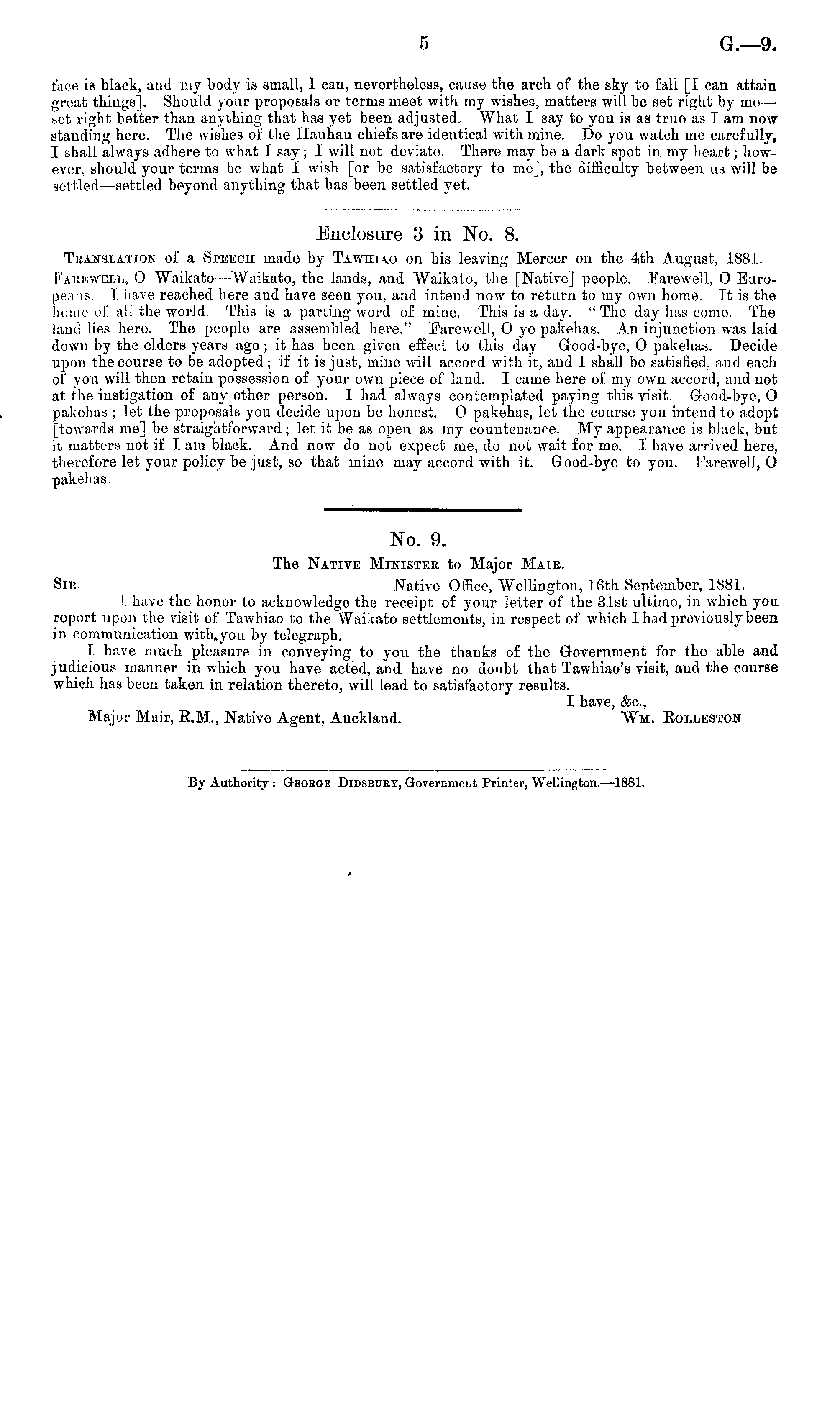 No. 9. The Native Minister to Major Mair. Sir,— Native Office, Wellington, 16th September, 1881. 1 have the honor to acknowledge the receipt of your letter of the 31st ultimo, in which you report upon the visit of Tawhiao to the Waikato settlements, in respect of which I had previously been in communication with,you by telegraph. I have much pleasure in conveying to you the thanks of the Government for the able and judicious manner in which you have acted, and have no doubt that Tawhiao's visit, and the course which has been taken in relation thereto, will lead to satisfactory results. I have, &c, Major Mair, R.M., Native Agent, Auckland. Wm. Rolleston
