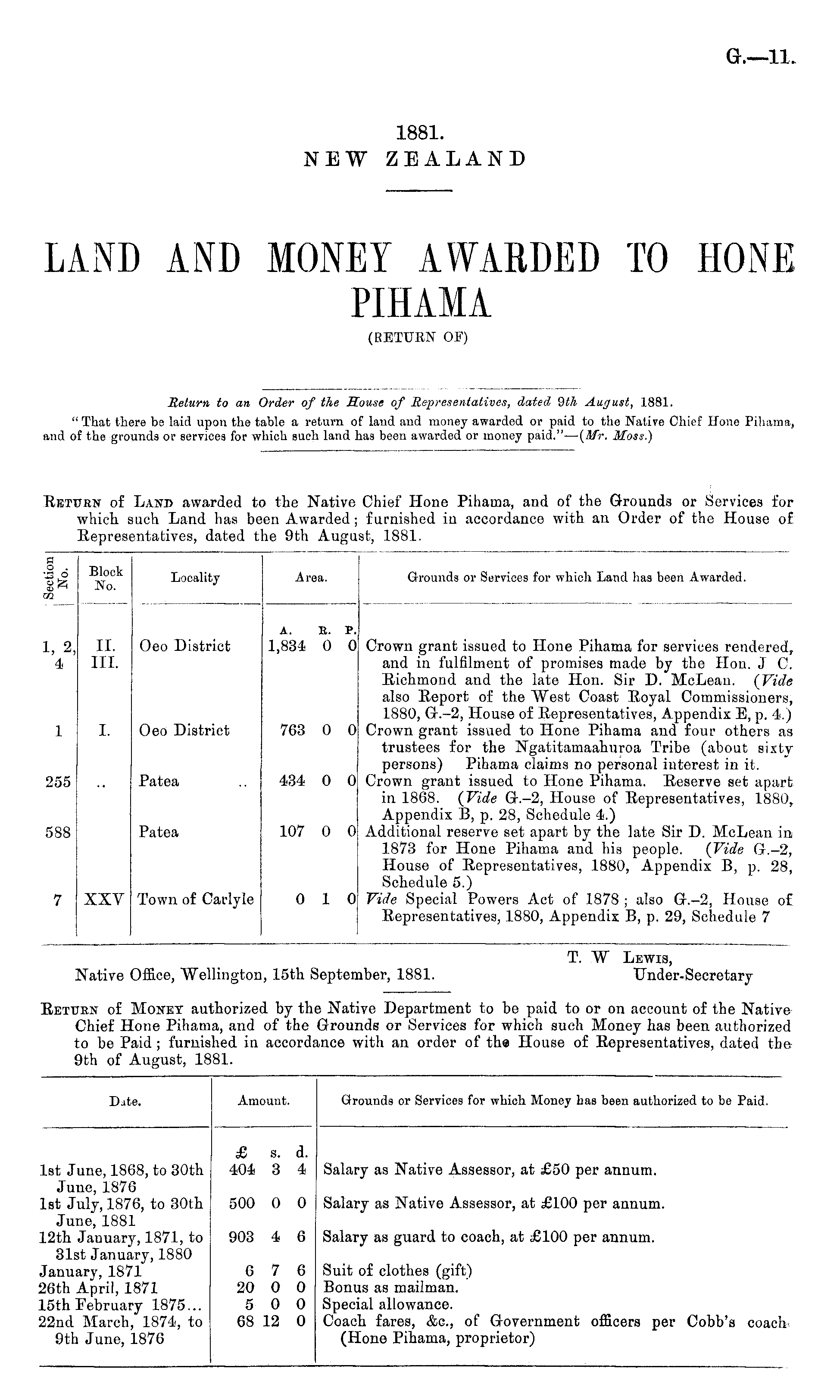 Return of Money authorized by the Native Department to be paid to or on account of the Native Chief Hone Pihama, and of the Grounds or Services for which such Money has been authorized to be Paid; furnished in accordance with an order of the House of Representatives, dated the 9th of August, 1881.