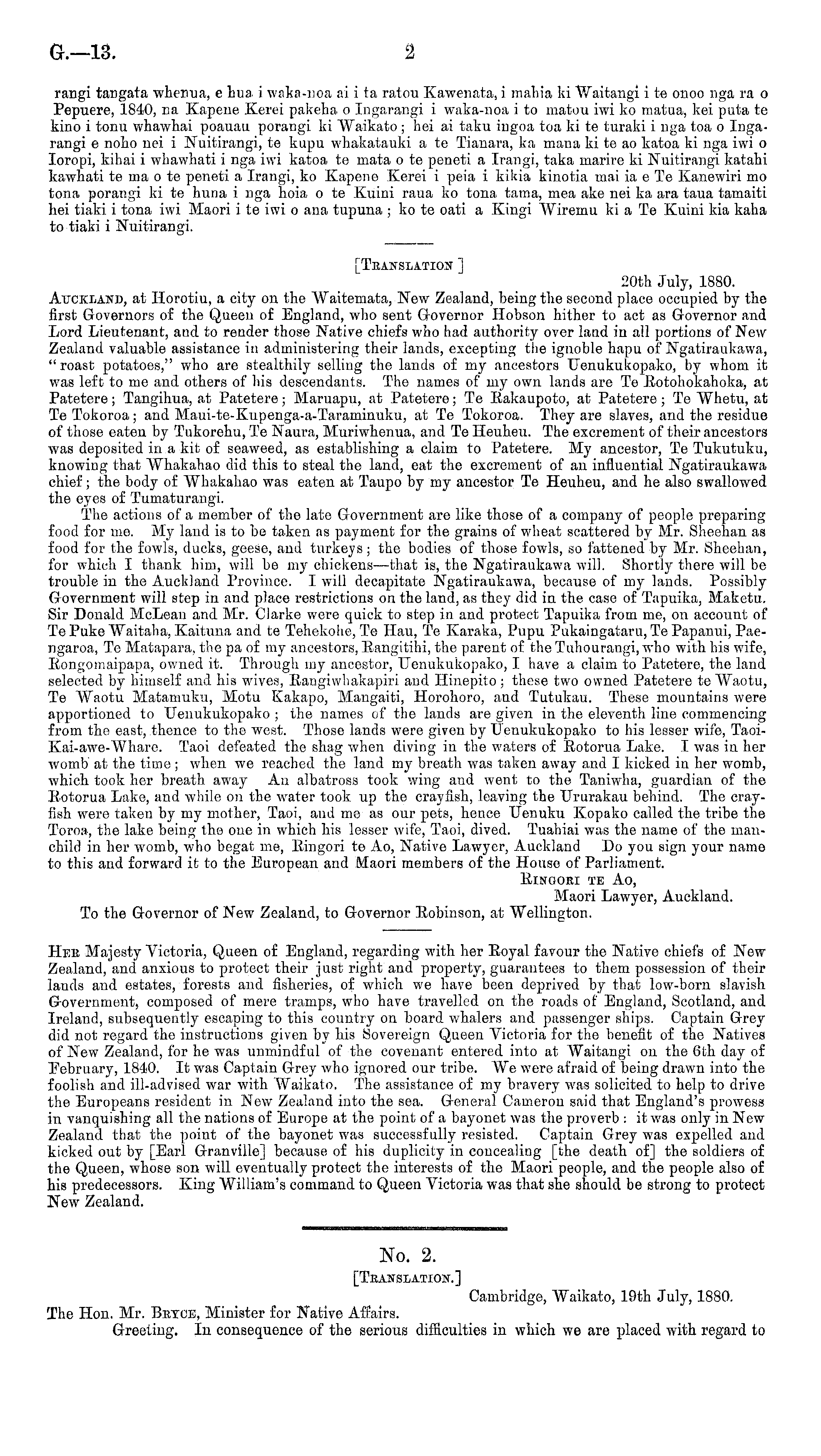 No. 2. [Translation.] Cambridge, Waikato, 19th July, 1880. The Hon. Mr. Bryce, Minister for Native Affairs. Greeting. In consequence of the serious difficulties in which we are placed with regard to