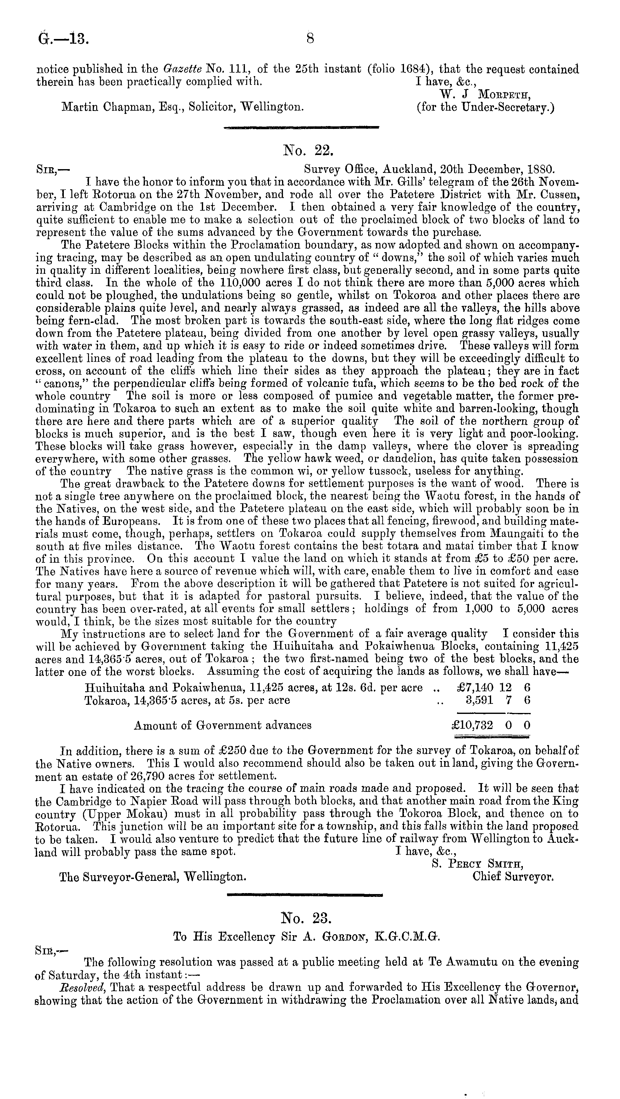 No. 23. To His Excellency Sir A. Gordon, KG.C.M.G. Sie,— The following resolution was passed at a public meeting held at Te Awamutu on the evening of Saturday, the 4th instant :— Resolved, That a respectful address be drawn up and forwarded to His Excellency the Governor, showing that the action of the Government in withdrawing the Proclamation over all Native lands, and