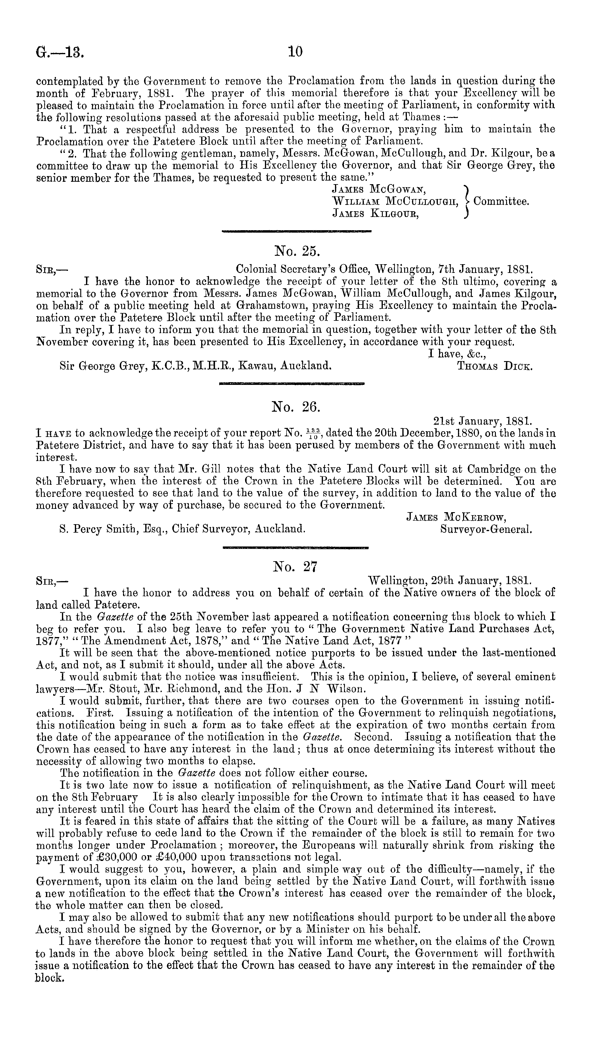 No. 25. Sie, — Colonial Secretary's Office, Wellington, 7th January, 1881. I have the honor to acknowledge the receipt of your letter of the Bth ultimo, covering a memorial to the Governor from Messrs. James McGowan, William McCullough, and James Kilgour, on behalf of a public meeting held at Grahamstown, praying His Excellency to maintain the Proclamation over the Patetere Block until after the meeting of Parliament. In reply, I have to inform you that the memorial in question, together with your letter of the Bth November covering it, has been presented to His Excellency, in accordance with your request. I have, &c, Sir George Grey, K.C.8.,M.H.E., Kawau, Auckland, Thomas Dick.