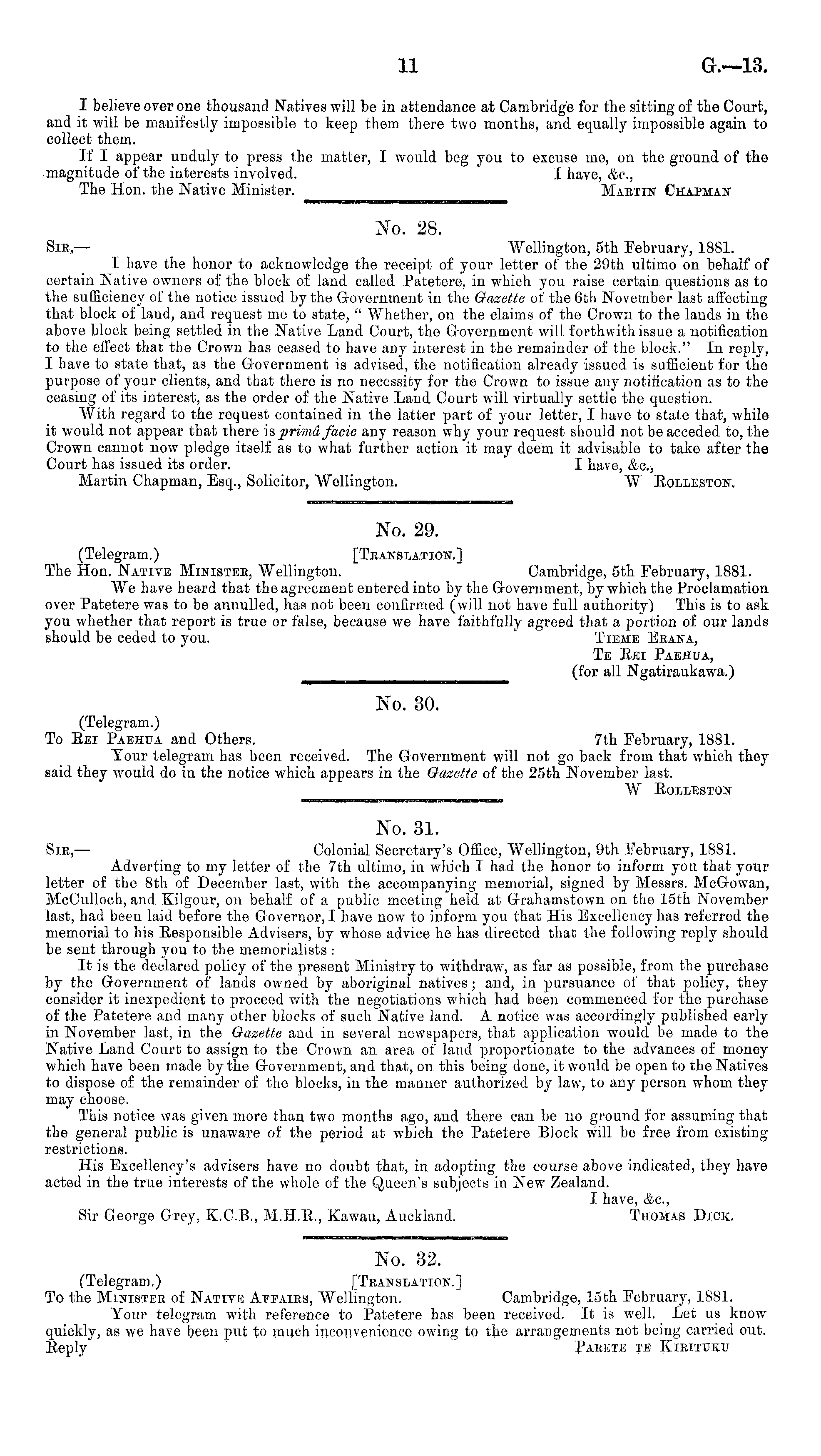 No. 32. (Telegram.) [Translation.] To the Minister of Native Affairs, Wellington. Cambridge, 15th February, 1881. Your telegram with reference to Patetere has been received. It is well. Let us know quickly, as we have been put to much inconvenience owing to the arrangements not being carried out. Eeply* Parete te Kirituku