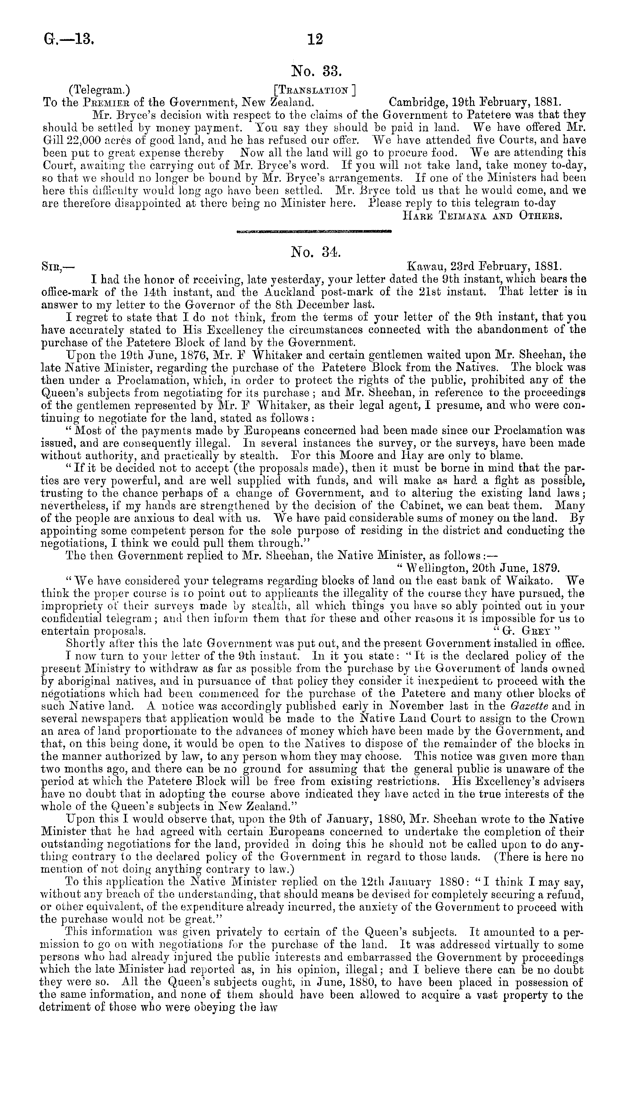 No. 33. (Telegram.) [Translation ] To the Premier of the Government, New Zealand. Cambridge, 19th February, 1881. Mr. Bryce's decision with respect to the claims of the Government to Patetere was that they should be settled by money payment. Tou say they should be paid in land. We have offered Mr. Gill 22,000 acres of good land, and he has refused our offer. We have attended five Courts, and have been put to great expense thereby Now all the land will go to procure food. We are attending this Court, awaiting the carrying out of Mr. Bryce's word. If you will not take land, take money to-day, so that we should no longer be bound by Mr. Bryce's arrangements. If one of the Ministers had been here this difficulty would long ago have been settled. Mr. Bryce told us that he would come, and we are therefore disappointed at there being no Minister here. Please reply to this telegram to-day Hare Teimana and Others.