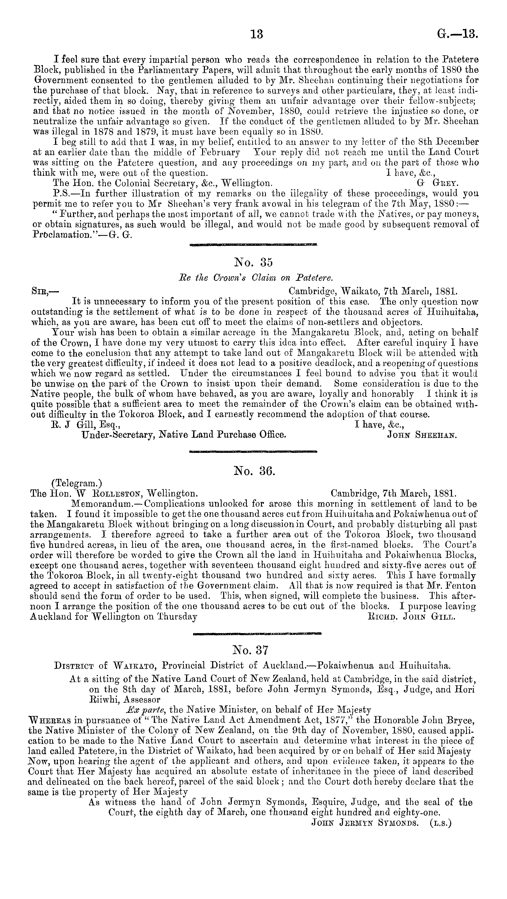 No. 35 Re the Crown's Claim on Patetere. Sir, — Cambridge, Waikato, 7th March, 1881. It is unnecessary to inform you of the present position of this case. The only question now outstanding is the settlement of what is to be done in respect of the thousand acres of Huihuitaha, which, as you are aware, has been cut off to meet the claims of non-settlers and objectors. Tour wish has been to obtain a similar acreage in the Mangakaretu Block, and, acting on behalf of the Crown, I have done my very utmost to carry this idea into effect. After careful inquiry I have come to the conclusion that any attempt to take land out of Mangakaretu Block will be attended with the very greatest difficulty, if indeed it does not lead to a positive deadlock, and a reopening of questions which we now regard as settled. Under the circumstances I feel bound to advise you that it would be unwise on the part of the Crown to insist upon their demand. Some consideration is due to the Native people, the bulk of whom have behaved, as you are aware, loyally and honorably I think it is quite possible that a sufficient area to meet the remainder of the Crown's claim can be obtained without difficulty in the Tokoroa Block, and I earnestly recommend the adoption of that course. E. J Gill, Esq., I have, &c, Under-Secretary, Native Land Purchase Office. John Sheehan.