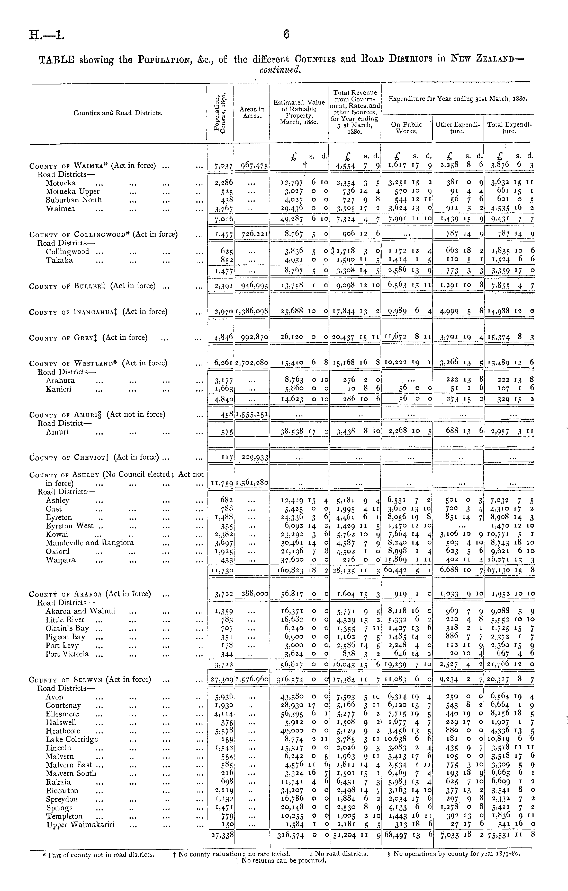 Counties and Road Districts. O W rt - Areas in "H 3 Acres. a, j2 o p 0-5 Estimated Value of Rateable Property, March, 1SS0. Total Revenue from Government, Rates, and other Sources, for Year ending 31st March, 1880, Expenditure for Year ending 31st March, 1880. On Public Works. Other Expendi- Total Expenditure, ture. 7,037 967,475 £ s. d. /; s. d. 4,554 7 9 £ 9. d. 1,617 17 9 £ 9. d. 2,258 8 6 £ 9. d. 3,876 6 3 County of Waimea* (Act in force) ... Road Districts — Mctueka Motueka Upper Suburban North Waimea 2,286 525 438 3,767 12,797 6 10 3,027 o o 4,027 o o 29,436 o o t 2,354 3 S 736 14 4 727 9 8 3,505 17 2 3,251 TS 2 S7o 10 9 544 12 n 3,624 13 o 381 o 9 91 4 4 56 7 6 911 3 2 3,632 15 11 661 15 1 601 o 5 4.S35 16 2 7,oi6| 49,287 6 10 7,324 7,991 n 10 i,439 15 9 9.431 County of Collingwood* (Act in force) Road Districts— Collingwood ... Takaka i,477 726,221 8,767 S o] 906 12 6] 787 14 9] 662 18 no 5 2 787 14 9 625 852 3,836 5 o 4,931 o 0 j 1,718 3 o ( i,590 11 5] 1 172 12 4 1,414 1 5 1,835 10 6 1,524 6 6 i,477 8,767 3,308 14 2,586 13 9 773 3 3 3,359 17 o County of BullerJ (Act in force) ... 2,39i 946,995 13,758 1 0 9,098 12 10 6,563 13 11 1,291 10 8] 7,855 4 7 County of InangahuaJ (Act in force) 2,970, 1,386,098 25,688 10 Oi 17,844 13 2 9,989 6 4| 4,999 5 8 14,988 12 O County of GreyJ (Act in force) 4,846] 992,870 26,120 o o 20,437 IS 11 11,672 8 11 3,701 19 4] 15.374 8 3 County of Westland* (Act in force) Road Districts — Arahura Kanieri 6,061 2,702,080 15,410 6 8 8,763 o 10 5,860 o 0 15,168 16 8 10,222 19 1 3,266 13 5 13,489 12 6 3.177 1,663' 276 2 o 10 8 6 56 o o 222 13 8 51 1 6 222 13 8 107 1 6 4,840 14,623 o 10 286 10 6 56 o o 273 15 329 1.5 County of Amuri§ (Act not in force) Road District— Amuri 458] i,555,25i 575 38,538 17 2 3,438 8 10 2,268 10 5 688136I 2,957 3 11 County of Cheviot!] (Act in force) ... "7 209,933 County of Ashley (No Council elected; Act not in force) Road Districts — Ashley Cust Eyreton Eyreton West .. Kowai Mandeville and Rangiora Oxford Waipara ii,7S9! 682 788 1,488 335 2,382 3,697 1,925 433 1,361,280 12,419 15 4 5,425 o o 24,336 3 6 6,092 14 2 23,292 3 6 30,461 14 o 21,196 7 8 37,600 o o 5,181 9 4 1,995 4 11 4,461 6 1 1,429 11 5 5,762 10 9 4,587 7 9 4,502 1 o 216 o o 6,53i 7 2 3,610 13 10 8,056 19 8 1,470 12 10 7,664 14 4 8,240 14 o 8,998 1 4 15,869 1 11 5°i o 3 700 3 4 851 14 7 7,032 7 S 4,310 17 2 8,908 14 3 1,470 12 10 10,771 5 1 8,743 18 10 9,621 6 10 16,271 13 3 3,106 10 9, 5°3 4 io] 623 5 6 402 11 4] 11,73°! 160,823 18 28,135 II 3 60,442 5 6,688 10 7 67,130 15 8 County of Akaroa (Act in force) Road Districts—■ Akaroa and Wainui Little River ... Okain's Bay ... Pigeon Bay Port Levy Port Victoria ... 3,722i 1,359 783 7°7 36' 178 344 288,000 56,817 o o 16,371 o o 18,682 o o 6,240 o o 6,900 o o 5,000 o o; 3,624 o o 1 1,604 15 3! 5,77i 9 5 4,329 13 2 i,35S 7 I' 1,162 7 5 2,586 14 5 838 3 2 8,118 16 o 5,332 6 2 1,407 13 6 1,485 14 o 2,248 4 o 646 14 2 919 1 9 1,033 9 10] 969 7 9 220 4 8 318 2 1 886 7 7 112 11 9 20 10 4 1,952 10 10 9,088 3 9 5,552 10 10 1,725 15 7 2,372 1 7 2,360 15 9 667 4 6 3,722 56,817 o 0i 16,043 15 19,239 7 10 2,527 4 21,766 12 County of Selwyn (Act in force) Road Districts — Avon Courtenay Ellesmere Halswell Heathcote Lake Coleridge Lincoln Malvern Malvern East ... Malvern South Rakaia Riccarton Spreydon Springs Templeton Upper Waimakariri 27,309 5,936 1,93° 4,114 375 S,5?8 159 1,542 554 585 216 698 2,119 1,132 I-471 779 150 i,S76,96o] 316,574 o oj 43,380 o o 28,930 17 o 56,395 6 1 5,912 o o 49,000 o o 8,774 2 11 15,317 o ° 6,242 o 5 4,576 11 6 3,324 16 7 11,741 4 6 34,207 o o 16,786 o o 20,148 o o 10,255 ° o 1,584 I o 17,384 II 7,503 5 it 5,166 3 11 5,277 6 2 1,508 9 2 5,129 9 2 3,785 3 I' 2,026 9 3 1,963 9 11 1,811 14 4 1,501 15 1 6,43i 7 3 2,498 14 7 1,884 6 2 2,530 8 9 1,005 2 10 1,181 5 5 7 11,083 6 o 6,314 19 4 6,120 13 7 7,7'S 19 5 i,677 4 7 3=456 13 5 10,638 6 6 3,083 2 4 3,4i3 17 6 2,534 1 11 6,469 7 4 5,983 13 4 3,163 14 10 2,034 17 6 4,i.33 6 6 i,443 16 11 313 18 6 9,234 2 7| 250 o o) 543 8 2 440 19 o 229 17 o 880 o o 181 0 0 435 9 7 105 o o 775 3 10 193 18 9 623 7 10 377 13 2 297 9 8 1,278' o 8 392 13 o 27 17 6 20,317 8 7 6,564 19 4 6,664 1 9 8,156 18 5 1,907 1 7 4,336 13 5 10,819 6 6 3,518 11 11 3,518 17 6 3,309 5 9 6,663 6 1 6,609 1 2 3,54i 8 o 2,332 7 2 S,4i 1 7 2 1,836 9 11 341 16 o 27,338 316,574 o o 51,204 II 9 68,497 13 6 7.033 18 2 75,531 11 8 * Part of county not in road districts. t No county valuatt >n ; no rate levied. X No road districts. ]1 No returns can be procured. § No operations by county for year 1879-80.