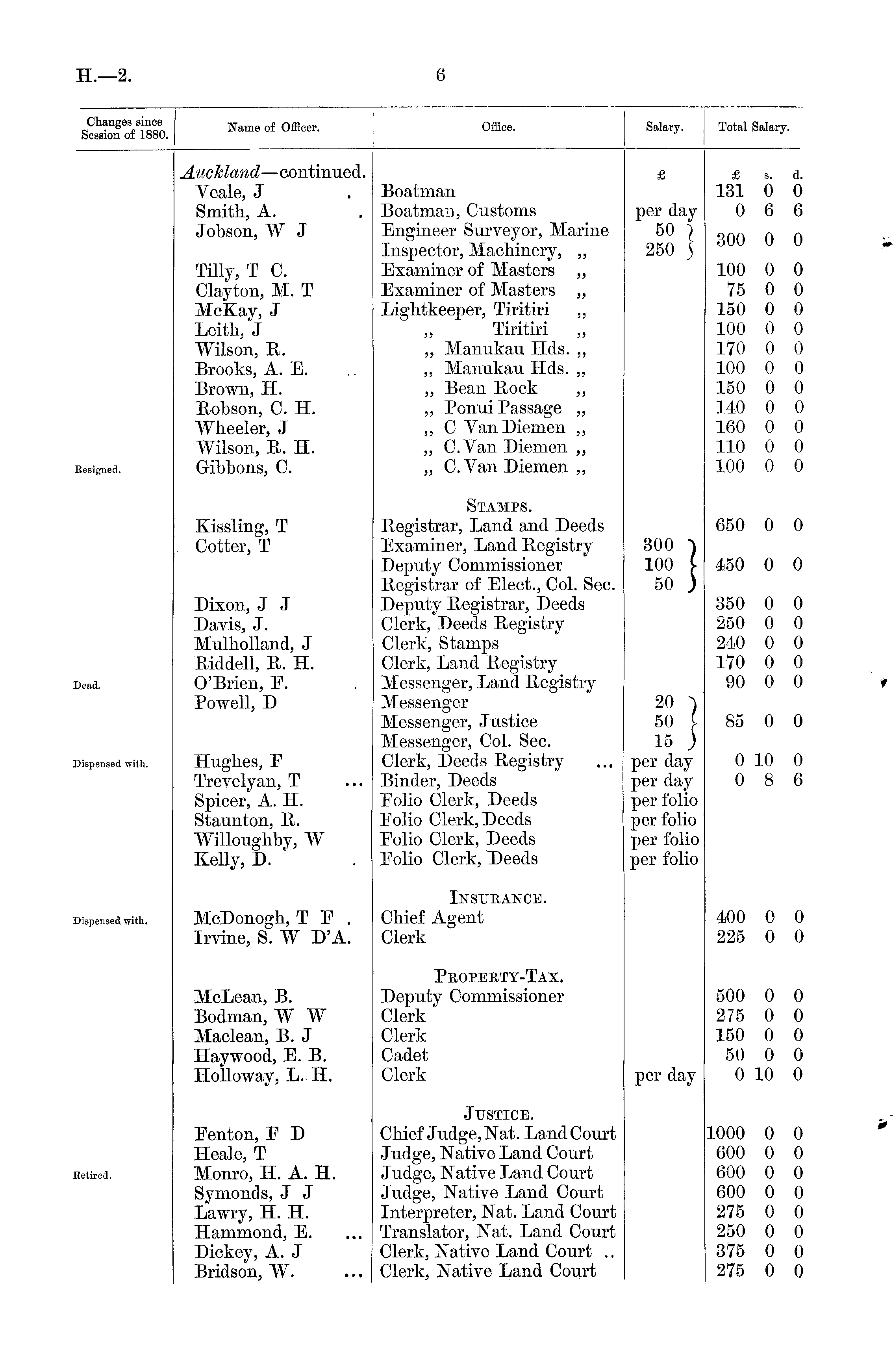 Changes since Session of 1880. Name of Officer. Office. Salary. Total Salary. Auckland —continued. Veale, J Smith, A. Jobson, W J Boatman Boatman, Customs Engineer Surveyor, Marine Inspector, Machinery, „ Examiner of Masters „ Examiner of Masters „ Lightkeeper, Tiritiri „ „ Tiritiri ,, ,, Manukau Hds. „ „ Manukau Hds. ,, ,, Bean Rock ,, ,, Ponui Passage „ ,, C VanDiemen ,, ,, C.Van Diexnen ,, „ C.Van Diemen ,, £ per day 50 I 250 ) £ S. 131 0 0 6 d. 0 6 300 0 0 Tilly, T 0. Clayton, M. T McKay, J Leith, J Wilson, R. Brooks, A. E. Brown, H. Robson, C. H. Wheeler, J Wilson, R. H. Gibbons, C. 100 0 75 0 150 0 100 0 170 0 100 0 150 0 140 0 160 0 110 0 100 0 0 0 0 0 0 0 0 0 0 0 0 Resigned. Dead. Kissling, T Cotter, T Dixon, J J Davis, J. Mulholland, J Biddell, R. H. O'Brien, E. Powell, D Stamps. Registrar, Land and Deeds Examiner, Land Registry Deputy Commissioner Registrar of Elect., Col. Sec. Deputy Registrar, Deeds Clerk, Deeds Registry Clerk, Stamps Clerk, Land Registry Messenger, Land Registry Messenger Messenger, Justice Messenger, Col. Sec. Clerk, Deeds Registry Binder, Deeds Eolio Clerk, Deeds Eolio Clerk, Deeds Eolio Clerk, Deeds Eolio Clerk, Deeds 300 ) 100 £ 50 ) 650 0 450 0 350 0 250 0 240 0 170 0 90 0 0 0 0 0 0 0 0 Dispensed with. Hughes, E Trevelyan, T Spicer, A. H. Staunton, R. Willoughby, W Kelly, D. ' 20 ■) 50 f 15 ) per day per day per folio per folio per folio per folio 85 0 0 10 0 8 0 0 6 McDonogh, T E . Irvine, S. W D'A. Insurance. 400 0 225 0 0 0 Dispensed with. Chief Agent Clerk McLean, B. Bodman, W W Maclean, B. J Haywood, E. B. Holloway, L. H. Property-Tax. Deputy Commissioner Clerk Clerk Cadet Clerk 500 0 275 0 150 0 50 0 0 10 0 0 0 0 0 per day Retired. Eenton, E D Heale, T Monro, H. A. H. Symonds, J J La wry, H. H. Hammond, E. Dickey, A. J Bridson, W. Justice. Chief Judge, Nat. Land Court Judge, Native Land Court Judge, Native Land Court Judge, Native Land Court Interpreter, Nat. Land Court Translator, Nat. Land Court Clerk, Native Land Court .. Clerk, Native Land Court 1000 0 600 0 600 0 600 0 275 0 250 0 375 0 275 0 0 0 0 0 0 0 0 0