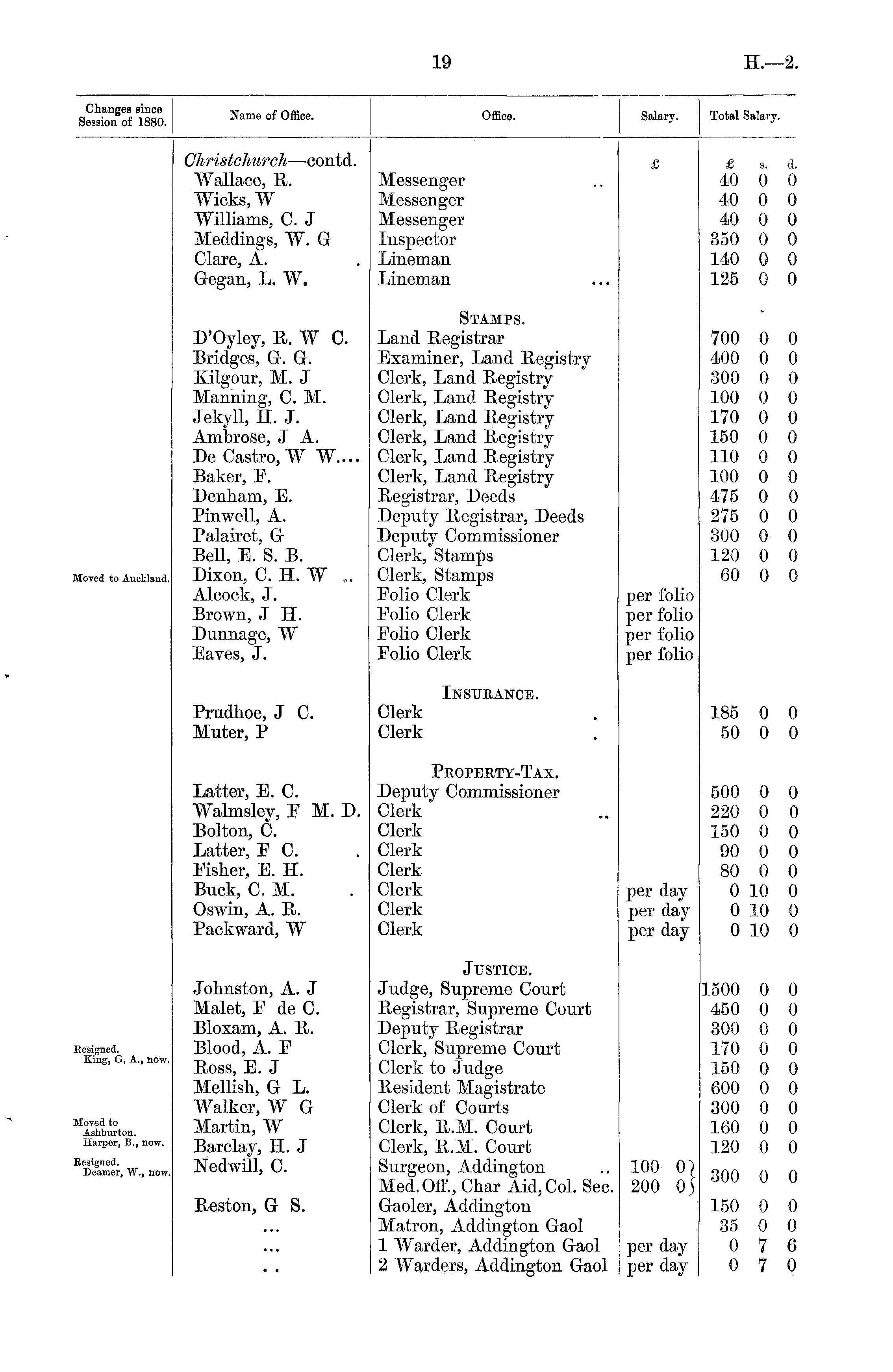 Changes since Session of 1880. Name of Office. Office. Salary. Total Salary. Christchurch —contd. Wallace, E. Wicks, W Williams, C. J Meddings, W. G Clare, A. Gegan, L. W. Messenger Messenger Messenger Inspector Lineman £ 40 40 40 350 140 125 s. 0 0 0 0 0 0 d. 0 0 0 0 0 0 Lineman D'Oyley, E. W 0. Bridges, G. G. Kilgour, M. J Manning, CM. Jekyll, H. J. Ambrose, J A. De Castro, W W.... Baker, E. Denham, E. Pinwell, A. Palairet, G Bell, E. S. B. Dixon, C. H. W „. Alcock, J. Stamps. Land Eegistrar Examiner, Land Eegistry Clerk, Land Eegistry Clerk, Land Eegistry Clerk, Land Eegistry Clerk, Land Eegistry Clerk, Land Eegistry Clerk, Land Eegistry Eegistrar, Deeds Deputy Eegistrar, Deeds Deputy Commissioner Clerk, Stamps Clerk, Stamps Eolio Clerk Folio Clerk Eolio Clerk Eolio Clerk 700 400 300 100 170 150 110 100 475 275 300 120 60 0 0 0 0 0 0 0 0 0 0 0 0 0 0 0 0 0 0 0 0 0 0 0 0 0 0 MoTed to Auckland. Brown, J H. Dunnage, W Eaves, J. per folio per folio per folio per folio Prudhoe, J 0. Muter, P Insurance. Clerk Clerk 185 0 50 0 0 0 Latter, E. 0. Walmsley, E M. D. Bolton, C. Latter, E C. Eisher, E. H. Buck, C. M. Oswin, A. B. Packward, W Property-Tax. Deputy Commissioner Clerk Clerk Clerk Clerk Clerk Clerk Clerk 500 0 220 0 150 0 90 0 80 0 0 10 0 10 0 10 0 0 0 0 0 0 0 0 per day per day per day Johnston, A. J Malet, E de C Bloxam, A. E. Blood, A. E Eoss, E. J Mellish, G L. Walker, W G Martin, W Barclay, H. J Nedwill, 0. Justice. 1500 0 0 Resigned. King, G. A., now. Moved to Ashburton. Harper, B., now. Judge, Supreme Court Eegistrar, Supreme Court Deputy Eegistrar Clerk, Supreme Court Clerk to Judge Besident Magistrate Clerk of Courts Clerk, E.M. Court Clerk, E.M. Court Surgeon, Addington Med.Off., Char Aid, Col. Sec. Gaoler, Addington Matron, Addington Gaol 1 Warder, Addington Gaol 2 Warders, Addington Gaol 450 0 300 0 170 0 150 0 600 0 300 0 160 0 120 0 0 0 0 0 0 0 0 0 Kesigned. Deamer, W., now. 100 0) 200 0) 300 0 0 Eeston, G S. 150 0 35 0 0 7 0 7 0 0 6 0 per day per day • •