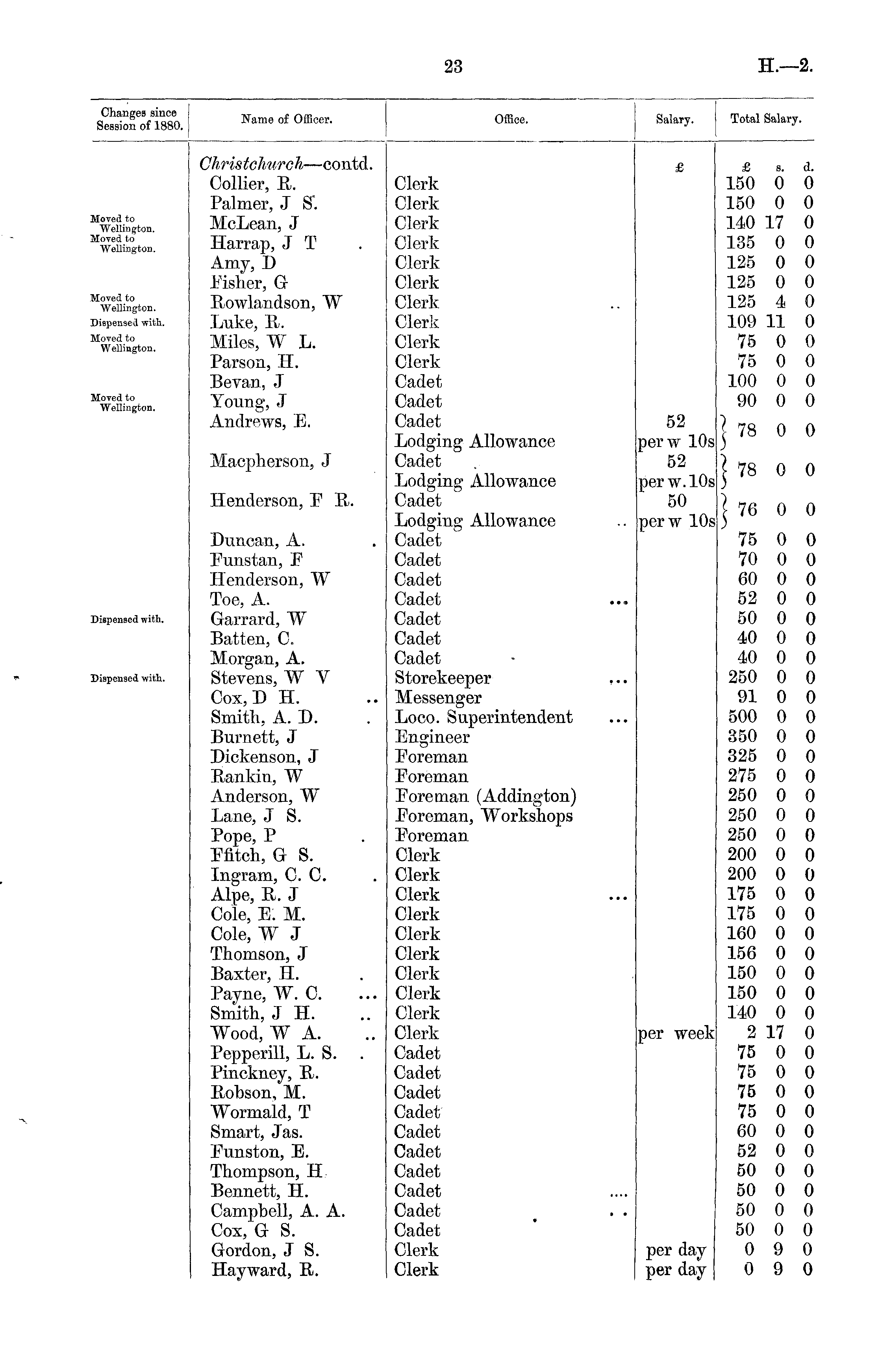 Changes since Session of 1880. Name of Officer. Office. Salary. Total Salary. Moved to Wellington. Moved to Wellington. Moved to Wellington. Dispensed with. Christchurch —contd. Collier, E. Palmer, J S. McLean, J Harrap, J T Amy, D Fisher, G Rowlandson, W Luke, R. Miles, W L. Parson, H. Bevan, J Young, J Andrews, E. Clerk Clerk Clerk Clerk Clerk Clerk Clerk Clerk Clerk Clerk Cadet Cadet Cadet Lodging Allowance Cadet Lodging Allowance Cadet Lodging Allowance Cadet Cadet Cadet Cadet Cadet Cadet Cadet Storekeeper Messenger Loco. Superintendent Engineer Foreman Foreman Foreman (Addington) Foreman, Workshops Foreman Clerk Clerk Clerk Clerk Clerk Clerk Clerk Clerk Clerk Clerk Cadet Cadet Cadet Cadet Cadet Cadet Cadet Cadet Cadet Cadet Clerk Clerk • • • ■ ■ • £ s. 150 0 150 0 140 17 135 0 125 0 125 0 125 4 109 11 75 0 75 0 100 0 d. 0 0 0 0 0 0 0 0 0 0 0 Moved to Wellington. Moved to Wellington, 90 0 0 Macpherson, J 52 perw 10s 52 | 78 0 j 78 0 } 76 0 0 0 0 Henderson, F R. perw. 10s 50 perw 10s Duncan, A. Funstan, F Henderson, W 75 0 70 o 60 0 52 0 50 0 40 0 40 0 250 0 91 0 500 0 350 0 325 0 275 0 250 0 250 0 250 0 200 0 200 0 175 0 175 0 160 0 156 0 150 0 150 0 140 0 2 17 75 0 75 0 75 0 75 0 60 0 52 0 50 0 50 0 50 0 50 0 0 9 0 9 0 0 0 0 0 0 0 0 0 0 0 0 0 0 0 0 0 0 0 0 0 0 0 0 0 0 0 0 0 0 0 0 0 0 0 0 0 0 Dispensed with. Dispensed with. Toe, A. Garrard, W Batten, C. Morgan, A. Stevens, W V Cox, D H. Smith, A. D. Burnett, J Dickenson, J Rankin, W Anderson, W Lane, J S. Pope, P Ffitch, G S. Ingram, C. C. Alpe, R. J Cole, E. M. Cole, W J Thomson, J Baxter, H. Payne, W. C. Smith, J H. Wood, W A. Pepperill, L. S. Pinckney, R. Rohson, M. Wormald, T Smart, Jas. Funston, E. Thompson, H Bennett, H. Campbell, A. A. Cox, G S. Gordon, J S. Hayward, R. per week per day per day