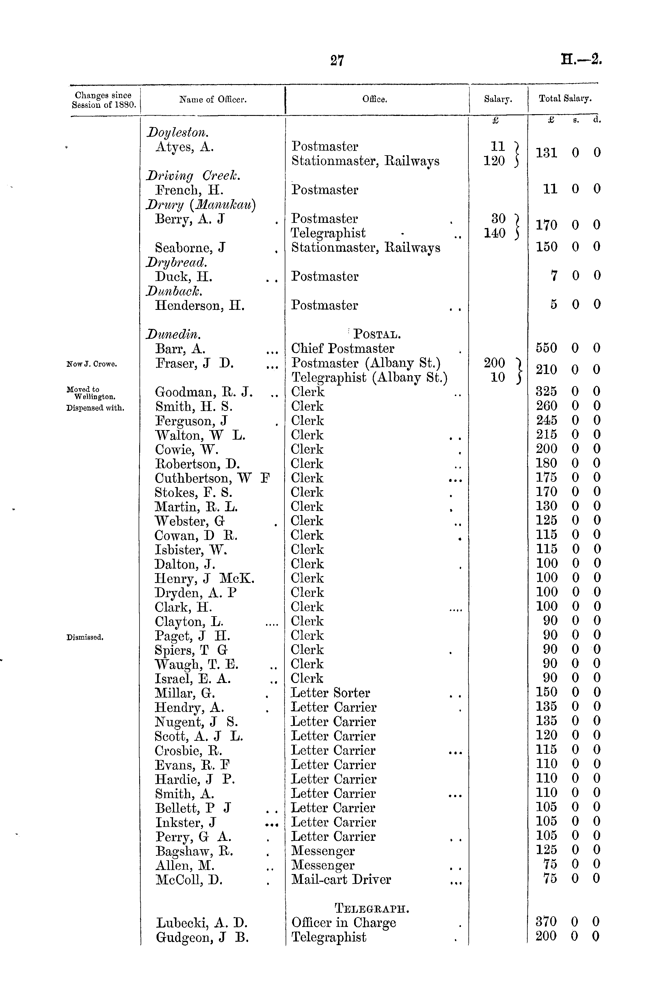 Changes since Session of 1880. Name of Officer. Office. Salary. Total Salary. £ £ 8. d. Doyleston. Atyes, A. Postmaster Stationmaster, Railways 11 I 120 j 131 0 0 Driving Creek. French, H. Drury (Mantikau) Berry, A. J Postmaster 30 ■) 140 ) 11 0 0 Postmaster Telegraphist Stationmaster, Railways 170 0 0 Seaborne, J Drybread. Duck, H. Dunbach, Henderson, H. Postmaster 150 7 0 0 0 0 Postmaster t • 5 0 0 Dunedin. Barr, A. Fraser, J D. : Postal. Chief Postmaster Postmaster (Albany St.) Telegraphist (Albany St.) Clerk Clerk Clerk Clerk Clerk Clerk Clerk Clerk Clerk Clerk Clerk Clerk Clerk Clerk Clerk Clerk Clerk Clerk Clerk Clerk Clerk Letter Sorter Letter Carrier Letter Carrier Letter Carrier Letter Carrier Letter Carrier Letter Carrier Letter Carrier Letter Carrier Letter Carrier Letter Cax'rier Messenger Messenger Mail-cart Driver I ■ i • • • * a ■ • • • • • • 550 0 0 Now J. Crowe. 200 10 } 210 0 0 MoTed to Wellington. Dispensed with. Goodman, R. J. Smith, II. S. Ferguson, J Walton, W L. Cowie, W. Robertson, D. Cuthbertson, W F Stokes, F. S. Martin, It. L. Webster, G Cowan, D R. Isbister, W. Dalton, J. Henry, J McK. Dryden, A. P Clark, H. Clayton, L. Paget, J H. Spiers, T G Wau.gh, T. E. Israel, E. A. Millar, G. Hendry, A. Niigent, J S. Scott, A. J L. Crosbie, R. Evans, R. F Hardie, J P. Smith, A. Bellett, P J Inkster, J ... Perry, G A. Bagshaw, R. Allen, M. McColl, D. 325 260 245 215 200 180 175 170 130 125 115 115 100 100 100 100 90 90 90 90 90 150 135 135 120 115 110 110 110 105 105 105 125 75 75 0 0 0 0 0 0 0 0 0 0 0 0 0 0 0 0 0 0 0 0 0 0 0 0 0 0 0 0 0 0 0 0 0 0 0 0 0 0 0 0 0 0 0 0 0 0 0 0 0 0 0 0 0 0 0 0 0 0 0 0 0 0 0 0 0 0 0 0 0 0 Dismissed. Lubecki, A. D. Gudgeon, J B. Telegraph. Officer in Charge Telegraphist 370 200 0 0 0 0