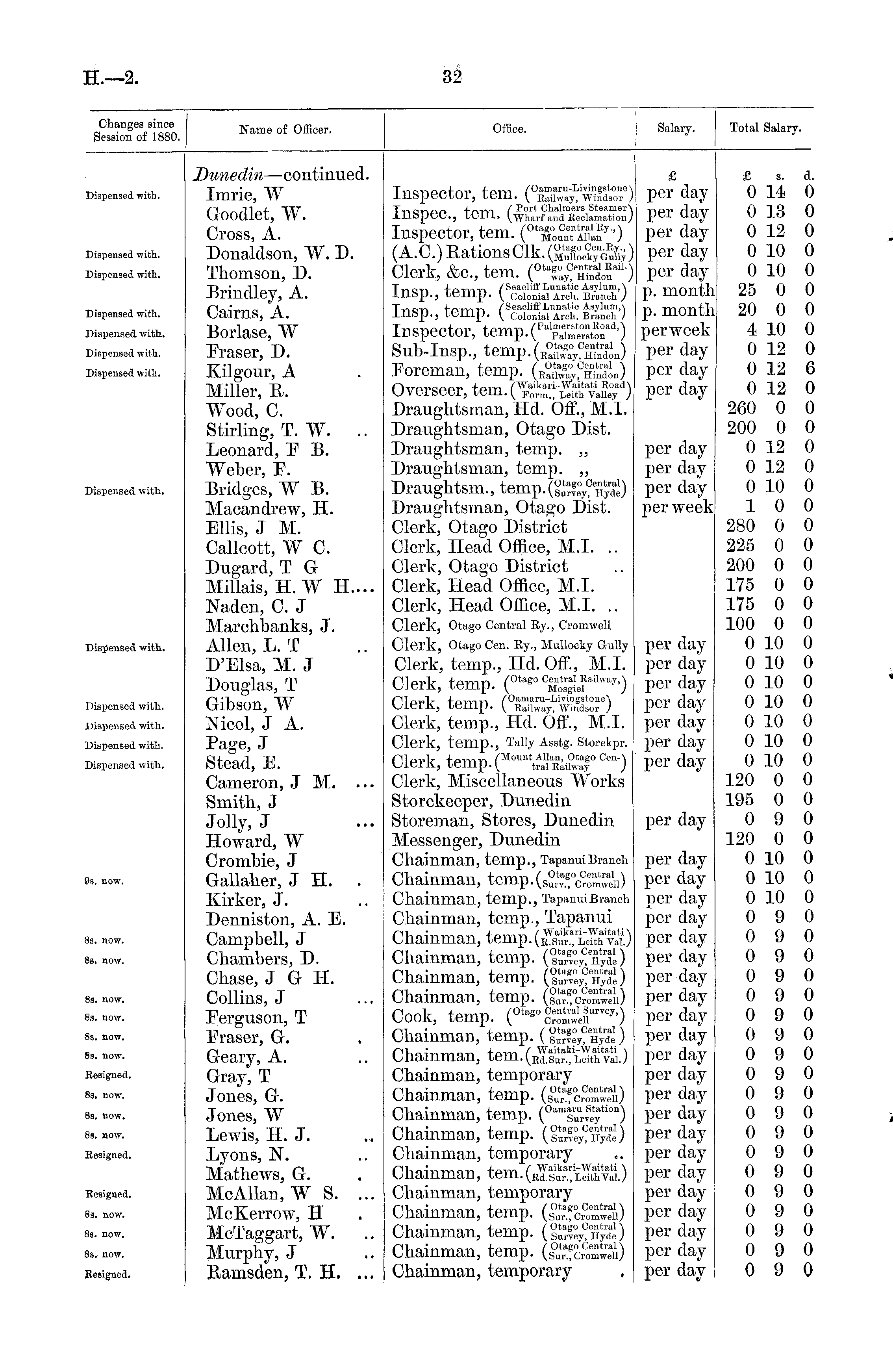 Changes since Session of 1880. Name of Officer. Office. Salary. Total Salary. Dispensed with. Dispensed with. Dispensed with. Dispensed with. Dispensed with. Dispensed with. Dispensed with. Disx>ensed with. Dispensed, with. Dispensed, with. Dispensed with. Dunedin —continued. Inirie, W Goodlet, W. Cross, A. Donaldson, W. D. Thomson, D. Brindley, A. Cairns, A. Borlase, W Eraser, D. Kilgoui*, A Miller, It. Wood, C. Stirling, T. W. Leonard, E B. Weber, E. Bridges, W B. Macandrew, H. Ellis, J M. Callcott, W C. Dugard, T G Millais, H.W H.... Naden, C. J Marchbanks, J. Allen, L. T D'Elsa, M. J Douglas, T Gibson, W Nicol, J A. Page, J Stead, E. Cameron, J M. Smith, J Jolly, J Howard, W Crombie, J Gallaher, J H. Kirker, J. Denniston, A. E. Campbell, J Chambers, D. Chase, J G H. Collins, J Eerguson, T Eraser, G. Geary, A. Gray, T Jones, G. Jones, W Lewis, H. J. Lyons, N. Mathews, G. McAllan, W S. ... McKerrow, H MeTaggart, W. Murphy, J Eamsden, T. H. ... ±lib»peCLUl, 1(5111. Railway, Windsor ) T-vioi-v/^o +rvTvi ( Fort Chalmers Steamer\ XllbpeG., leiXU Wharf and Reclamation; Inspector, tern. fTou™* 1') (A.C.) Rations Clk. (&X£g^) PWV RrO tpTYl /Otago Central Kail-\ VjlUK, (Y/C, LCIIi. (_ way, Hindon ) Tvic!t\ Idwiti I Seaclifl'Lunatic AsyltauA mSp., temp. (_ Colonial Arch. Branch ) Tno-n forn-n / Seacliff Lunatic Asylum,\ inSp., temp. Colonial Arch. Branch I Inspector, temp. C^ZT^T"') Sub-Insp., temp.(^r^tdl) Foreman, temp. U°Z%^L) Overseer, tern. (^rS "") Draughtsman, Hd. Off., M.I. Draughtsman, Otago Dist. Draughtsman, temp. „ Draughtsman, temp. „ Draughtsm., temp. (£X? Hyt) Draughtsman, Otago Dist. Clerk, Otago District Clerk, Head Office, M.I. .. Clerk, Otago District Clerk, Head Office, M.I. Clerk, Head Office, M.I. .. Clerk, Otago Central Ry., Cromwell Clerk, Otago Con. Ry., Mullocky Gully Clerk, temp., Hd. Off., M.I. Clerk, temp. ( otago °S5$£* ilw-) Clerk, temp. 8) Clerk, temp., Hd. Off., M.I. Clerk, temp., Tally Asstg. Storekpr. Plr.y.1^ fomn /Mount Allan, Otago Cen-\ UlCrK, temp.l^ tral Bailway ) Clerk, Miscellaneous Works Storekeeper, Dunedin Storeman, Stores, Dunedin Messenger, Dunedin Cliainman, temp., TapanuiBranch Chainman, temp.-( s^f0 °£S) Chainman, temp., TapanuiBwuch Chainman, temp., Tapanui Chainman, temp.(S^tSyl) Chainman, temp. (%^^) Chainman, temp. (Z^Tyt) Chainman, temp. (&—i) Cook, temp. ( 0tag08rl rwen urTey') Chainman, temp. Ci^uft) Chainman, tern. (JSSSSSSw.) Chainman, temporary Chainman, temp. (§£$££&) Chainman, temp. (Oam^ u rT s e V ation) Chainman, temp. (SX^S) Chainman, temporary Chainman, tern. (kI^™.) Chainman, temporary Chainman, temp. (££$£££) Chainman, temp. (^X™) Chainman, temp. ( s °ur.fcromwen) Chainman, temporary £ per day per day per day per day per day p. month p. month per week per day per day per day per day per day per day per week per day per day per day per day per day per day per day £ s. 0 14 0 13 0 12 0 10 0 10 25 0 20 0 4 10 0 12 0 12 0 12 260 0 200 0 0 12 0 12 0 10 1 0 280 0 225 0 200 0 175 0 175 0 100 0 0 10 0 10 0 10 0 10 0 10 0 10 0 10 120 0 195 0 0 9 120 0 0 10 0 10 0 10 0 9 0 9 0 9 0 9 0 9 0 9 0 9 0 9 0 9 0 9 0 9 0 9 0 9 0 9 0 9 0 9 0 9 0 9 0 9 d. 0 0 0 0 0 0 0 0 0 6 0 0 0 0 0 0 0 0 0 0 0 0 0 0 0 0 0 0 0 0 0 0 0 0 0 0 0 0 0 0 0 0 0 0 0 0 0 0 0 0 0 0 0 0 0 0 Dispensed with. Dispensed with. per day 9s. now. 8a, now. 8a. now. 8s. now. 8a. now. 8s. now. 8s. now. per day per day per day per day per day per day per day per day per day per day per day per day per day per day per day per day per day per day per day per day per day per day Resigned. 8s. now. 8s. now. 8s. now. Resigned. Resigned. 8s. now. 8s. now. 8s. now. Resigned.
