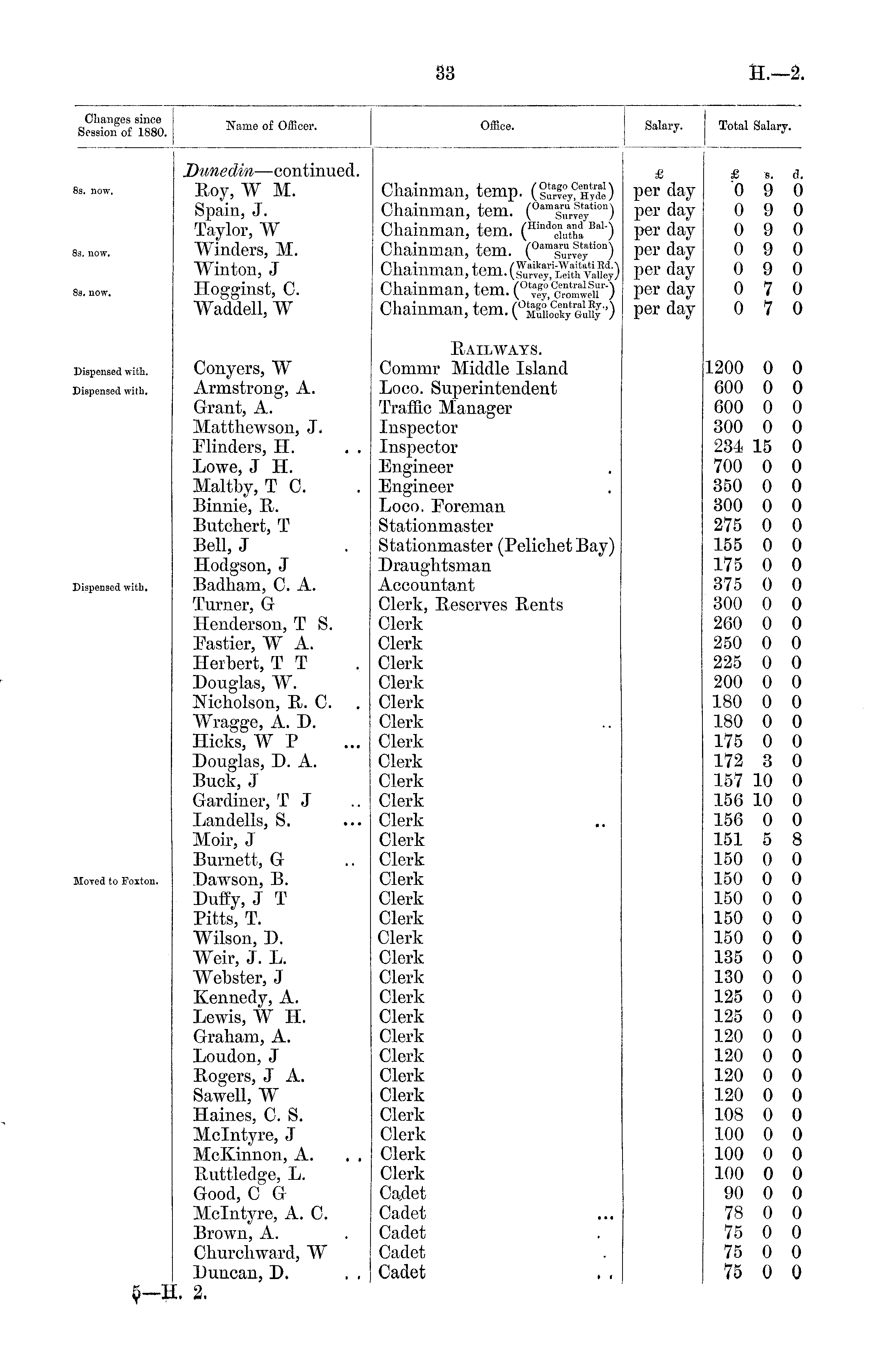 Changes since Session of 1880. Name of Officer. Office. Salary. Total Salary. 3s. now. is. now. Dunedin —continued. Roy, W M. Spain, J. Taylor, W Winders, M. Winton, J Hogginst, 0. Waddell, W Chainman, temp. (§X?Hyd ae) Chainman, tern. ( Oam|™; Sey tion) Chainman, tern. (^ISa Bal') Chainman, tern. ( Oam!™4V ation) Oli n i t-i w» o it 4-mm / Waikari-Waitati Rd.\ Onamman, tem. (survey, Leith Valley) nViainmon +om fQtago Central Sur-\ ondinman, xem. T e 7i oomweii ) nlioinwlaM +om /Otago CentralEy.,\ unainman, tem. Muuooty Guiiy ) £ per day per day per day per day per day per day per day £ 8. 0 9 0 9 0 9 0 9 0 9 0 7 0 7 a. 0 0 0 0 0 0 0 3s. now. Dispensed with. Conyers, W Armstrong, A. Grant, A. Matthewson, J, Minders, H. Lowe, J H. Maltby, T 0. Binnie, R. Butohert, T Bell, J Hodgson, J Badham, G. A. Turner, G Henderson, T S. Pastier, W A. Herbert, T T Douglas, W. Nicholson, R. 0. Wragge, A. D. Hicks, W P Douglas, D. A. Buck, J Gardiner, T J Landells, S. Moir, J Burnett, G Dawson, B. Duffy, J T Pitts, T. Wilson, D. Weir, J. L. Webster, J Kennedy, A. Lewis, W H. Graham, A. Loudon, J Rogers, J A. Sawell, W Haines, C. S. Mclntyre, J McKinnon, A. . . Ruttledge, L. Good, C G Mclntyre, A. C. Brown, A. Churchward, W Duncan, D. Railways. Commr Middle Island Loco. Superintendent Traffic Manager Inspector Inspector Engineer Engineer Loco. Foreman Stationmaster Stationmaster (Pelichet Bay) Draughtsman Accountant Clerk, Reserves Rents Clerk Clerk Clerk Clerk Clerk Clerk Clerk Clerk Clerk Clerk Clerk Clerk Clerk Clerk Clerk Clerk Clerk Clerk Clerk Clerk Clerk Clerk Clerk Clerk Clerk Clerk Clerk Clerk Clerk Cadet Cadet Cadet Cadet Cadet . . 1200 0 600 0 600 0 300 0 234 15 700 0 350 0 300 0 275 0 155 0 175 0 375 0 300 0 260 0 250 0 225 0 200 0 180 0 180 0 175 0 172 3 157 10 156 10 156 0 151 5 0 0 0 0 0 0 0 0 0 0 0 0 0 0 0 0 0 0 0 0 0 0 0 0 8 Dispensed with. •ispensed with. Moved to Foxton. 150 0 150 0 150 0 150 0 150 0 135 0 0 0 0 0 0 0 130 0 125 0 125 0 120 0 120 0 120 0 120 0 108 0 100 0 100 0 100 0 90 0 78 0 75 0 75 0 75 0 0 0 0 0 0 0 0 0 0 0 0 0 0 0 0 0