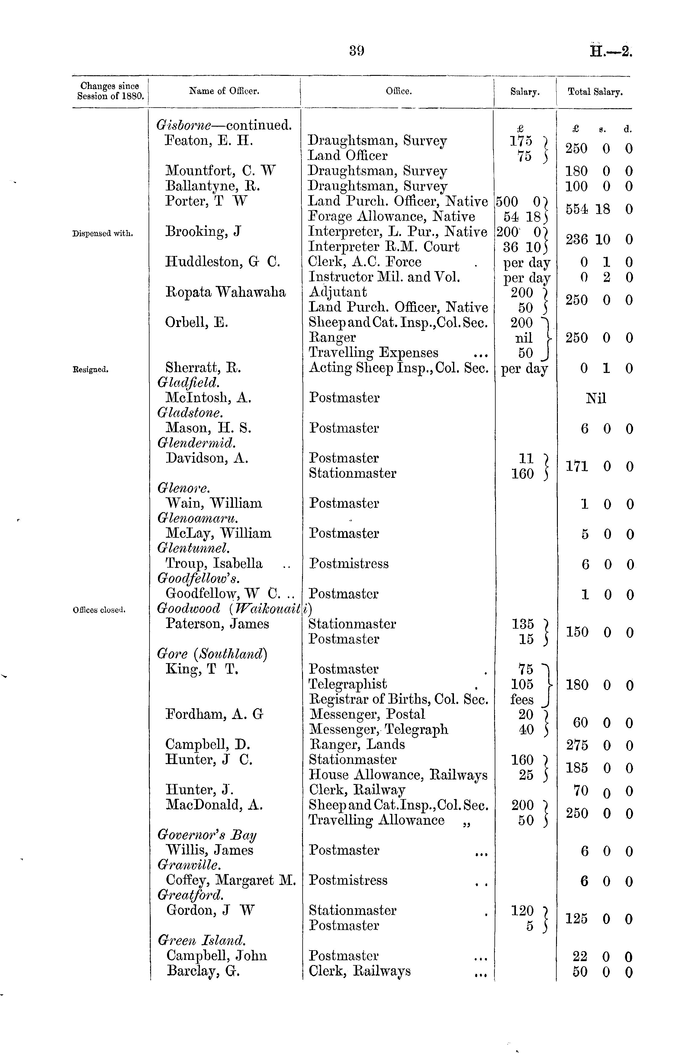 Changes since Session of 1880. Name of Officer. Office. Salary. Total Salary. Gisborne —continued. Featon, E. H. Draughtsman, Survey Land Officer Draughtsman, Survey Draughtsman, Survey Land Purch. Officer, Native Forage Allowance, Native Interpreter, L. Pur., Native Interpreter R.M. Court Clerk, A.C. Force Instructor Mil. and Vol. Adjutant Land Purch. Officer, Native Sheep and Cat. Insp.,Col. Sec. Hanger Travelling Expenses Acting Sheep Insp., Col. Sec. £ 175 } 75 3 £ s. a. 250 0 0 Mountfort, 0. W Ballantyne, R. Porter, T W 500 0^ 54 183 200 0) 36 103 per day per day 200 \ 50 5 200 "1 nil [ 50 J per day 180 0 100 0 0 0 554 18 0 Dispensed with. Brooking, J 236 10 0 Huddleston, G C. 0 1 0 2 0 0 Ropata Waliawalia 250 0 0 Orbell, E. 250 0 0 Resigned. Sherratt, R. Gladfield. Mclntosh, A. Gladstone. Mason, H. S. Glendermid. Davidson, A. Postmaster 0 1 Nil 0 Postmaster 6 0 0 Postmaster Stationmaster 11 ] 160 5 171 0 0 Glenore. Wain, William Glenoamaru. McLay, William Glenhmnel. Troup, Isabella Goodfellow's. Goodfellow, W C. .. Goodwood {Waikouait Paterson, James Postmaster Postmaster Postmistress 1 0 5 0 6 0 0 0 0 Postmaster 0 Stationmaster Postmaster 1 0 0 Offices closed. 135 \ 15 j 150 0 0 Gore {Southland) King, T T. Postmaster Telegraphist Registrar of Births, Col. Sec. Messenger, Postal Messenger, Telegraph Ranger, Lands Stationmaster House Allowance, Railways Clerk, Railway Sheep and Cat.Insp., Col. Sec. Travelling Allowance „ 75 105 jfees J 20 ) 40 J 180 0 0 Fordham, A. G 60 0 0 Campbell, D. Hunter, J 0. 160 \ 25 j 275 0 0 185 0 0 Hunter, J, MacDonald, A. 200 1 50 5 70 o 0 250 0 0 Governor's Hay Willis, James Granville. Coffey, Margaret M. Greatford. Gordon, J W Postmaster Postmistress , . 6 0 6 0 0 0 Stationmaster Postmaster 120 ? 5 5 125 0 0 Green Island. Campbell, Jobn Barclay, G. Postmaster .,. Clerk, Railways 22 0 50 0 0 0