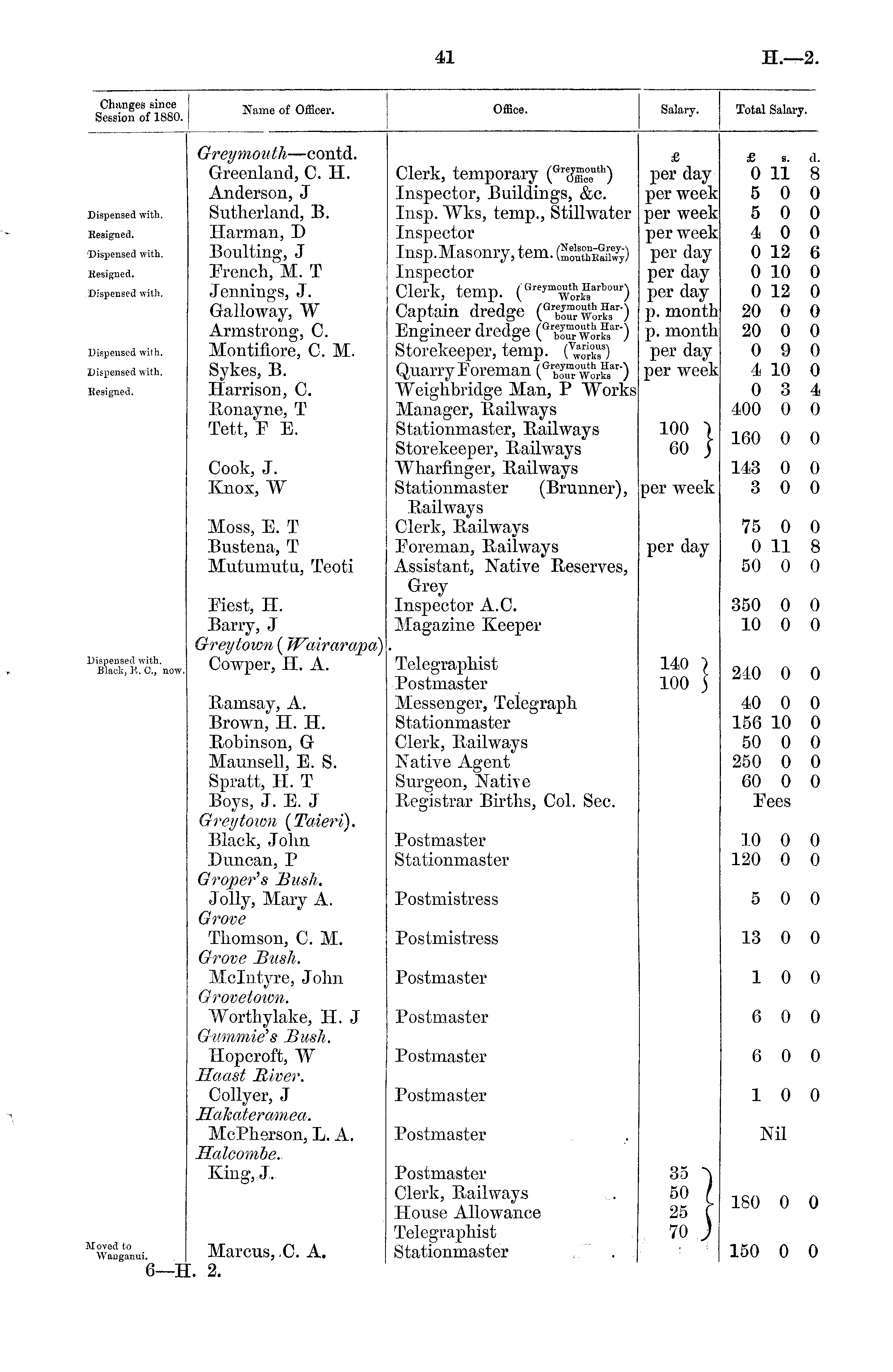 Changes since Session of 1880. Name of Officer. Office. Salary. Total Salary. Hspensed with. [esigned. Hspensed with. designed. >ispensed with. Greymouth —contd. Greenland, 0. II. Anderson, J Sutherland, B. Harman, D Boulting, J French, M. T Jennings, J. Galloway, W Armstrong, C. Montifiore, C. M. Sykes, B. Harrison, C. Ronayne, T Tett, F E. Clerk, temporary ( Gr35S! Ith) Inspector, Buildings, &c. Insp. Wks, temp., Stillwater Inspector Tn«n TVficnnvir torn /Nelson-Grey--. J_nSp.iV±dSQniy, tCm. UouthEailwyi Inspector Clerk, temp. ( Greymo^ t o h r garbou1') Captain dredge ( GrS h or ?r) Engineer dredge ( Gr b Tr°worS ar-) Storekeeper, temp. ( v w aS 9) UdliyiOlCmdn bour Works J Weighbridge Man, P "Works Manager, Railways Stationmaster, Railways Storekeeper, Railways Wharfinger, Railways Stationmaster (Brunner), Railways Clerk, Railways Foreman, Railways Assistant, Native Reserves, Grey Inspector A.C. Magazine Keeper £ per day per week per week per week per day per day per day p. month p. month per day per week £ s. 0 11 5 0 5 0 4 0 0 12 0 10 0 12 a. 8 0 0 0 6 0 0 Hspensed with. 20 0 20 0 0 9 4 10 0 3 400 0 0 0 0 0 4 0 lispensed with. !esigned. 100 | 60 j" 160 0 0 Cook, J. Knox, W per week 143 0 3 0 0 0 Moss, E. T Bustena, T Mutuniutu, Teoti per day 75 0 0 11 50 0 0 8 0 Eiest, H. Barry, J Greytown ( Wairarapd) Cowper, II. A. 350 0 10 0 0 0 • ispensecl with. Black, K. C, now. Telegraphist Postmaster Messenger, Telegraph Stationmaster Clerk, Railways Native Agent Surgeon, Native Registrar Births, Col. Sec. 140 I ioo 5 240 0 0 Ramsay, A. Brown, H. II. Robinson, G Maunsell, E. S. Spratt, II. T Boys, J. E. J Greytown {Taieri). Black, John Duncan, P Groper's Bush. Jolly, Mary A. Grove Thomson, C. M. Grove Bush. Mclntyre, John Grovetotvn. Worthylake, H. J Gummie's Bush. Hopcroft, W Haast River. Collyer, J Hakateramea. McPherson, L. A. Halcombe. King, J, Postmaster Stationmaster Postmistress Postmistress 40 0 156 10 50 0 250 0 60 0 Fees 10 0 120 0 5 0 13 0 0 0 0 0 0 0 0 0 0 Postmaster 1 0 0 Postmaster 6 0 0 Postmaster 6 0 0 Postmaster 1 0 0 Postmaster Nil Postmaster Clerk, Railways House Allowance Telegraphist Stationmaster ,. ' . 35 50 ( 25 f 70 J 180 0 0 Marcus, .0. A. 150 0 0 "ovccl to Wanganui.