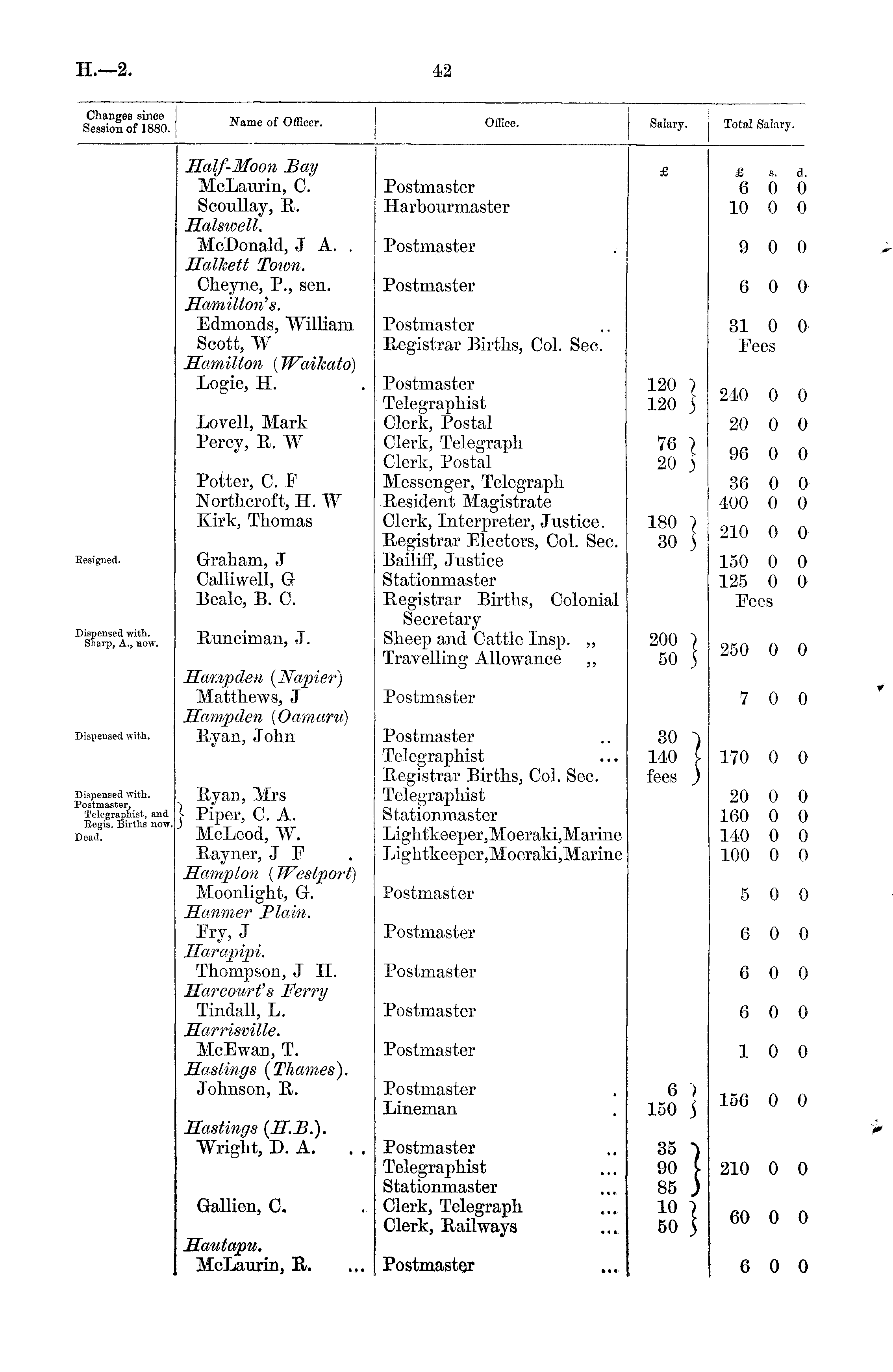 Changes since Session of 1880. Same of Officer. Office. Salary. Total Salary. Half-Moon Bay McLaurin, C. Scoullay, R. Halswell. McDonald, J A. . Halkett Town. Cheyne, P., sen. Hamilton's. Edmonds, "William Scott, W Hamilton (Waifeato) Logie, H. Postmaster Harbourmaster Postmaster Postmaster £ s. 6 0 10 0 9 0 6 0 d. 0 0 0 0 Postmaster Registrar Births, Col. Sec. 31 0 Fees 0 Lovell, Mark Percy, R. W Potter, C. F Northcroft, H. W Kirk, Thomas Postmaster Telegraphist Clerk, Postal Clerk, Telegraph Clerk, Postal Messenger, Telegraph Resident Magistrate Clerk, Interpreter, Justice. Registrar Electors, Col. Sec. Bailiff, Justice Stationmaster Registrar Births, Colonial Secretary Sheep and Cattle Insp. „ Travelling Allowance ,, 120 ) 120 J 76 I 20 ) 180 } 30 5 240 0 20 0 96 0 36 0 400 0 210 0 0 0 0 0 0 0 Resigned. Graham, J Calliwell, G: Beale, B. C. 150 0 125 0 Pees 0 0 Dispensed with. Sharp, A., aow. Runciman, J. 200 I 50 ) 250 0 0 Dispensed with. Hampdeu {Napier) Matthews, J Hampden (Oamaru) Ryan, John Postmaster 30 ■) 140 C fees ) 7 0 0 Dispensed with. Postmaster, Telegraphist, and Regis. Births now. Dead. Ryan, Mrs } Piper, C. A. McLeod, W. Rayner, J E Hampton ( Westport) Moonlight, Gr. Ilanmer Plain. Fry, J Harapipi. Thompson, J H. Harcourtfs Ferry Tindall, L. Harrisville. McEwan, T. Hastings [Thames). Johnson, R. Postmaster Telegraphist Registrar Births, Col. Sec. Telegraphist Stationmaster Lightkeeper,Moeraki,Marine Lightkeeper,Moeraki,Marine 170 0 20 0 160 0 140 0 100 0 0 0 0 0 0 Postmaster 5 0 0 Postmaster 6 0 0 Postmaster 6 0 0 Postmaster 6 0 0 Postmaster 1 0 0 Postmaster Lineman 6 ) 150 j 156 0 0 Hastings (H.B.). Wright, D. A. Postmaster Telegraphist Stationmaster Clerk, Telegraph Clerk, Railways 35 ") 90 £ 85 ) 10 } 50 ) 210 0 0 Gallien, C. 60 0 0 Hautapu. McLaurin, R. Postmaster 6 0 0