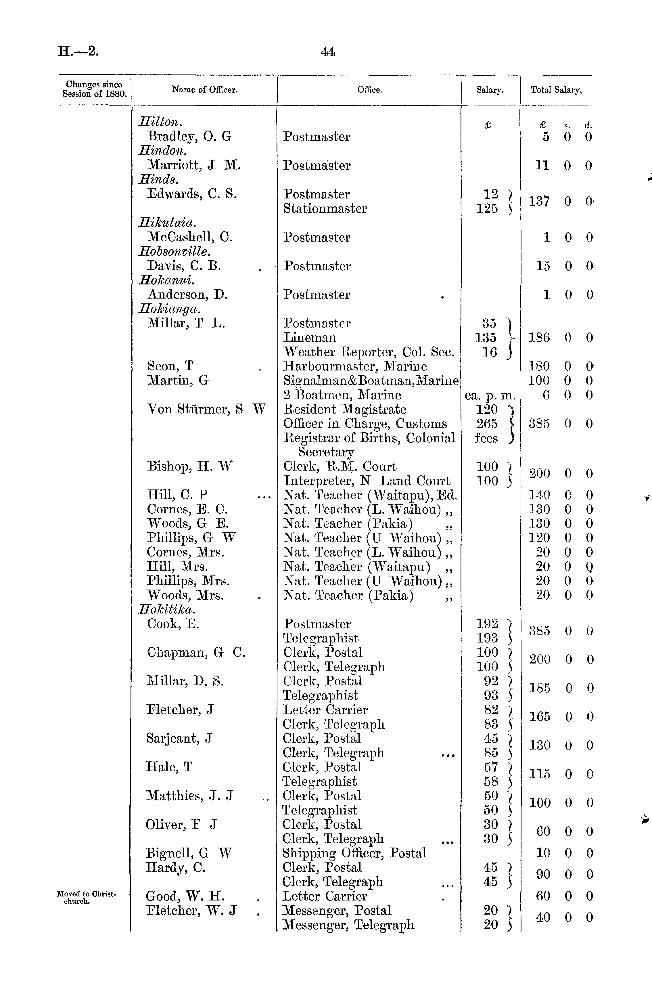 Changes since Session of 1880. Name of Officer. Office. Salary. Total Salary. Hilton. Bradley, O. G Hindon. Postmaster £ 5 s. d. 0 0 Marriott, J M. Hinds. Edwards, C. S. Postmaster 11 0 0 Postmaster Stationmaster 12 } 125 ) 137 0 0 Hikutaia. McCashell, C. Hobsonville. Davis, C. B. Hokanui. Anderson, D. HoManga. Millar, T L. Postmaster Postmaster 1 15 0 0 0 0 Postmaster 1 0 0 Seon, T Martin, G Von Sturmer, S W Bishop, H. W Postmaster Lineman Weather Reporter, Col. Sec. Harbourmaster, Marine Signalman&Boatman,Marine 2 Boatmen, Marine Iiesident Magistrate Officer in Charge, Customs Registrar of Births, Colonial Secretary Clerk, KM. Court Interpreter, N Land Court Nat. Teacher (Waitapu), Ed. Nat. Teacher (L. Waihou) „ Nat. Teacher (Pakia) „ Nat. Teacher (U Waihou) „ Nat. Teacher (L. Waihou) „ Nat. Teacher (Waitapu) ,, Nat. Teacher (U Waihou) „ Nat. Teacher (Pakia) ,, 35 ) 135 V 16 J ea. p. m. 120 ■) 265 [ fees ) 100 ) 100 ) 186 180 100 6 385 200 0 0 0 0 0 0 0 0 0 0 0 0 Hill, C. P Cornes, E. C. Woods, G E. Phillips, G W Cornes, Mrs. Hill, Mrs. Phillips, Mrs. Woods, Mrs. Hohitika. Cook, E. 140 130 130 120 20 20 20 20 0 0 0 0 0 0 0 0 0 0 o o 0 O 0 0 Chapman, G C. Millar, D. S. Fletcher, J Sarjeant, J Hale, T Postmaster Telegraphist Clerk, Postal Clerk, Telegraph Clerk, Postal Telegraphist Letter Carrier Clerk, Telegraph Clerk, Postal Clerk, Telegraph Clerk, Postal Telegraphist Clerk, Postal Telegraphist Clerk, Postal Clerk, Telegraph Shipping Officer, Postal Clerk, Postal Clerk, Telegraph Letter Carrier Messenger, Postal Messenger, Telegraph 192 > 193 5 100 7 ioo 5 92 } 93 ) 82 7 83 j 45 7 85 ) 57 ) 58 ) 50 7 50 ) 30 } 30 3 385 200 185 165 130 115 0 0 0 0 0 0 0 0 0 0 0 0 Matthies, J. J 100 0 0 Oliver, F J 60 0 0 Bignell, G W Hardy, C. 45 ) 45 ) 10 0 0 90 0 0 Moved to Christchurch. Good, W. H. Fletcher, W. J . 60 0 0 20 } 20 3 40 0 0
