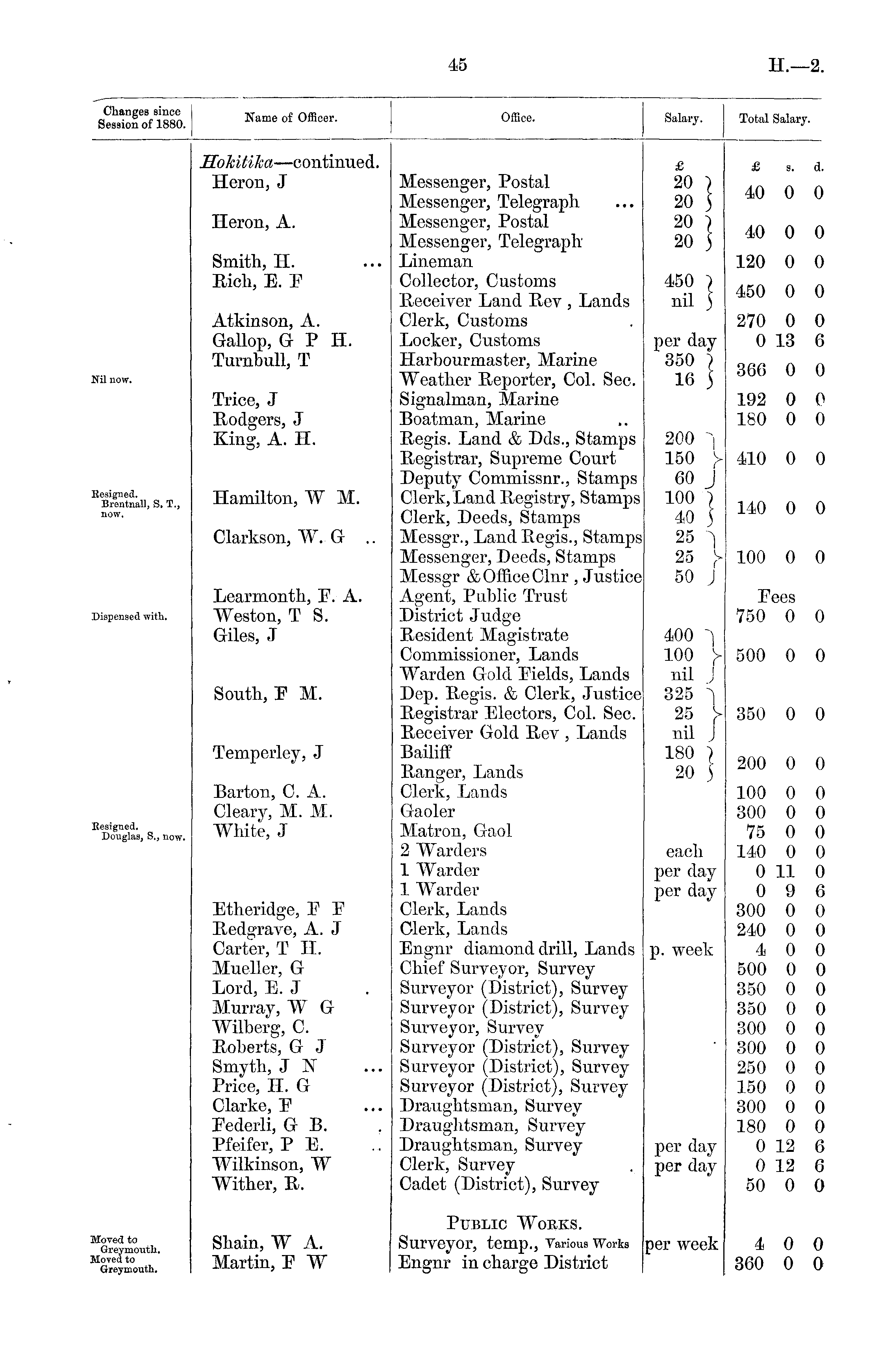 Changes since Session of 1880. Name of Officer. Office. Salary. Total Salary. Hokitika —continued. Heron, J Messenger, Postal Messenger, Telegraph Messenger, Postal Messenger, Telegraph Lineman Collector, Customs Receiver Land Rev , Lands Clerk, Customs Locker, Customs Harbourmaster, Marine Weather Reporter, Col. Sec. Signalman, Marine Boatman, Marine Regis. Land & Dds., Stamps Registrar, Supreme Court Deputy Commissnr., Stamps Clerk, Land Registry, Stamps Clerk, Deeds, Stamps Messgr., Land Regis., Stamps Messenger, Deeds, Stamps Messgr & Office Clnr , Justice Agent, Public Trust District Judge Resident Magistrate Commissioner, Lands Warden Gold Eields, Lands Dep. Regis. & Clerk, Justice Registrar Electors, Col. Sec. Receiver Gold Rev , Lands Bailiff Ranger, Lands Clerk, Lands Gaoler Matron, Gaol 2 Warders 1 Warder 1 Warder Clerk, Lands Clerk, Lands Engnr diamond drill, Lands Chief Surveyor, Survey Surveyor (District), Survey Surveyor (District), Survey Surveyor, Survey Surveyor (District), Survey Surveyor (District), Survey Surveyor (District), Survey Draughtsman, Survey Draughtsman, Survey Draughtsman, Survey Clerk, Survey Cadet (District), Survey £ 20 | 20 j 20 \ 20 J £ 8. 40 0 d. 0 Heron, A. 40 0 0 Smith, H. Rich, E. E 450 7 nil j 120 0 0 450 0 0 Atkinson, A. Gallop, G P H. Turnbull, T per day 350 } 16 5 270 0 0 13 0 6 366 0 0 Nil now. Trice, J Rodgers, J King, A. H. 200 "| 150 y 192 0 180 0 0 0 410 0 0 Eesigned. Brentnall, S. T., now. Hamilton, "W M. 60 J 100 } 40 J 25 ~) 25 )> 50 J 140 0 0 Clarkson, W. G .. 100 0 0 Dispensed with. Learmonth, E. A. Weston, T S. Giles, J Eees 400 ") 100 }■ nil J 325 25 ;> nil J 180 ) 20 3 750 0 0 500 0 0 South, E M. 350 0 0 Temperley, J 200 0 0 Barton, C. A. Cleary, M. M. White, J each per clay per day 100 0 300 0 75 0 140 0 0 11 0 9 300 0 240 0 4 0 500 0 350 0 350 0 300 0 300 0 250 0 150 0 300 0 180 0 0 12 0 12 50 0 0 0 0 0 0 6 0 0 0 0 0 0 0 0 0 0 0 0 6 6 0 Resigned. Douglas, S.j now. Etheridge, E E Redgrave, A. J Carter, T II. Mueller, G Lord, E. J Murray, W G Wilberg, C. Roberts, G J Smyth, J N Price, H. G Clarke, E Eederli, G B. Pfeifer, P E. Wilkinson, W Wither, R. p. week per day per day Moved to Greymoutll. Moved to Greymonth. Shain, W A. Martin, E W Public Works. Surveyor, temp., Various Works Engnr in charge District per week 4 0 360 0 0 0