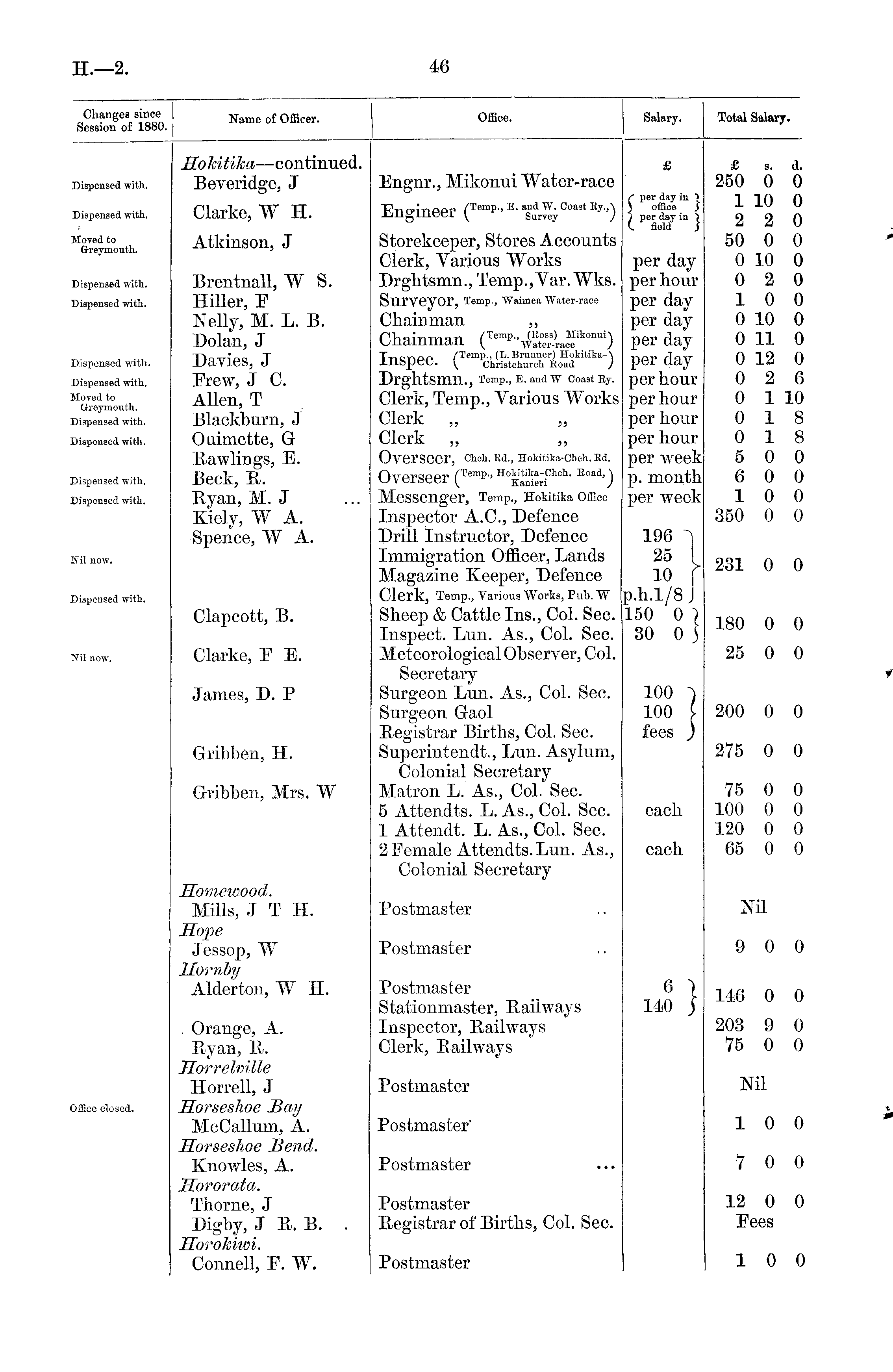Changes since Session of 1880. Name of Officer. Office. Salary. Total Salary. Hokltika —continued. Beveridge, J Engnr., Mikonui Water-race £ £ s. d. 250 0 0 1 10 0 2 2 0 50 0 0 0 10 0 0 2 0 10 0 0 10 0 0 11 0 0 12 0 0 2 6 0 1 10 0 18 0 18 Bispensed with. ( per day in "> ) office j ) per day in 7 (. field 5 Dispensed with. Clarke, W H. "Engineer f TemP->B-a"dw-CoastEM illlgmcil Survey J Moved to Greymouth. Atkinson, J Storekeeper, Stores Accounts Clerk, Various "Works Drghtsrnn., Temp.,Var. Wks. SiirVeVOr, Temp,, Wairnea AVater-raca Chainman „ PVioi-nmnn /Temp., (Boss) Mikonui'i onamman water-race ; Tncnpr> /Temp., (L. Brunner) Hokitika-\ XllSpeC. \_ Ohristelmrch Boad J Drglltsmn., Temp., E. and W Coast Ey. Clerk, Temp., Various Works Clerk „ „ Clerk „ Overseer, choh. na., uokitika-chch. Hd. Overseer ( Temp- Ho| iSe r " 1 phcl1' Eoaa>) Messenger, Temp., Hokitika Office Inspector A.C., Defence Drill Instructor, Defence Immigration Officer, Lands Magazine Keeper, Defence Clerk, Temp., Various Works, Pub. W Sheep & Cattle Ins., Col. Sec. Inspect. Lun. As., Col. Sec. Meteorological Observer, Col. Secretary Surgeon Lun. As., Col. Sec. Surgeon Gaol Registrar Births, Col. Sec. Superintend!, Lun. Asylum, Colonial Secretary Matron L. As., Col. Sec. 5 Attendts. L. As., Col. Sec. 1 Attendt. L. As., Col. Sec. 2 Female Attendts. Lun. As., Colonial Secretary per day per hour per day per day per day per day per hour per hour per hour per hour per week p. month per week Dispensed with. Dispensed with. Dispensed with. Dispensed with. Moved to Crreymouth. Dispensed with. Brentnall, W S. Hiller, F Nelly, M. L. B. Dolan, J Davies, J Frew, J C. Allen, T Blackburn, J Ouimette, G Rawlings, E. Beck, R. Ryan, M. J Kiely, W A. Spence, W A. Dispensed with. 5 0 0 6 0 0 10 0 350 0 0 Dispensed with. Dispensed with. Nil now. Dispensed with. Clapcott, B. 196 "I 25 I lo r p.h.l/8J 150 0 ) 30 0 ) 231 0 0 180 0 0 Nil now. Clarke, F E. 25 0 0 James, D. P 100 ) 100 [ fees ) 200 0 0 Gribben, H. 275 0 0 Gribben, Mrs. W each 75 0 0 100 0 0 120 0 0 65 0 0 each Homewood. Mills, J T H. Hope Jessop, W Hornby Alderton, W H. Postmaster Nil Postmaster 9 0 0 Orange, A. Ryan, 11. Tlorrelville Horrell, J Horseshoe Bay McCallum, A. Horseshoe Bend. Knowles, A. Hororata. Thorne, J Digby, J R. B. . Horokiwi. Connell, F. W. Postmaster Stationmaster, Railways Inspector, Railways Clerk, Railways 6 140 1 146 0 0 203 9 0 75 0 0 Postmaster Nil ■Office closed. Postmaster' 10 0 Postmaster 7 0 0 Postmaster Registrar of Births, Col. Sec. 12 0 0 Fees Postmaster 10 0