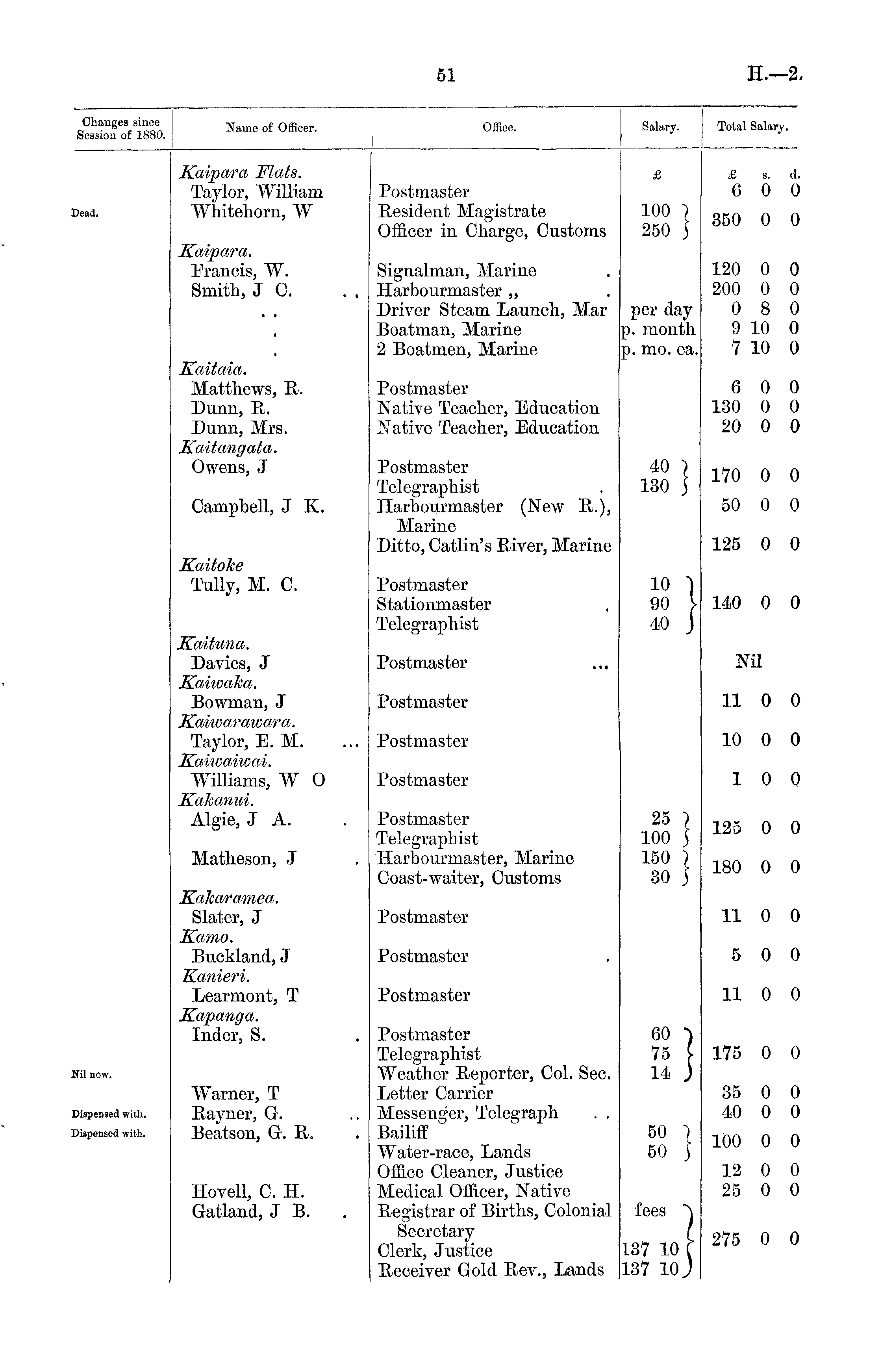 Changes since Session of 1880. Name of Officer. Office. Salary. Total Salary. Kaipara Flats. Taylor, William Whitehorn, W Postmaster Resident Magistrate Officer in Charge, Customs £ 100 ) 250 ) £ s. 6 0 d. 0 Dead. 350 0 0 Kaipara. Francis, W. Smith, J C. Signalman, Marine Harbourmaster „ Driver Steam Launch, Mar Boatman, Marine 2 Boatmen, Marine 120 0 200 0 0 8 9 10 7 10 0 0 0 0 0 per day p. month p. mo. ea. Kaitaia. Matthews, R. Dunn, R. Dunn, Mrs, Kaitangata. Owens, J Postmaster Native Teacher, Education Native Teacher, Education 6 0 130 0 20 0 0 0 0 Campbell, J K. Postmaster Telegraphist Harbourmaster (New R.), Marine Ditto, Catlin's River, Marine 40 } 130 J 170 0 50 0 0 0 Kaitoke Tully, M. C. 125 0 0 Postmaster Stationmaster Telegraphist 10 90 40 } 140 0 0 Kaituna. Davies, J Kaiwaka. Bowman, J Kaiwarawara. Taylor, E. M. Kakoaiwai. Williams, W O Kakanui. Algie, J A. Postmaster Postmaster Postmaster Nil 11 0 10 0 0 0 Postmaster 1 0 0 Matheson, J Postmaster Telegraphist Harbourmaster, Marine Coast-waiter, Customs 25 ) 100 5 150 } 30 ) 125 0 180 0 0 0 Kakaramea. Slater, J Kamo. Bucldand, J Kanieri. Learmont, T Postmaster Postmaster 11 0 5 0 0 0 Postmaster 11 0 0 Kapcmga. Inder, S. Postmaster Telegraphist Weather Reporter, Col. Sec. Letter Carrier Messenger, Telegraph . . Bailiff Water-race, Lands Office Cleaner, Justice Medical Officer, Native Registrar of Births, Colonial SecretaryClerk, Justice Receiver Gold Rev., Lands 60 ") 75 14 ) 175 0 0 Nil now. Dispensed with. Warner, T Rayner, G. Beatson, G. R. 50 ") 50 J 35 0 40 0 0 0 Dispensed with. 100 0 0 Hovell, C. H. Gatland, J B. fees "\ 137 10 C 137 10J 12 0 25 0 0 0 275 0 0