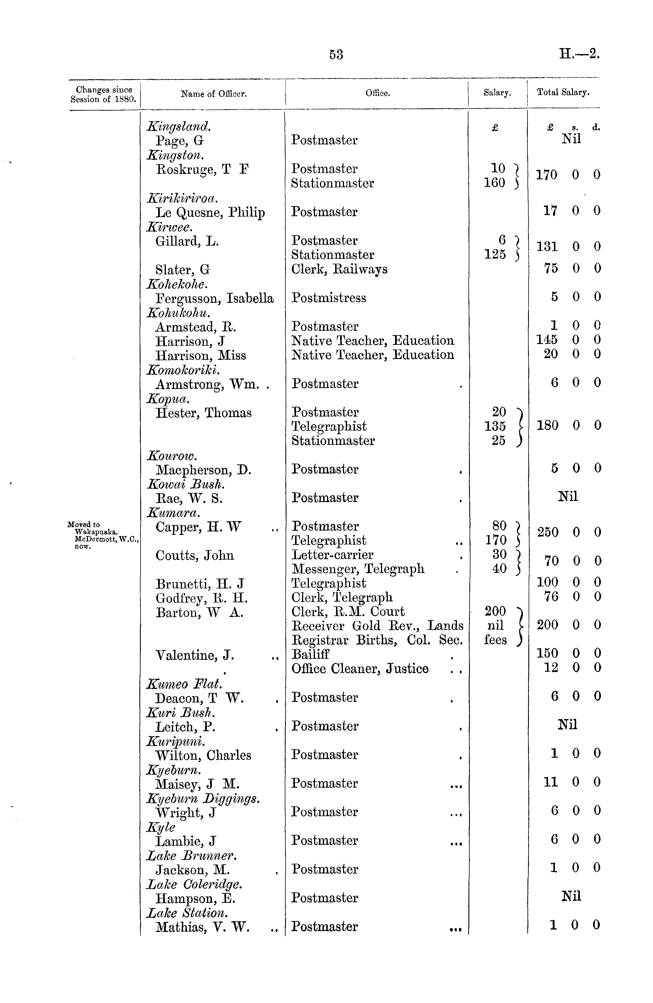 Changes since Session of 1880. Name of Officer. Office. Salary. Total Salary. Kingsland. Page, G Kingston. Roskruge, T P Postmaster £ 10 ) 160 ) £ 8. Nil d. Postmaster Stationmaster 170 0 0 Kirikiriroa. Le Quesne, Pliilip Kirwee. Gillard, L. Postmaster 6 ~> 125 ) 17 0 0 Postmaster Stationmaster Clerk, Railways 131 0 0 Slater, G Kohekohe. Pergusson, Isabella Kohukohu. Armstead, R. Harrison, J Harrison, Miss Komokoriki. Armstrong, ¥m. . Kopua. Hester, Thomas Postmistress Postmaster Native Teacher, Education Native Teacher, Education 75 0 5 0 1 0 145 0 20 0 0 0 0 0 0 Postmaster 6 0 0 Postmaster Telegraphist Stationmaster 20 135 25 ] 180 0 0 Kourow. Macpherson, D. Kowai Bush. Rae, W. S. Kumara. Capper, H. W Postmaster Postmaster 5 0 Nil 0 Moved to Wakapuaka. McDermott, W.C., now. Coutts, John Brunetti, H. J Godfrey, II. H. Barton, W A. Postmaster Telegraphist Letter-carrier Messenger, Telegraph Telegraphist Clerk, Telegraph Clerk, KM. Court Receiver Gold Rev., Lands Registrar Births, Col. Sec. Bailiff Office Cleaner, Justice . . 80 } 170 J 30 } 40 ) 200 nil [ fees ) 250 0 70 0 100 0 76 0 0 0 0 0 200 0 0 Valentine, J. 150 0 12 0 0 0 Eumeo Flat. Deacon, T W. Kuri Bush. Leitch, P. Kuripuni. Wilton, Charles Kyeburn. Maisey, J M. Kyeburn Diggings. Wright, J Kyle Lambie, J Lake Brunner. Jackson, M. Lake Coleridge. Hampson, E. Lake Station. Mathias, V. W. .. Postmaster Postmaster Postmaster Postmaster Postmaster 6 0 Nil 1 0 11 0 6 0 0 0 0 0 Postmaster 6 0 0 Postmaster 1 0 0 Postmaster Nil Postmaster ... 1 0 0