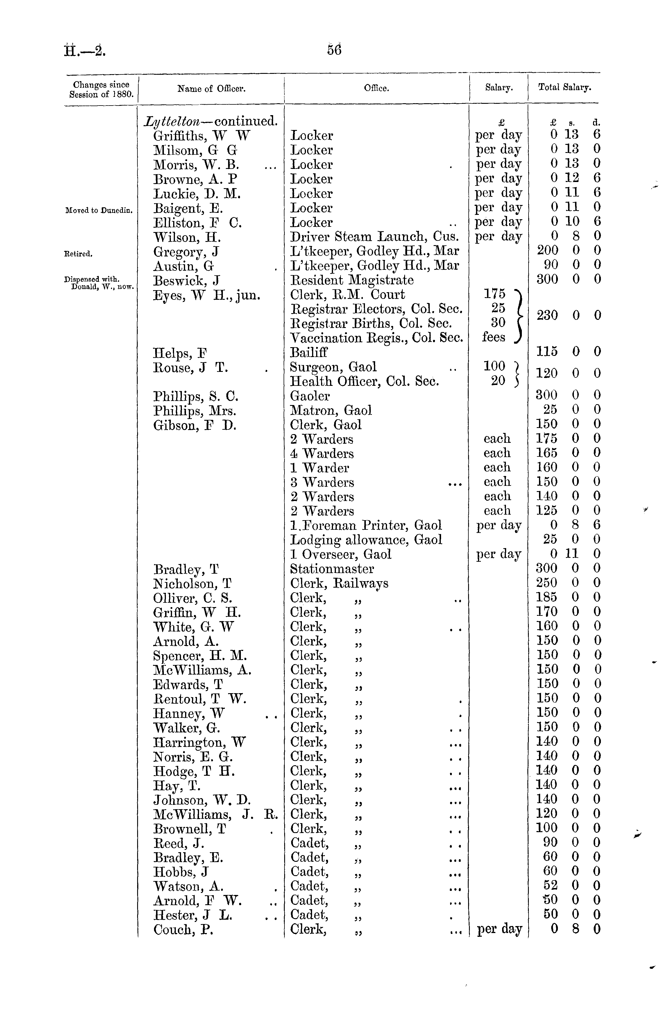 Changes since Session of 1880. Name of Officer. Office. Salary. Total Salary. Iloyed to JDunedin. Lyttelton — continued. Griffiths, W W Milsom, G G Morris, W. B. Browne, A. P Luckie, D. M. Baigent, E. Elliston, E C. Wilson, H. Gregory, J Austin, G Beswick, J Eyes, W H.,jun. Locker Locker Locker Locker Locker Locker Locker Driver Steam Launch, Cus. L'tkeeper, Godley Hd., Mar L'tkeeper, Godley Hd., Mar Resident Magistrate Clerk, R.M. Court Registrar Electors, Col. Sec. Registrar Births, Col. Sec. Vaccination Regis., Col. Sec. Bailiff Surgeon, Gaol Health Officer, Col. Sec. Gaoler Matron, Gaol Clerk, Gaol 2 Warders 4 Warders 1 Warder 3 Warders 2 Warders 2 Warders 1. Foreman Printer, Gaol Lodging allowance, Gaol 1 Overseer, Gaol Stationmaster Clerk, Railways Clerk, „ Clerk, „ Clerk, „ Clerk, „ Clerk, „ Clerk, „ Clerk, „ Clerk, „ Clerk, ,, Clerk, ,, Clerk, „ Clerk, „ Clerk, „ . . Clerk, ,, Clerk, „ Clerk, „ Clerk, „ Cadet, „ . . Cadet, „ Cadet, „ Cadet, ,, Cadet, „ Cadet, „ Clerk, „ £ per day per day per day per day per day per day per day per day £ s. 0 13 0 13 0 13 0 12 0 11 0 11 0 10 0 8 200 0 90 0 300 0 d. 6 0 0 6 6 0 6 0 0 0 0 Retired. Dispensed with. Donald, W., now. 175 "\ 25 / 30 f fees ) 230 0 0 Helps, E Rouse, J T. 100 ) 20 ) 115 0 0 120 0 0 Phillips, S. C. Phillips, Mrs. Gibson, E D. Bradley, T Nicholson, T Olliver, C. S. Griffin, W H. White, G. W Arnold, A. Spencer, H. M. McWilliams, A. Edwards, T Rentoul, T W. Hanney, W . . Walker, G. Harrington, W Norris, E. G. Hodge, T H. Hay, T. Johnson, W. D. McWilliams, J. R. Brownell, T Reed, J. Bradley, E. Hobbs, J Watson, A. Arnold, E W. Hester, J L. Couch, P. each each each each each each per day per day 300 0 25 0 150 0 175 0 165 0 160 0 150 0 140 0 125 0 0 8 25 0 0 11 300 0 250 0 185 0 170 0 160 0 150 0 150 0 150 0 150 0 150 0 150 0 150 0 140 0 140 0 140 0 140 0 140 0 120 0 100 0 90 0 60 0 60 0 52 0 •50 0 50 0 0 8 0 0 0 0 0 0 0 0 0 6 0 0 0 0 0 0 0 0 0 0 0 0 0 0 0 0 0 0 0 0 0 0 0 0 0 0 0 0 per day
