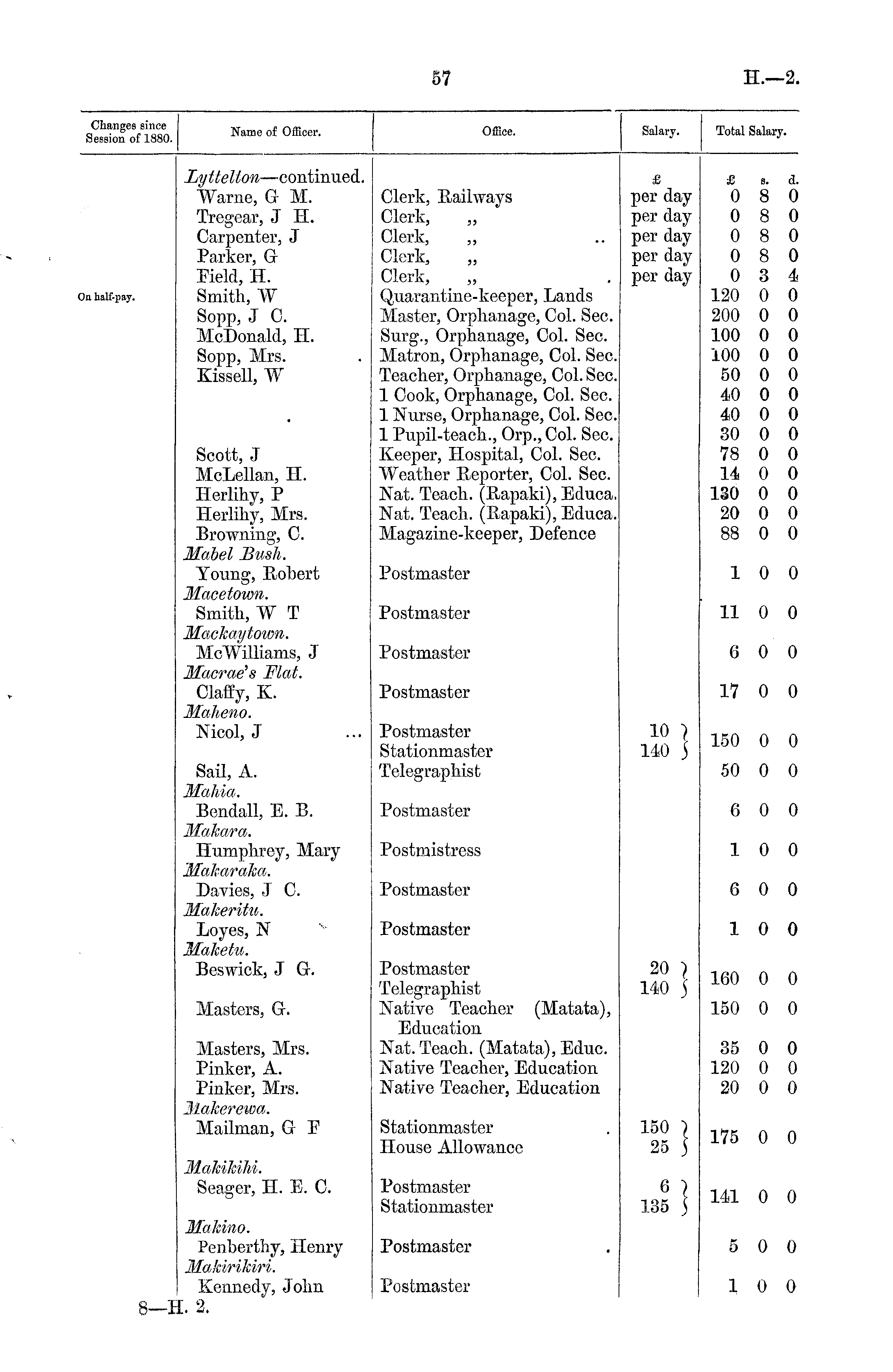 Changes since Session of 1880. Name of Officer. Office. Salary. Total Salary. Lyttelton —continued. Warne, G M. Tregear, J H. Carpenter, J Parker, G Field, H. Smith, W Sopp, J C. McDonald, H. Sopp, Mrs. Kissell, W Clerk, Railways Clerk, ,, Clerk, ,, Clerk, Clerk, „ Quarantine-keeper, Lands Master, Orphanage, Col. Sec. Surg., Orphanage, Col. Sec. Matron, Orphanage, Col. Sec. Teacher, Orphanage, Col. Sec. 1 Cook, Orphanage, Col. Sec. 1 Nurse, Orphanage, Col. Sec. 1 Pupil-teach., Orp., Col. Sec. Keeper, Hospital, Col. Sec. Weather Reporter, Col. Sec. Nat. Teach. (Rapaki), Educa, Nat. Teach. (Rapaki), Educa. Magazine-keeper, Defence £ per day per day per day per day per day £ 0 0 0 0 0 120 200 8. 8 8 8 8 3 0 0 a. 0 0 0 0 4 0 0 la half-pay. Scott, J McLellan, H. Herlihy, P Herlihy, Mrs. Browning, C. Mabel Bush. Young, Rohert Macetown. Smith, W T Mackaytown. Me Williams, J Macrae's Flat. Claffy, K. Maheno. Nicol, J 100 100 50 40 40 30 78 14 130 20 88 0 0 0 0 0 0 0 0 0 0 0 0 0 0 0 0 0 0 0 0 0 0 Postmaster 1 0 0 Postmaster 11 0 0 Postmaster 6 0 0 Postmaster 17 0 0 Postmaster Stationmaster Telegraphist 10 ) 140 ) 150 0 0 Sail, A. Mahia. BendalL E. B. Mahara. 50 0 0 Postmaster 6 0 0 Humphrey, Mary Makaraka. Davies, J C. Maker itu. Loyes, N Maketu. Beswick, J G. Postmistress 1 0 0 Postmaster 6 0 0 Postmaster 1 0 0 Masters, G. Postmaster Telegraphist Native Teacher (Matata), Education Nat. Teach. (Matata), Educ. Native Teacher, Education Native Teacher, Education 20 ) 140 ) 160 150 35 120 20 0 0 0 0 0 0 0 0 0 0 Masters, Mrs. Pinker, A. Pinker, Mrs. Mafcerewa. Mailman, G F Stationmaster House Allowance 150 I 25 ) 175 0 0 Maltihild. Seager, H. E. C. Postmaster Stationmaster 6 ) 135 ) 141 0 0 Makino. Penberthy, Henry Makirikiri. Kennedy, John Postmaster 5 0 0 Postmaster 1 0 0