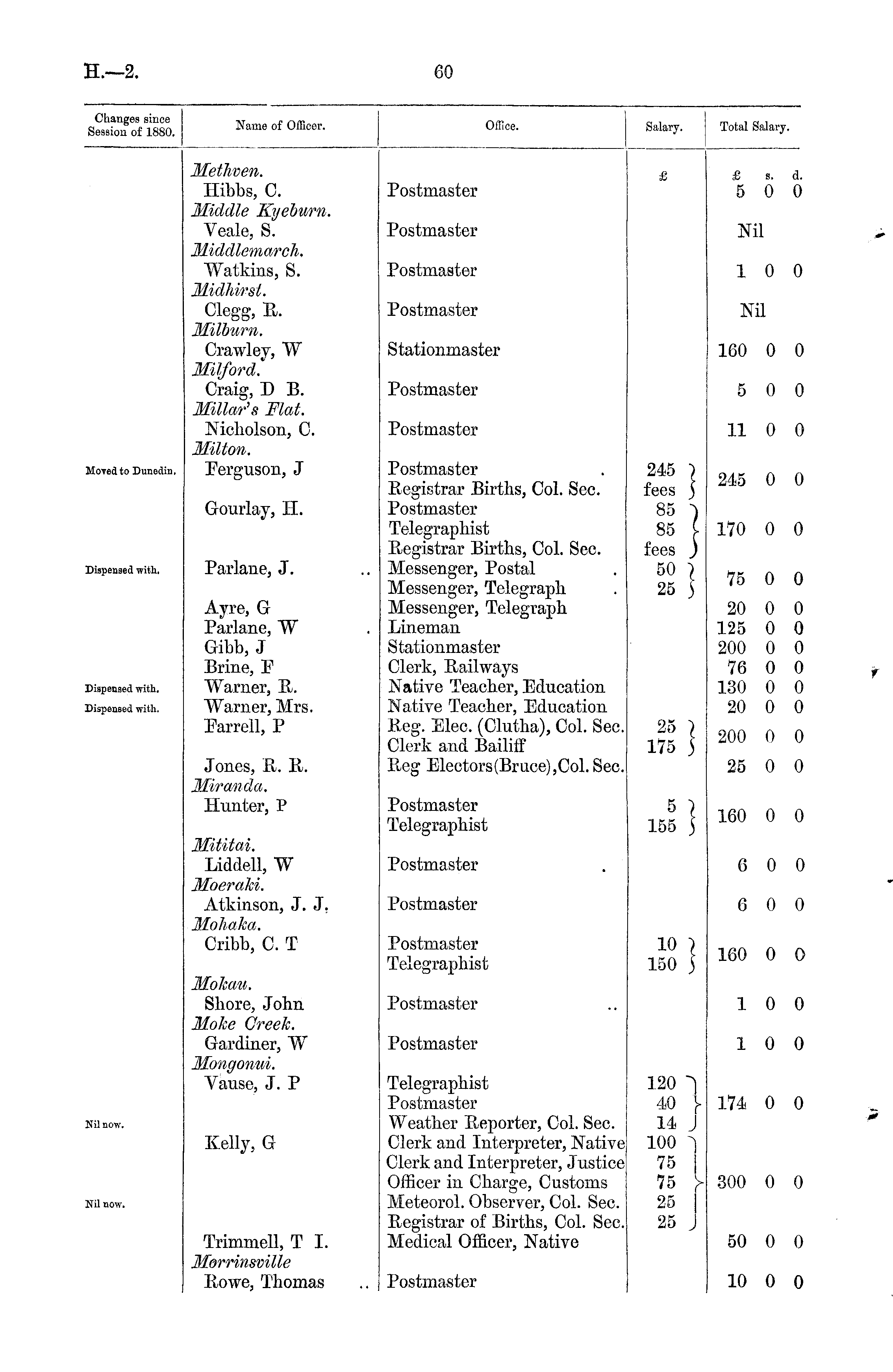 Changes since Session of 1880. Name of Officer. Office. Salary. Total Salary. Methven. Hibbs, 0. Middle Kyehurn. Veale, S. Postmaster £ s. 5 0 d. 0 Postmaster Nil Middlemarch. Watkins, S. Midhirsl. Clegg, R. Milburn. Postmaster Postmaster 1 0 0 Nil Crawley, W Milford. Craig, D B. Millar's Flat. Nicholson, 0. Milton. Ferguson, J Stationmaster 160 0 0 Postmaster 5 0 0 Postmaster 11 0 0 MoTed to Dunedin, Dispensed with. Gourlay, H. Parlane, J. Ayre, G Parlane, W Gibb, J Brine, E Warner, Bj. Warner, Mrs. Earrell, P Postmaster Registrar Births, Col. Sec. Postmaster Telegraphist Registrar Births, Col. Sec. Messenger, Postal Messenger, Telegraph Messenger, Telegraph Lineman Stationmaster Clerk, Railways Native Teacher, Education Native Teacher, Education Reg. Elec. (Clutha), Col. Sec. Clerk and Bailiff Reg Electors (Bruce),Col. Sec. 245 -) fees j 85 -) 85 C fees ) 50 \ 25 J 245 0 170 0 75 0 20 0 0 0 0 0 125 0 200 0 76 0 130 0 20 0 0 0 0 0 0 Dispensed with. Dispensed with. Jones, R. R. Miranda. Hunter, P 25 I 175 ) 200 0 0 25 0 0 Postmaster Telegraphist 5 I 155 ) 160 0 0 Mititai. Liddell, W Moeraki. Atkinson, J. J. Moliaka. Cribb, C. T Postmaster Postmaster 6 0 6 0 0 0 Postmaster Telegraphist 10 | 150 J 160 0 0 Mokau. Shore, John Moke Greek. Gardiner, W Mongonui. Vause, J. P Postmaster Postmaster 1 0 1 0 0 0 Nil now. Kelly, G Telegraphist Postmaster Weather Reporter, Col. Sec. Clerk and Interpreter, Native Clerk and Interpreter, Justice Officer in Charge, Customs Meteorol. Observer, Col. Sec. Registrar of Births, Col. Sec. Medical Officer, Native 120 ~) 40 V 14 J 100 75 | 75 )- 25 25 J 174 0 300 0 0 0 Nil now. Triminell, T I. Morrinsville Rowe, Thomas 50 0 0 Postmaster 10 0 0