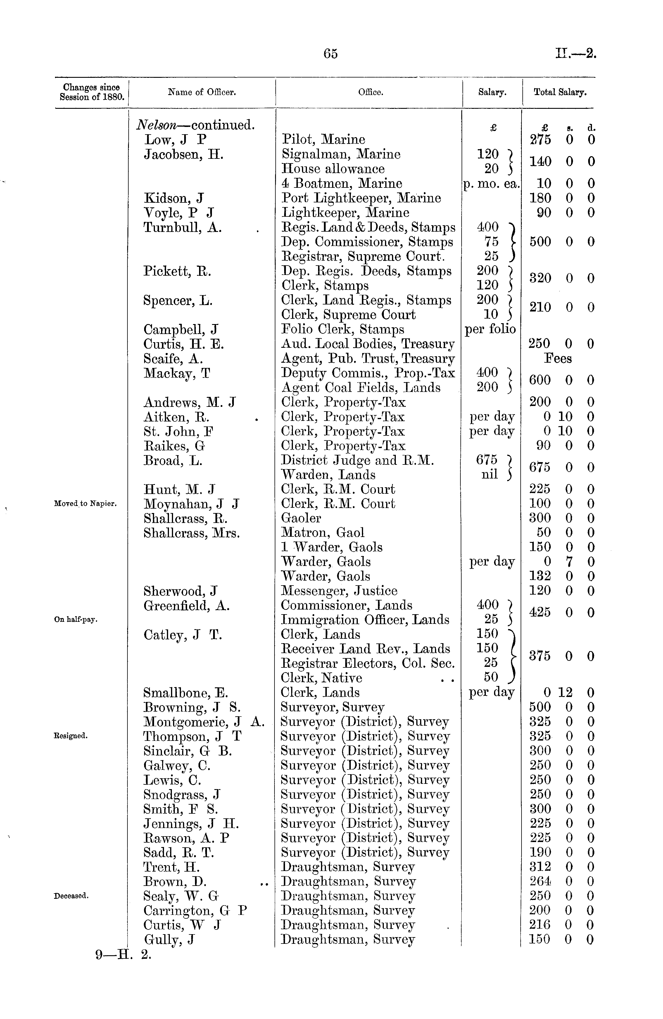Changes since Session of 1880. Name of Officer. Office. Salary. Total Salary. Nelson —continued. Low, J P Jacobsen, H. Pilot, Marine Signalman, Marine House allowance 4 Boatmen, Marine Port Lightkeeper, Marine Lightkeeper, Marine Regis. Land & Deeds, Stamps Dep. Commissioner, Stamps Registrar, Supreme Court. Dep. Regis. Deeds, Stamps Clerk, Stamps Clerk, Land Regis., Stamps Clerk, Supreme Court Polio Clerk, Stamps Aud. Local Bodies, Treasury Agent, Pub. Trust, Treasury Deputy Comrnis., Prop.-Tax Agent Coal Fields, Lands Clerk, Property-Tax Clerk, Property-Tax Clerk, Property-Tax Clerk, Property-Tax District Judge and R.M. Warden, Lands Clerk, R.M. Court Clerk, R.M. Court Gaoler Matron, Gaol 1 Warder, Gaols Warder, Gaols Warder, Gaols Messenger, Justice Commissioner, Lands Immigration Officer, Lands Clerk, Lands Receiver Land Rev., Lands Registrar Electors, Col. Sec. Clerk, Native . . Clerk, Lands Surveyor, Survey Surveyor (District), Survey Surveyor (District), Survey Surveyor (District), Survey Surveyor (District), Survey Surveyor (District), Survey Surveyor (District), Survey Surveyor (District), Survey Surveyor (District), Survey Surveyor (District), Survey Surveyor (District), Survey Draughtsman, Survey Draughtsman, Survey Draughtsman, Survey Draughtsman, Survey Draughtsman, Survey . Draughtsman, Survey £ 120 ) 20 ) £ b. 275 0 d. 0 140 0 0 Kidson, J Voyle, P J Turnbull, A. p. mo. ea. 10 0 180 0 90 0 0 0 0 Pickett, R. 400 ~) 75 25 ) 200 \ 120 3 200 ) io 3 per folio 500 0 320 0 0 0 Spencer, L. 210 0 0 Campbell, J Curtis, H. E. Scaife, A. Mackay, T 400 ■) 200 3 250 0 Pees 0 600 0 0 Andrews, M. J Aitken, R. St. John, P Raikes, G Broad, L. per day per day 200 0 0 10 0 10 90 0 0 0 0 0 675 ) nil 3 675 0 0 loved to Napier. Hunt, M. J Moynahan, J J Shallcrass, R. Shallcrass, Mrs. 225 0 100 0 300 0 50 0 150 0 0 7 132 0 120 0 0 0 0 0 0 0 0 0 Sherwood, J Greenfield, A. per day >n half-pay. Catley, J T. 400 ) 25 ) 150 150 / 25 C 50 ) per day 425 0 375 0 0 0 designed. Smallbonc, E. Browning, J S. Montgomerie, J A. Thompson, J T Sinclair, G B. Galwey, C. Lewis, C. Snodgrass, J Smith, P S. Jennings, J H. Rawson, A. P Sadd, R. T. Trent, PL Brown, D. Sealy, W. G Carrington, G P Curtis, W J Gully, J 0 12 500 0 325 0 325 0 300 0 250 0 250 0 250 0 300 0 225 0 225 0 190 0 312 0 264 0 250 0 200 0 216 0 150 0 0 0 0 0 0 0 0 0 0 0 0 0 0 0 0 0 0 0 teceaaed.