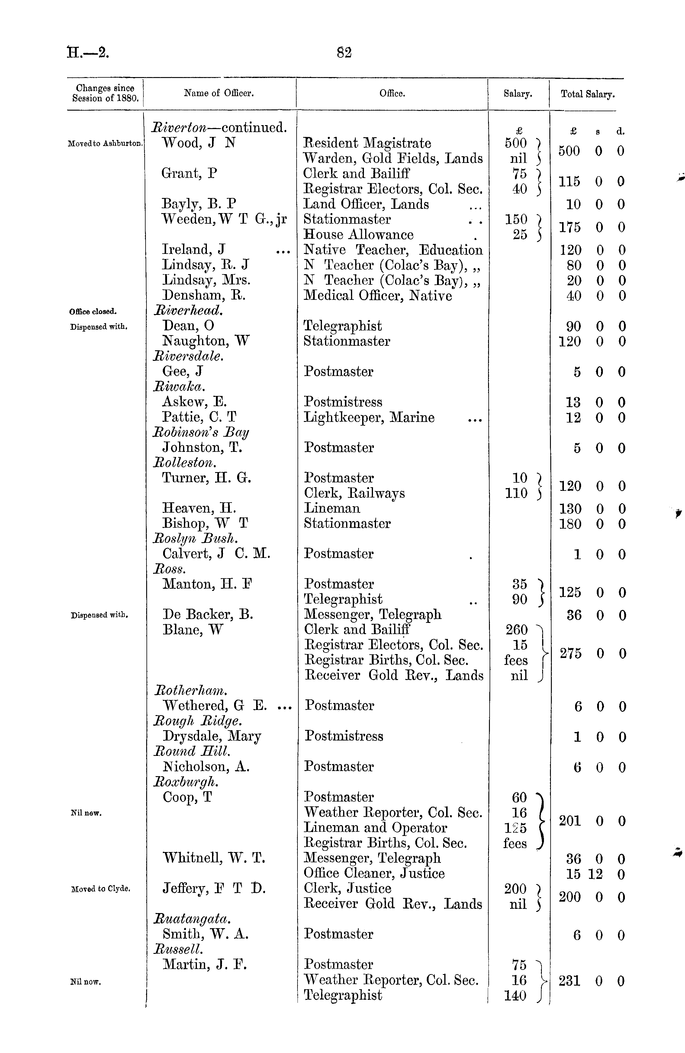 Charges Bince Session of 1880. Name of Officer. Office. Salary. Total Salary. Biverton —continued. Wood, J N Resident Magistrate Warden, Gold Eields, Lands Clerk and Bailiff Registrar Electors, Col. Sec. Land Officer, Lands Stationmaster . . House Allowance Native Teacher, Education N Teacher (Colac's Bay), „ N Teacher (Colac's Bay), „ Medical Officer, Native £ 500 ) nil ) 75 1 40 J £ s d. Moved to AsMmrton. 500 0 0 Grant, P 115 0 0 Bayly, B. P Weeden,W T G.,jr 150 } 25 J 10 0 0 175 0 0 Ireland, J Lindsay, R. J Lindsay, Mrs. Densham, R. Biverhead. Dean, O Naughton, W Biversdale. 120 0 80 0 20 0 40 0 0 0 0 0 Office closed. Telegraphist Stationmaster 90 0 120 0 0 0 Dispensed with. Gee, J Bhvaka. Askew, E. Pattie, C. T Bohinsorus Bay Johnston, T. Bolleston. Turner, H. G. Postmaster 5 0 0 Postmistress Lightkeeper, Marine 13 0 12 0 0 0 Postmaster 5 0 0 Heaven, H. Bishop, W T Boslyn Bush. Calvert, J C. M. Boss. Postmaster Clerk, Railways Lineman Stationmaster 10 ) no 5 120 0 130 0 180 0 0 0 0 Postmaster 1 0 0 Dispensed with. Manton, H. E De Backer, B. Blane, W Postmaster Telegraphist Messenger, Telegraph Clerk and Bailiff Registrar Electors, Col. Sec. Registrar Births, Col. Sec. Receiver Gold Rev., Lands 35 ") 90 j 260 15 I fees f nil J 125 0 36 0 0 0 275 0 0 Botherham. Wethered, G E. ... Bough Bidge. Drysdale, Mary Bound Hill. Postmaster 6 0 0 Postmistress 1 0 0 Nicholson, A. Roxburgh. Coop, T Postmaster (5 0 0 Nil now. Whitnell, W. T. Postmaster Weather Reporter, Col. Sec. Lineman and Operator Registrar Births, Col. Sec. Messenger, Telegraph Office Cleaner, Justice Clerk, Justice Receiver Gold Rev., Lands 60 "\ 16 I 125 C fees J 201 0 36 0 15 12 0 0 0 Moved to Clyde. Jeffery, E T D. 200 ) nil J 200 0 0 Buatangata. Smith, W. A. Russell. Martin, J. E. Postmaster 75 "I 16 I 140 J 6 0 0 Postmaster Weather Reporter, Col. Sec. Telegraphist 231 0 0 Nil now.