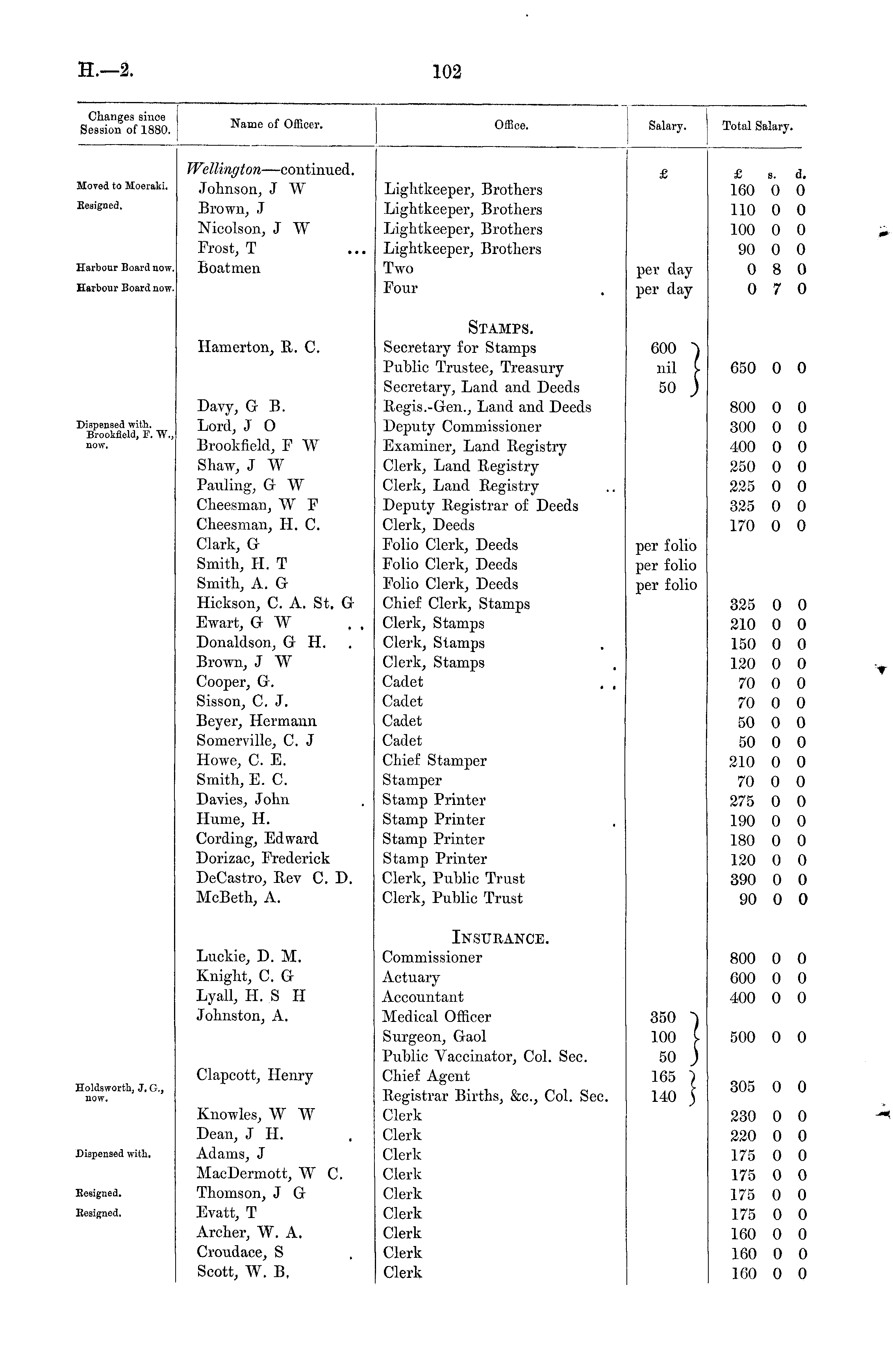 Changes since Session of 1880. Name of Officer. Office. Salary. Total Salary. Wellington —continued. £ 160 B. 0 d. 0 Moved to Moeraki. Resigned. Johnson, J W Brown, J Lightkeeper, Brothers Lightkeeper, Brothers Lightkeeper, Brothers Lightkeeper, Brothers 110 0 0 Nicolson, J W 100 0 0 Harbour Board now Frost, T 90 0 0 Boatmen Two per day 0 8 0 Harbour Board now. Four per day 0 7 0 Hamerton, R. C. Stamps. Secretary for Stamps Public Trustee, TreasurySecretary, Land and Deeds Regis.-Gen., Land and Deeds 600 ~) nil C 50 j 650 0 0 Dispensed with. Brookfleld, P. W., now. Davy, G B. Lord, J O Brookfield, F W Shaw, J W Pauling, G W Deputy Commissioner Examiner, Land Registry 800 300 400 0 0 0 0 0 0 Clerk, Land Registry Clerk, Land Registry Deputy Registrar of Deeds Clerk, Deeds Folio Clerk, Deeds Folio Clerk, Deeds 250 0 0 225 0 0 Cheesman, W F 325 0 0 Cheesman, H. C. 170 0 0 Clark, G Smith, H. T per folio per folio 325 0 0 Smith, A. G Hickson, C. A. St. G Ewart, G W Donaldson, G H. Brown, J W Folio Clerk, Deeds Chief Clerk, Stamps per folio Clerk, Stamps 210 0 0 Clerk, Stamps 150 0 0 Clerk, Stamps , Cadet , , 120 0 0 Cooper, G. 70 0 0 Sisson, C. J. Cadet 70 0 0 Beyer, Hermann Cadet 50 0 0 Somerville, C. J Howe, C. E. Smith, E. C. Cadet 50 0 0 Chief Stamper 210 0 0 Stamper 70 0 0 Davies, John Stamp Printer 275 0 0 Hume, H. Stamp Printer 190 0 0 Cording, Edward Stamp Printer 180 0 0 Dorizac, Frederick DcCastro, Rev CD. Stamp Printer Clerk, Public Trust 120 390 0 0 0 0 McBeth, A. Clerk, Public Trust 90 0 0 Luckie, D. M. Knight, C. G Lyall, H. S II Johnston, A. Insurance. 800 0 0 Commissioner Actuary Accountant 600 0 0 400 0 0 Medical Officer 350 ■) 100 C 50 ) 165 ) 140 ) Surgeon, Gaol Public Vaccinator, Col. Sec. 500 0 0 Clapcott, Henry Chief Agent 305 0 0 Holdsworth, J. G., now. Knowles, W W Dean, J H. Registrar Births, &c., Col. Sec. 230 0 0 Clerk .Dispensed with. Clerk 220 0 0 Adams, J Clerk 175 0 0 MacDermott, W C. Clerk 175 0 0 Resigned, Thomson, J G Clerk 175 0 0 Resigned. Evatt, T Clerk 175 0 0 Archer, W. A. Clerk 160 0 0 Croudace, S Scott, W. B. Cleric 160 0 0 Clerk 160 0 0