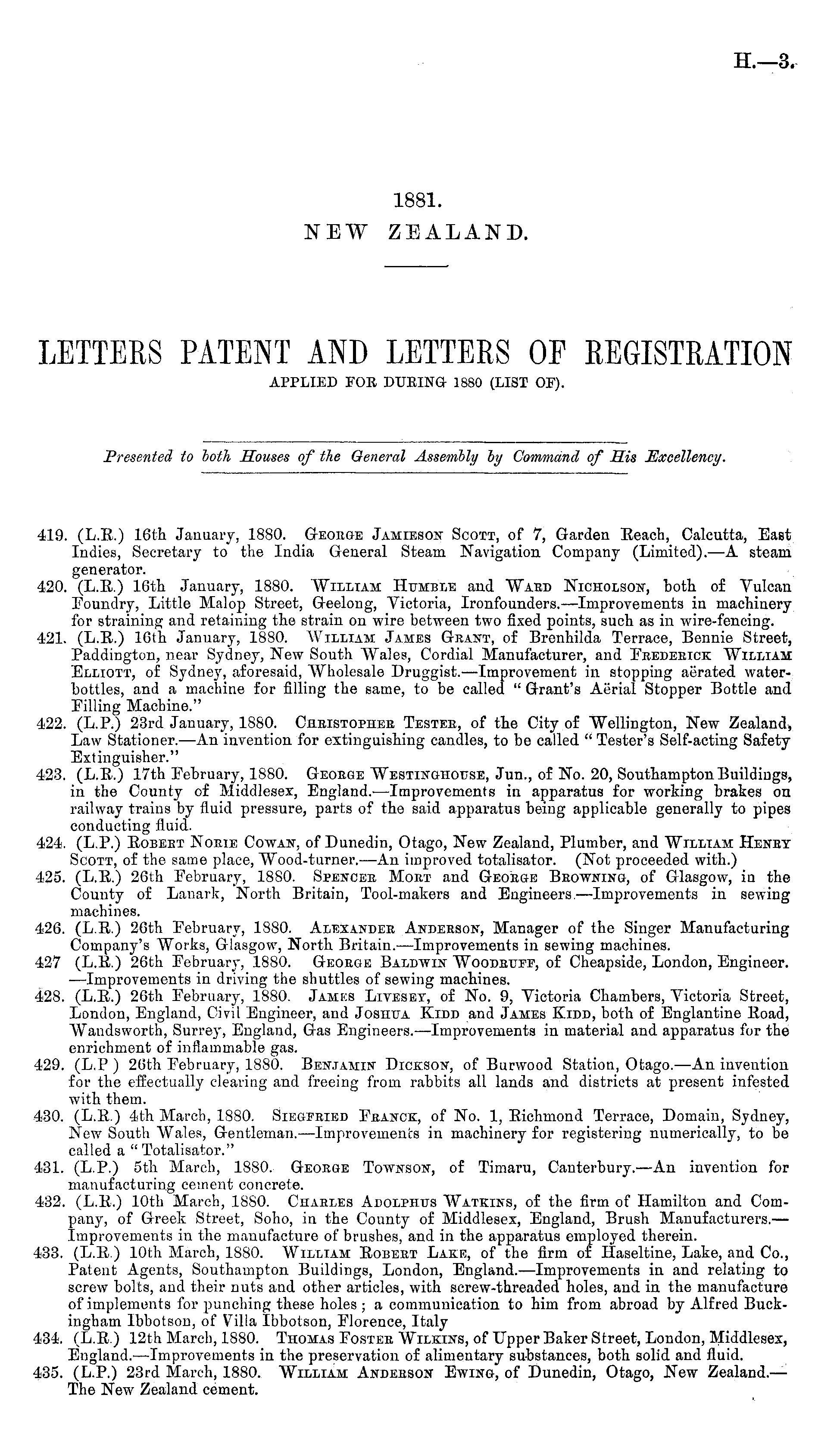 LETTERS PATENT AND LETTERS OF REGISTRATION APPLIED FOR DURING 1880 (LIST OF).