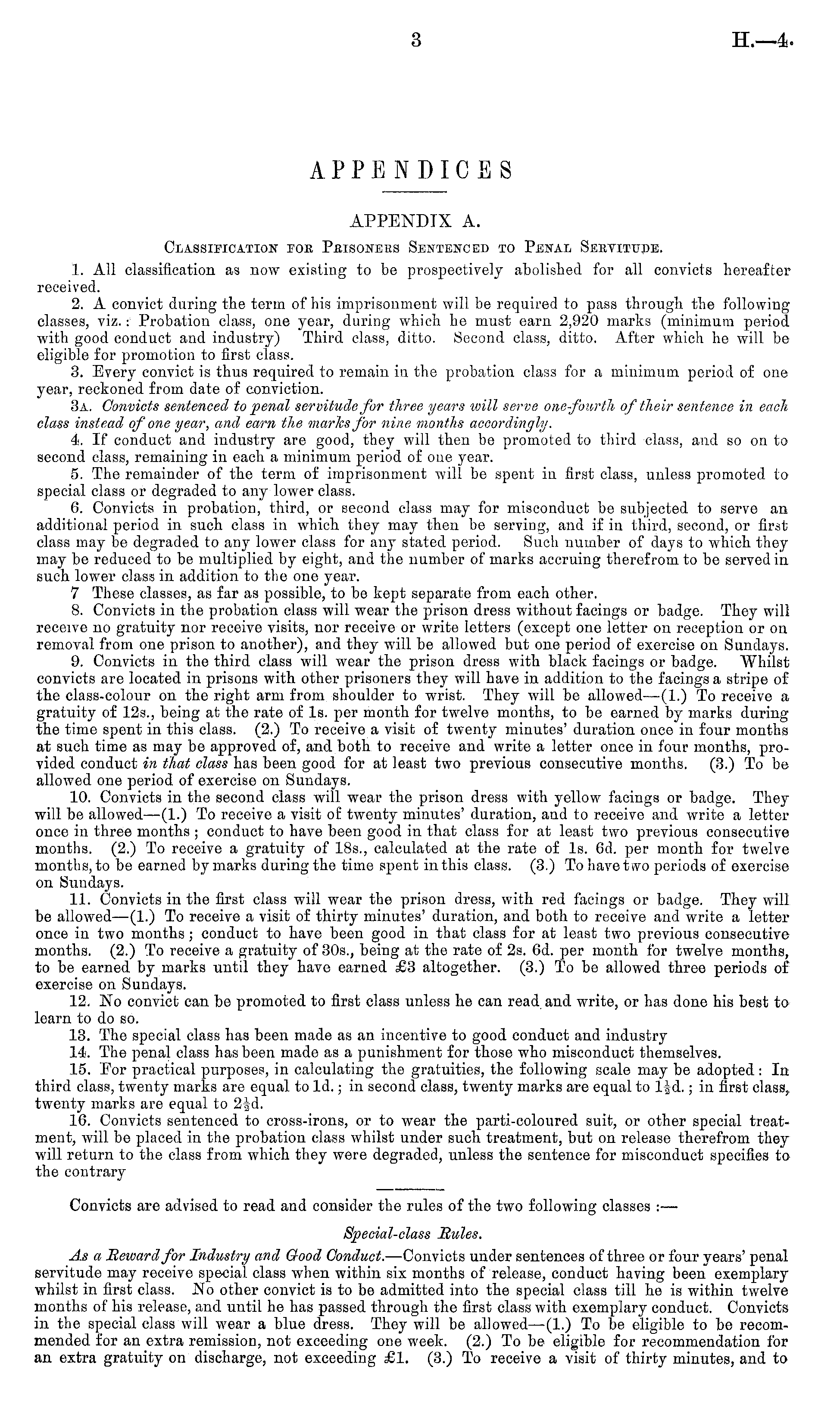 APPENDIX A. Classification eoe Prisoners Sentenced to Penal Servitude. 1. All classification as now existing to be prospectively abolished for all convicts hereafter received. 2. A convict during the term of his imprisonment will be required to pass through the following classes, viz.: Probation class, one year, during which he must earn 2,920 marks (minimum period with good conduct and industry) Third class, ditto. Second class, ditto. After which he will be eligible for promotion to first class. 3. Every convict is thus required to remain in the probation class for a minimum, period of one year, reckoned from date of conviction. 3a. Convicts sentenced to penal servitude for three years will serve one-fourth of their sentence in each class instead of one year, and earn the marks for nine months accordingly. 4. If conduct and industry are good, they will then be promoted to third class, and so on to second class, remaining in each a minimum period of oue year. 5. The remainder of the term of imprisonment will be spent iv first class, unless promoted to special class or degraded to any lower class. 6. Convicts in probation, third, or second class may for misconduct be subjected to serve an additional period in such class in which they may then be serving, and if in third, second, or first class may be degraded to any lower class for any stated period. Such number of days to which they may be reduced to be multiplied by eight, and the number of marks accruing therefrom to be served in such lower class in addition to the one year. 7 These classes, as far as possible, to be kept separate from each other. 8. Convicts in the probation class will wear the prison dress without facings or badge. They will receive no gratuity nor receive visits, nor receive or write letters (except one letter on reception or on removal from one prison to another), and they will be allowed but one period of exercise on Sundays. 9. Convicts in the third class will wear the prison dress with black facings or badge. Whilst convicts are located in prisons with other prisoners they will have in addition to the facings a stripe of the class-colour on the right arm from shoulder to wrist. They will be allowed —(1.) To receive a gratuity of 125., being at the rate of Is. per month for twelve months, to be earned by marks during the time spent in this class. (2.) To receive a visit of twenty minutes' duration once in four months at such time as may be approved of, and both to receive and write a letter once in four months, provided conduct in that class has been good for at least two previous consecutive months. (3.) To be allowed one period of exercise on Sundays. 10. Convicts in the second class will wear the prison dress with yellow facings or badge. They will be allowed—(l.) To receive a visit of twenty minutes' duration, and to receive and write a letter once in three months ; conduct to have been good in that class for at least two previous consecutive months. (2.) To receive a gratuity of 18s., calculated at the rate of Is. 6d. per month for twelve months, to be earned by marks during the time spent in this class. (3.) To have two periods of exercise on Sundays. 11. Convicts in the first class will wear the prison dress, with red facings or badge. They will be allowed —(1.) To receive a visit of thirty minutes' duration, and both to receive and write a letter once in two months ; conduct to have been good in that class for at least two previous consecutive months. (2.) To receive a gratuity of 305., being at the rate of 2s. 6d. per month for twelve months, to be earned by marks until they have earned £3 altogether. (3.) To be allowed three periods of exercise on Sundays. 12. No convict can be promoted to first class unless he can read and write, or has done his best to learn to do so. 13. The special class has been made as an incentive to good conduct and industry 14. The penal class has been made as a punishment for those who misconduct themselves. 15. For practical purposes, in calculating the gratuities, the following scale may be adopted: In third class, twenty marks are equal to Id.; in second class, twenty marks are equal to l|d.; in first class, twenty marks are equal to 2|d, 16. Convicts sentenced to cross-irons, or to wear the parti-coloured suit, or other special treatment, will be placed in the probation class whilst under such treatment, but on release therefrom they will return to the class from which they were degraded, unless the sentence for misconduct specifies to the contrary