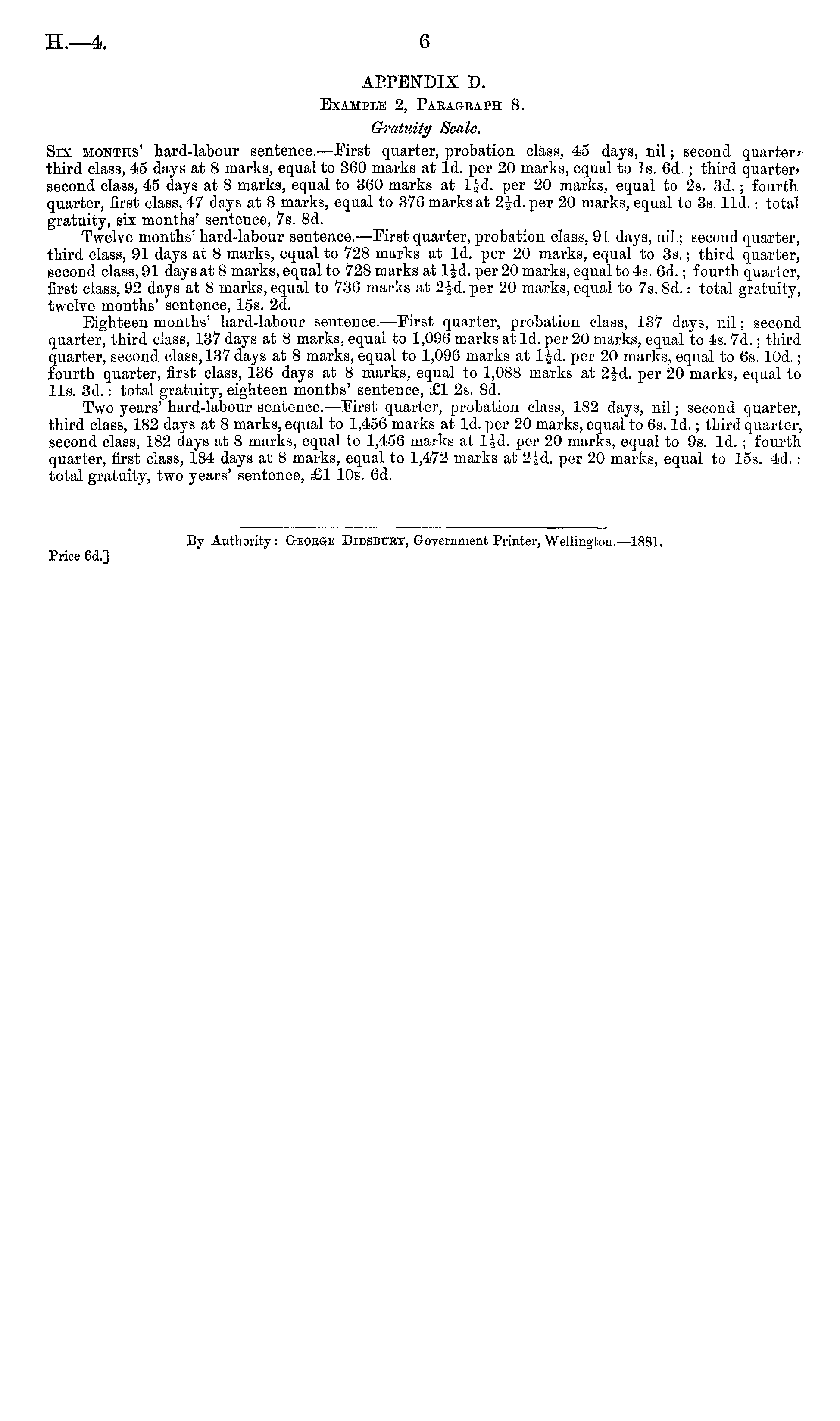APPENDIX D. Example 2, Paragbaph 8. Gtratuity Scale. Six months' hard-labour sentence. —First quarter, probation class, 45 days, nil; second quarter' third class, 45 days at 8 marks, equal to 360 marks at Id. per 20 marks, equal to Is. 6d. ; third quarter; second class, 45 days at 8 marks, equal to 360 marks at ljd. per 20 marks, equal to 2s. 3d.; fourth quarter, first class, 47 days at 8 marks, equal to 376 marks at 2§d. per 20 marks, equal to 3s. lid.: total gratuity, six months' sentence, 7s. Bd. Twelve months' hard-labour sentence. —First quarter, probation class, 91 days, nil.; second quarter, third class, 91 days at 8 marks, equal to 728 marks at Id. per 20 marks, equal to 35.; third quarter, second class, 91 days at 8 marks, equal to 728 murks at lid. per 20 marks, equal to 4s. 6d.; fourth quarter, first class, 92 days at 8 marks, equal to 736 marks at 2|d. per 20 marks, equal to 7s. Bd.: total gratuity, twelve months' sentence, 15s. 2d. Eighteen months' hard-labour sentence. —First quarter, probation class, 137 days, nil; second quarter, third class, 137 days at 8 marks, equal to 1,096 marks at Id. per 20 marks, equal to 4s. 7d.; third quarter, second class, 137 days at 8 marks, equal to 1,096 marks at If d. per 20 marks, equal to 6s. lOd.; fourth quarter, first class, 136 days at 8 marks, equal to 1,088 marks at 2|d. per 20 marks, equal to lls. 3d.: total gratuity, eighteen months' sentence, £1 2s. Bd. Two years' hard-labour sentence. —First quarter, probation class, 182 days, nil; second quarter, third class, 182 days at 8 marks, equal to 1,456 marks at Id. per 20 marks, equal to 6s. Id.; third quarter, second class, 182 days at 8 marks, equal to 1,456 marks at ljd. per 20 marks, equal to 9s. Id. ; fourth quarter, first class, 184 days at 8 marks, equal to 1,472 marks at 2Jd. per 20 marks, equal to 15s. 4d.: total gratuity, two years' sentence, £1 10s. 6d.