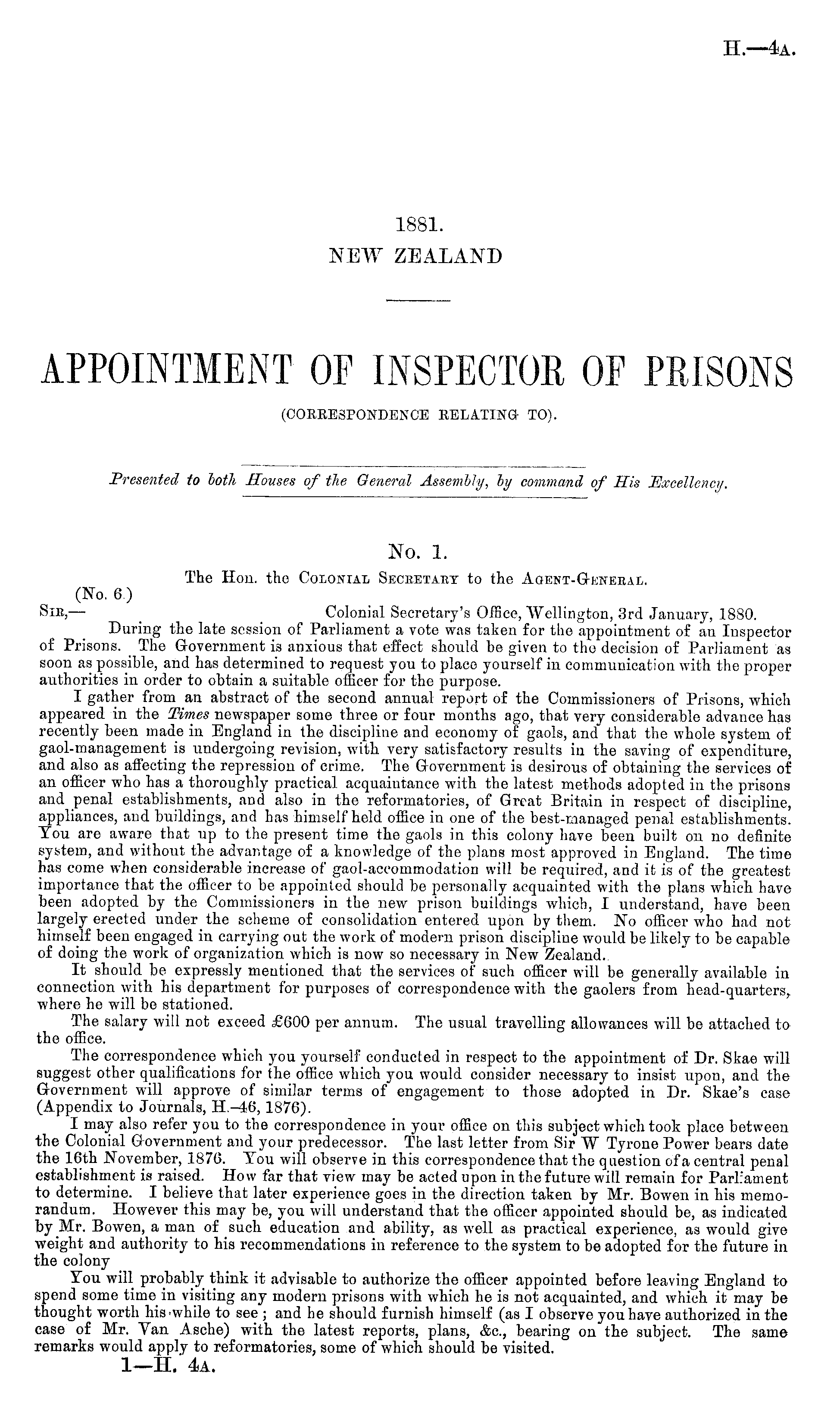 No. 1. The Hon. the Colonial Secretary to the Agent-General. (No. 6 ) Sir, — Colonial Secretary's Office, Wellington, 3rd January, 1880. During the late session of Parliament a vote was taken for the appointment of an Inspector of Prisons. _ The Government is anxious that effect should be given to tho decision of Parliament as soon as possible, and has determined to request you to place yourself in communication with the proper authorities in order to obtain a suitable officer for the purpose. I gather from an abstract of the second annual report of the Commissioners of Prisons, which appeared in the Times newspaper some three or four months ago, that very considerable advance has recently been made in England in the discipline and economy of gaols, and that the whole system of gaol-management is undergoing revision, with very satisfactory results in the saving of expenditure, and also as affecting the repression of crime. The Government is desirous of obtaining the services of an officer who has a thoroughly practical acquaintance with the latest methods adopted in the prisons and penal establishments, and also in the reformatories, of Great Britain in respect of discipline, appliances, and buildings, and has himself held office in one of the best-managed penal establishments. You are aware that up to the present time the gaols in this colony have been built on no definite system, and without the advantage of a knowledge of the plans most approved in England. The time has come when considerable increase of gaol-accommodation will be required, and it is of the greatest importance that the officer to be appointed should be personally acquainted with the plans which have been adopted by the Commissioners in the new prison buildings which, I understand, have been largely erected under the scheme of consolidation entered upon by them. No officer who had not himself been engaged in carrying out the work of modern prison discipline would be likely to be capable of doing the work of organization which is now so necessary in New Zealand. It should be expressly mentioned that the services of such officer will be generally available in connection with his department for purposes of correspondence with the gaolers from head-quarters, where he will be stationed. The salary will not exceed £600 per annum. The usual travelling allowances will be attached to the office. The correspondence which you yourself conducted in respect to the appointment of Dr. Skae will suggest other qualifications for the office which you would consider necessary to insist upon, and the Government will approve of similar terms of engagement to those adopted in Dr. Skae's case (Appendix to Journals, H.-46, 1876). I may also refer you to the correspondence in your office on this subject which took place between the Colonial Government and your predecessor. The last letter from Sir W Tyrone Power bears date the 16th November, 1876. You will observe in this correspondence that tho question of a central penal establishment is raised. How far that view may be acted upon in the future will remain for Parliament to determine. I believe that later experience goes in the direction taken by Mr. Bowen in his memorandum. However this may be, you will understand that the officer appointed should be, as indicated by_Mr. Bowen, a man of such education and ability, as well as practical experience, as would give weight and authority to his recommendations in reference to the system to be adopted for the future in the colony You will probably think it advisable to authorize the officer appointed before leaving England to spend some time in visiting any modern prisons with which he is not acquainted, and which it may be thought worth his while to see ; and he should furnish himself (as I observe you have authorized in the case of Mr. Van Asche) with the latest reports, plans, &c., bearing on the subject. The same remarks would apply to reformatories, some of which should be visited. 1-H. 4a.