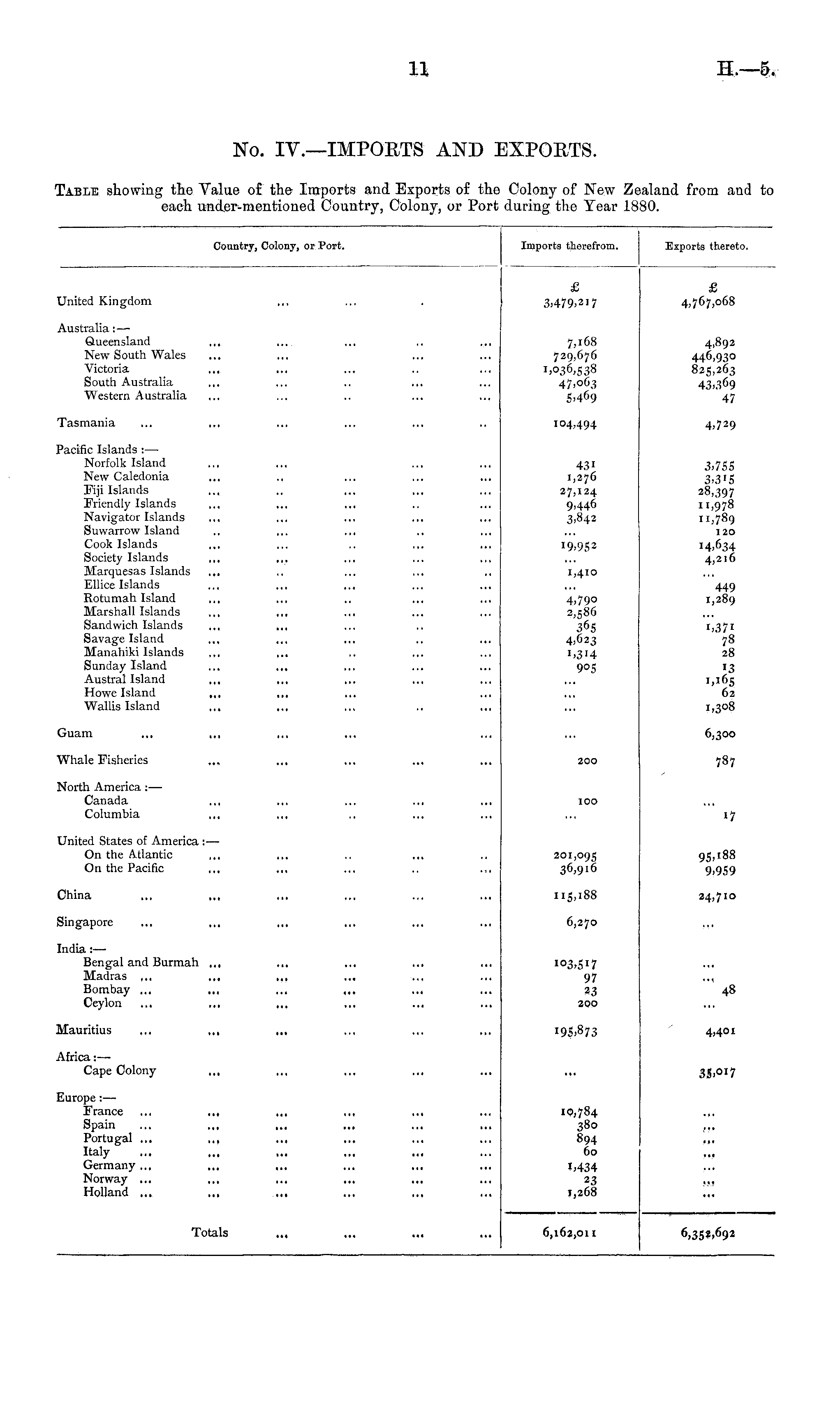 No. IV.—IMPORTS AND EXPORTS. Table showing the Value of the Imports and Exports of the Colony of New Zealand from and to each under-mentioned Country, Colony, or Port during the Year 1880.