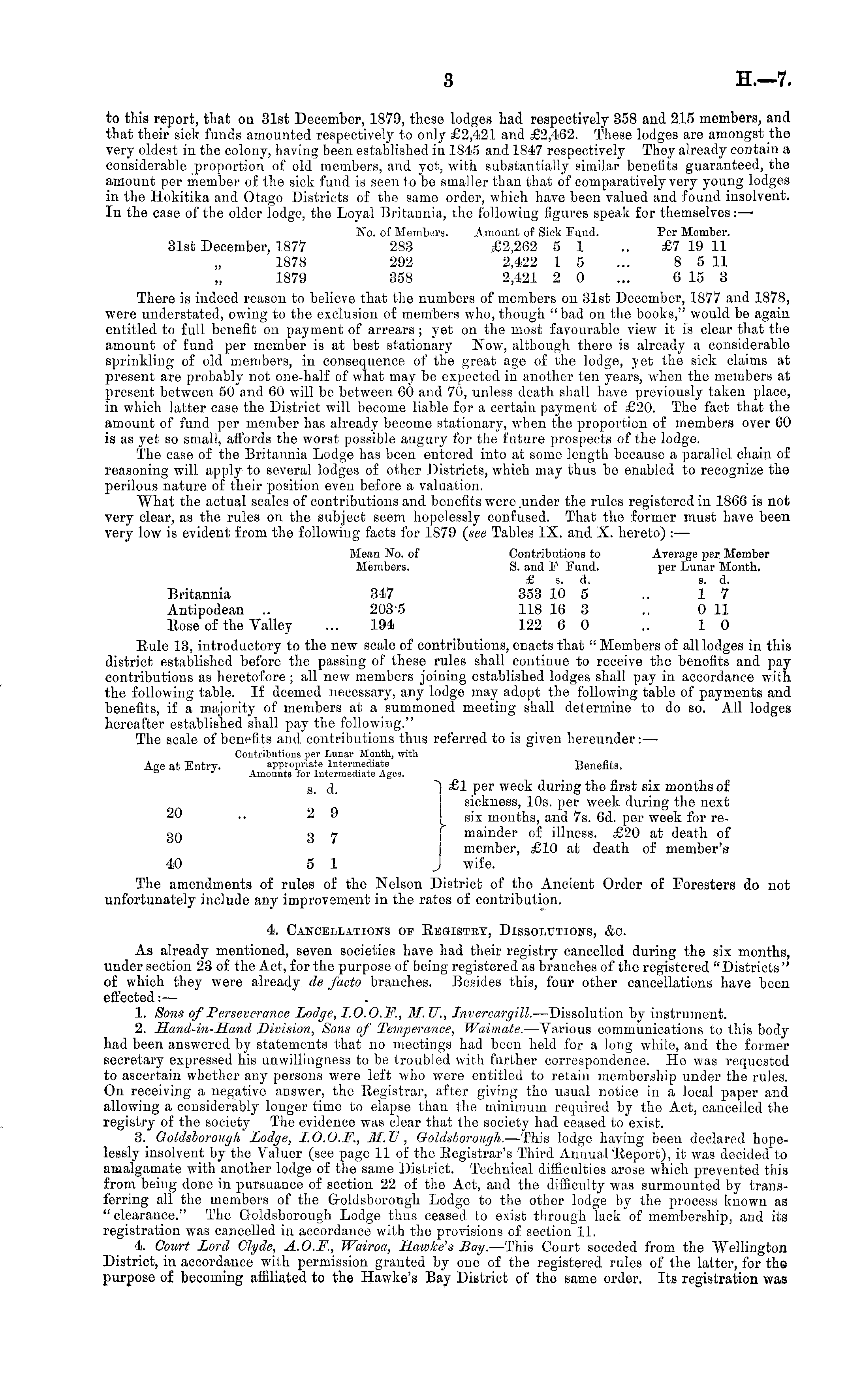 to this report, that on 81st December, 1879, these lodges had respectively 358 and 215 members, and that their sick funds amounted respectively to only £2,421 and £2,462. These lodges are amongst the very oldest in the colony, having been established in 1845 and 1847 respectively They already contain a considerable proportion of old members, and yet, with substantially similar benefits guaranteed, the amount per member of the sick fund is seen to be smaller than that of comparatively very young lodges in the Hokitika and Otago Districts of the same order, which have been valued and found insolvent. In the case of the older lodge, the Loyal Britannia, the following figures speak for themselves: — No. of Members. Amount of Sick Fund. Per Member. 31st December, 1877 283 £2,262 5 1 .. £7 19 11 1878 292 2,422 15 ... 8 5 11 „ 1879 358 2,421 2 0 ... 6 15 3 There is indeed reason to believe that the numbers of members on 31st December, 1877 and 1878, were understated, owing to the exclusion of members who, though "bad on the books," would be again entitled to full benefit on payment of arrears ; yet on the most favourable view it is clear that the amount of fund per member is at best stationary Now, although there is already a considerable sprinkling of old members, in consequence of the great age of the lodge, yet the sick claims at present are probably not one-half of what may be expected in another ten years, when the members at present between 50 and 60 will be between 60 and 70, unless death shall have previously taken place, in which latter case the District will become liable for a certain payment of £20. The fact that the amount of fund per member has already become stationary, when the proportion of members over 60 is as yet so small, affords the worst possible augury for the future prospects of the lodge. The case of the Britannia Lodge has been entered into at some length because a parallel chain of reasoning will apply to several lodges of other Districts, which may thus be enabled to recognize the perilous nature of their position even before a valuation. What the actual scales of contributions and benefits were.under the rules registered in 1866 is not very clear, as the rules on the subject seem hopelessly confused. That the former must have been very low is evident from the following facts for 1879 (see Tables IX. and X. hereto) :— Mean No. of Contributions to Average per Member Members. S. and J? Fund. per Lunar Month. £ s. d. b. d. Britannia 347 353 10 5 .. 17 Antipodean .. 203 5 118 16 3 .. 011 Rose of the Valley ... 194 122 6 0 .. 10 Rule 13, introductory to the new scale of contributions, enacts that " Members of all lodges in this district established before the passing of these rules shall continue to receive the benefits and pay contributions as heretofore; all new members joining established lodges shall pay in accordance with, the following table. If deemed necessary, any lodge may adopt the following table of payments and benefits, if a majority of members at a summoned meeting shall determine to do so. All lodges hereafter established shall pay the following." The scale of benefits and contributions thus referred to is given hereunder: — Contributions per Lunar Month, with Age at Entry- appropriate Intermediate Benefits. Amounts for Intermediate Ages. B> d. "1 £1 P er week during the first six months of sickness, 10s. per week during the next 20 •• 2 9 1 six months, and 7s. 6d. per week for re--30 3 7 mainder of illness. £20 at death of member, £10 at death of member's 40 5 1 J wife. The amendments of rules of the Nelson District of the Ancient Order of Foresters do not unfortunately include any improvement in the rates of contribution. 4. Cancellations op Registry, Dissolutions, &c. As already mentioned, seven societies have had their registry cancelled during the six months, under section 23 of the Act, for the purpose of being registered as branches of the registered "Districts" of which they were already de facto branches. Besides this, four other cancellations have been effected: — 1. Sons of Perseverance Lodge, 1.0.0. F., M. U., Invercargill. —Dissolution by instrument. 2. Hand-in-Hand Division, Sons of Temperance, Waimate. —Various communications to this body had been answered by statements that no meetings had been held for a long while, and the former secretary expressed his unwillingness to be troubled with further correspondence. He was requested to ascertain whether any persons were left who were entitled to retain membership under the rules. On receiving a negative answer, the Registrar, after giving the usual notice in a local paper and allowing a considerably longer time to elapse than the minimum required by the Act, cancelled the registry of the society The evidence was clear that the society had ceased to exist. 3. Qoldsoorougli Lodge, 1.0.0. F., M. V , Goldshorough. —This lodge having been declared hopelessly insolvent by the Valuer (see page 11 of the Registrar's Third Annual' Report), it was decided to amalgamate with another lodge of the same District. Technical difficulties arose which prevented this from being done in pursuance of section 22 of the Act, and the difficulty was surmounted by transferring all the members of the Groldsborotigh Lodge to the other lodge by the process known ac " clearance." The Groldsborough Lodge thus ceased to exist through lack of membership, and its registration was cancelled in accordance with the provisions of section 11. 4. Court Lord Clyde, A.0.F., Wairoa, Hawhe's Bay. —This Court seceded from the "Wellington District, in accordance with permission granted by one of the registered rules of the latter, for the purpose of becoming affiliated to the Hawke's Bay District of the same order. Its registration was