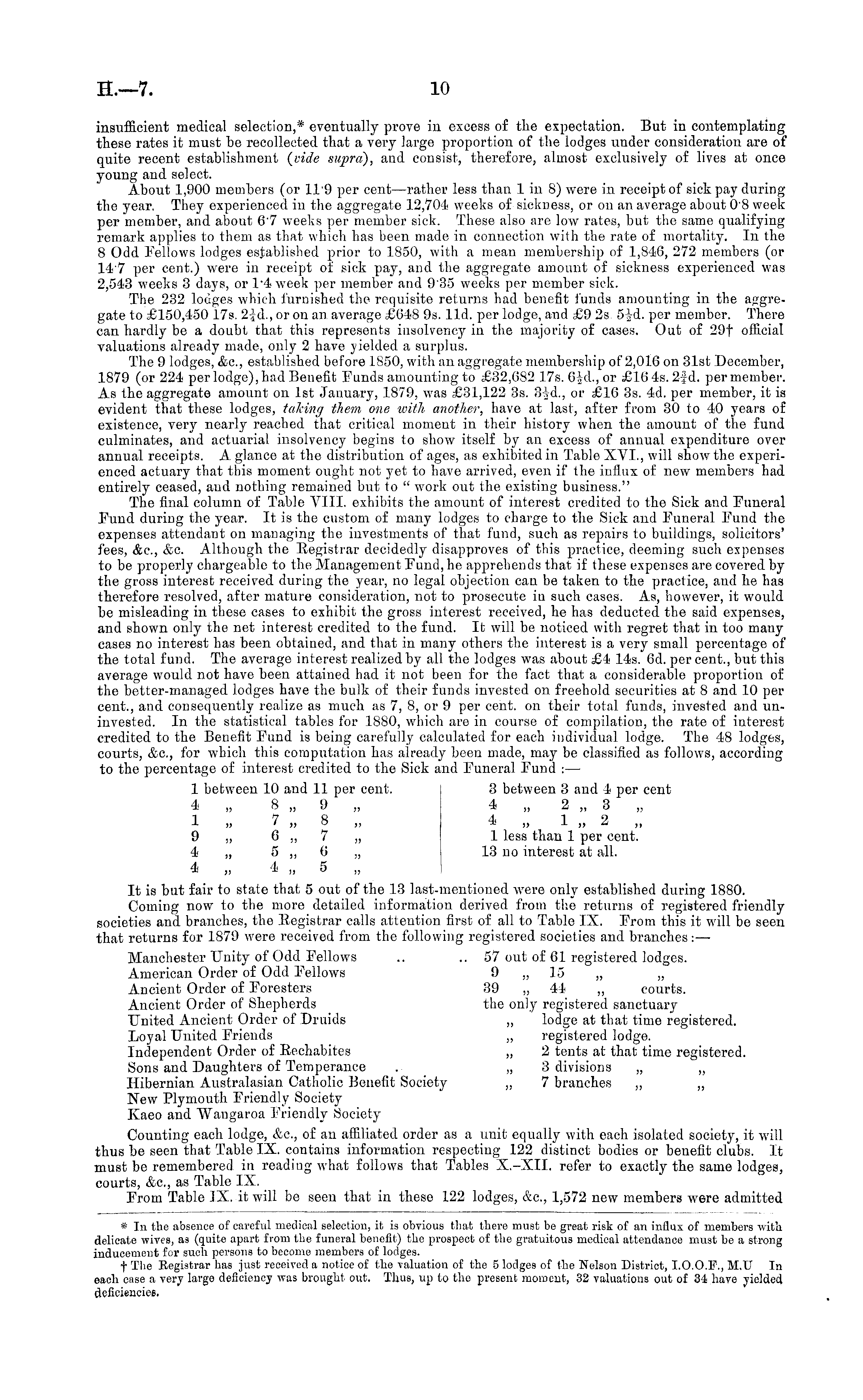 * In the absence of careful medical selection, it is obvious that there must be great risk of an influx of members with delicate wives, as (quite apart from the funeral benefit) the prospect of the gratuitous medical attendance must be a strong inducement for such persons to become members of lodges. f The Registrar has just received a notice of the valuation of the 5 lodges of the Nelson District, 1.0.0. F., M.U In each case a very large deficiency was brought out. Thus, up to the present moment, 32 valuations out of 34 have yielded deficiencies.