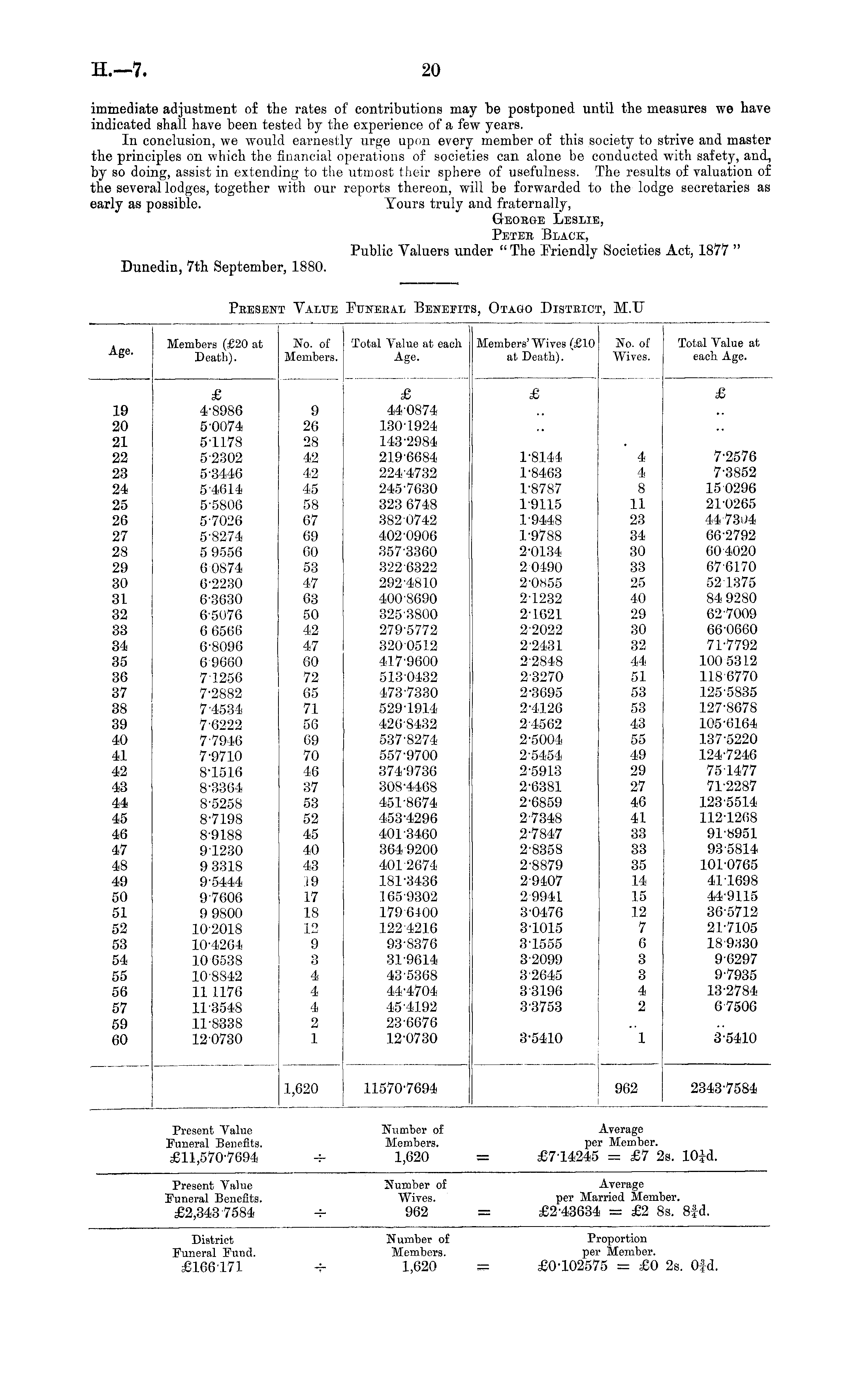 immediate adjustment of the rates of contributions may be postponed until the measures we have indicated shall have been tested by the experience of a few years. In conclusion, we would earnestly urge upon every member of this society to strive and master the principles on which the financial operations of societies can alone be conducted with safety, and, by so doing, assist in extending to the utmost their sphere of usefulness. The results of valuation of the several lodges, together with our reports thereon, will be forwarded to the lodge secretaries as early as possible. Tours truly and fraternally, Q-eobge Leslie, Peteb Black, Public Valuers under " The Friendly Societies Act, 1877 " Dunedin, 7th September, 1880.