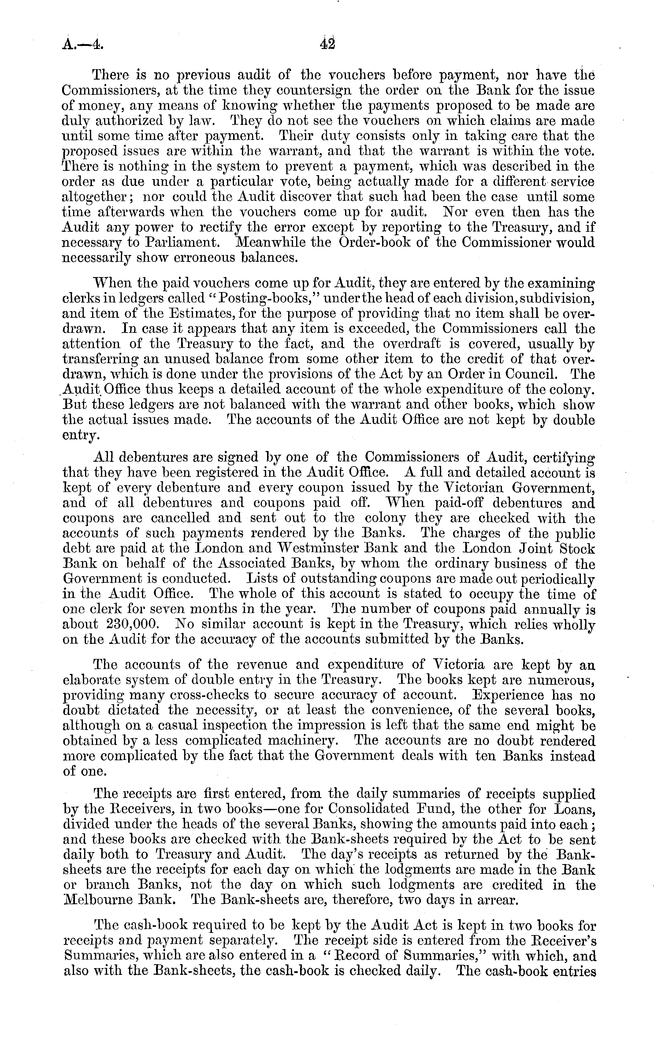 There is no previous audit of the vouchers before payment, nor have the Commissioners, at the time they countersign the order on the Bank for the issue of money, any means of knowing whether the payments proposed to be made are duly authorized by law. They do not see the vouchers on which claims are made until some time after payment. Their duty consists only in taking care that the proposed issues are within the warrant, and that the warrant is within the vote. There is nothing in the system to prevent a payment, which was described in the order as due under a particular vote, being actually made for a different service altogether; nor could the Audit discover that such had been the case until some time afterwards when the vouchers come up for audit. Nor even then has the Audit any power to rectify the error except by reporting to the Treasury, and if necessary to Parliament. Meanwhile the Order-book of the Commissioner would necessarily show erroneous balances. When the paid vouchers come up for Audit, they are entered by the examining clerks in ledgers called " Posting-books," underthe head of each division, subdivision, and item of the Estimates, for the purpose of providing that no item shall be overdrawn. In case it appears that any item is exceeded, the Commissioners call the attention of the Treasury to the fact, and the overdraft is covered, usually by transferring an unused balance from some other item to the credit of that overdrawn, which is done under the provisions of the Act by an Order in Council. The Audit Office thus keeps a detailed account of the whole expenditure of the colony. But these ledgers are not balanced with the warrant and other books, which show the actual issues made. The accounts of the Audit Office are not kept by double entry. All debentures are signed by one of the Commissioners of Audit, certifying that they have been registered in the Audit Office. A full and detailed account is kept of every debenture and every coupon issued by the Victorian Government, and of all debentures and coupons paid off. When paid-off debentures and coupons are cancelled and sent out to the colony they are checked with the accounts of such payments rendered by the Banks. The charges of the public debt are paid at the London and Westminster Bank and the London Joint Stock Bank on behalf of the Associated Banks, by whom the ordinary business of the Government is conducted. Lists of outstanding coupons are made out periodically in the Audit Office. The whole of this account is stated to occupy the time of one clerk for seven months in the year. The number of coupons paid annually is about 230,000. No similar account is kept in the Treasury, which relies wholly on the Audit for the accuracy of the accounts submitted by the Banks. The accounts of the revenue and expenditure of Victoria are kept by an elaborate system of double entry in the Treasury. The books kept are numerous, providing many cross-checks to secure accuracy of account. Experience has no doubt dictated the necessity, or at least the convenience, of the several books, although on a casual inspection the impression is left that the same end might be obtained by a less complicated machinery. The accounts are no doubt rendered more complicated by the fact that the Government deals with ten Banks instead of one. The receipts are first entered, from the daily summaries of receipts supplied by the Receivers, in two books —one for Consolidated Fund, the other for Loans, divided under the heads of the several Banks, showing the amounts paid into each; and these books are checked with the Bank-sheets required by the Act to be sent daily both to Treasury and Audit. The day's receipts as returned by the Banksheets are the receipts for each day on which the lodgments are made in the Bank or branch Banks, not the day on which such lodgments are credited in the Melbourne Bank. The Bank-sheets are, therefore, two days in arrear. The cash-book required to be kept by the Audit Act is kept in two books for receipts and payment separately. The receipt side is entered from the B,eceiver's Summaries, which are also entered in a " Pwecord of Summaries," with which, and also with the Bank-sheets, the cash-book is checked daily. The cash-book entries
