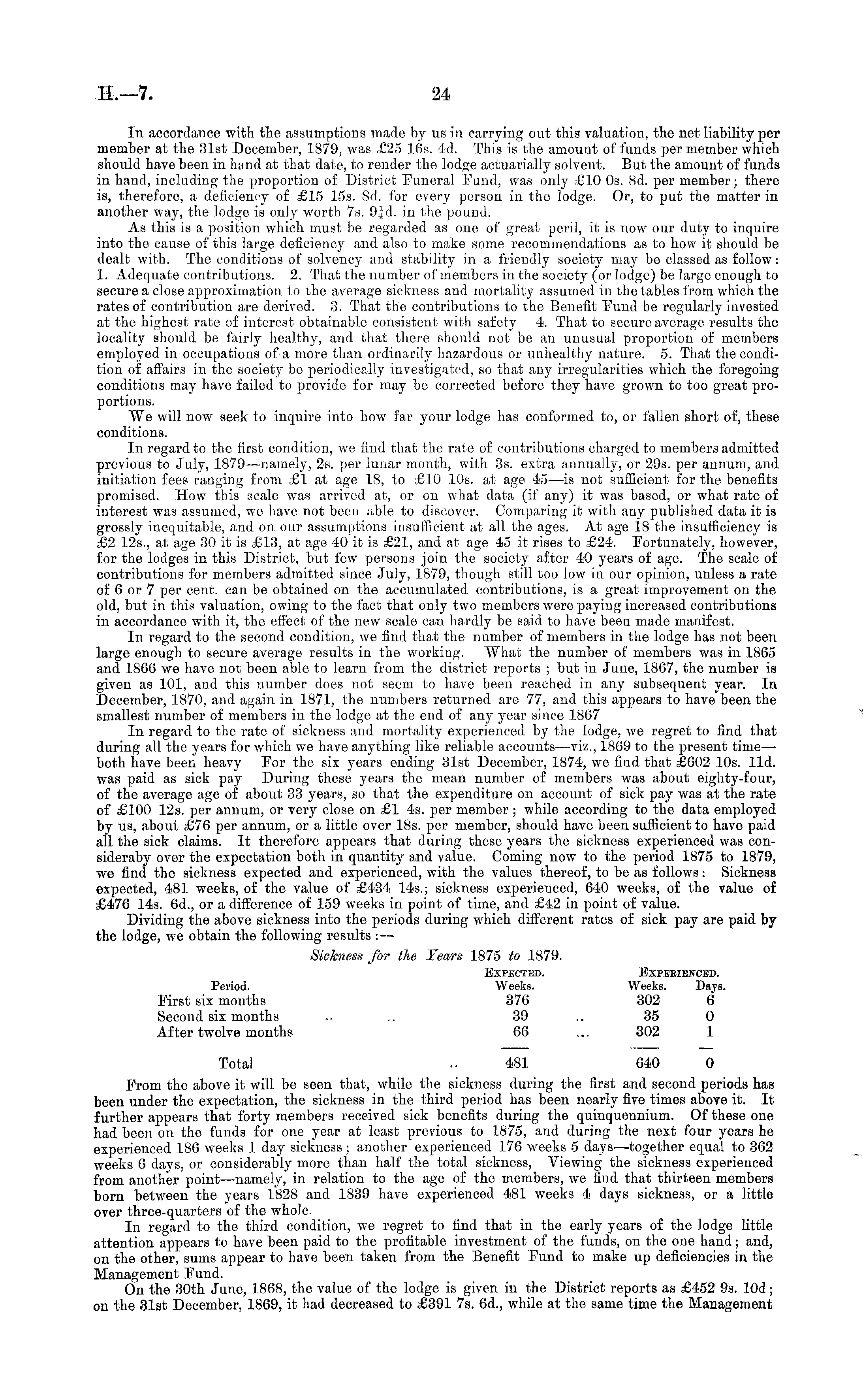 In accordance with the assumptions made by us in carrying out this valuation, the net liability per member at the 31st December, 1879, was £25 16s. 4d. This is the amount of funds per member which should hare been in hand at that date, to render the lodge actuarially solvent. But the amount of funds in hand, including the proportion of District Funeral Fund, was only £10 Os. Bd. per member; there is, therefore, a deficiency of £15 15s. Bd. for every person in the lodge. Or, to put the matter in another way, the lodge is only worth 7s. 9Jd. in the pound. As this is a position which must be regarded as one of great peril, it is now our duty to inquire into the cause of this large deficiency and also to make some recommendations as to how it should be dealt with. The conditions of solvency and stability in a friendly society may be classed as follow: 1. Adequate contributions. 2. That the number of members in the society (or lodge) be large enough to secure a close approximation to the average sickness and mortality assumed in the tables from which the rates of contribution are derived. 3. That the contributions to the Benefit Fund be regularly invested at the highest rate of interest obtainable consistent with safety 4. That to secure average results the locality should be fairly healthy, and that there should not be an unusual proportion of members employed in occupations of a more than ordinarily hazardous or unhealthy nature. 5. That the condition of affairs in the society be periodically investigated, so that any irregularities which the foregoing conditions may have failed to provide for may be corrected before they have grown to too great proportions. We will now seek to inquire into how far your lodge has conformed to, or fallen short of, these conditions. In regard to the first condition, we find that the rate of contributions charged to members admitted previous to July, 1879—namely, 2s. per lunar month, with 3s. extra annually, or 295. per annum, and initiation fees ranging from £1 at age 18, to £10 10s. at age 45—is not sufficient for the benefits promised. How this scale was arrived at, or on what data (if any) it was based, or what rate of interest was assumed, we have not been able to discover. Comparing it with any published data it is grossly inequitable, and on our assumptions insufficient at all the ages. At age 18 the insufficiency is £2 125., at age 30 it is £13, at age 40 it is £21, and at age 45 it rises to £24. Fortunately, however, for the lodges in this District, but few persons join the society after 40 years of age. The scale,of contributions for members admitted since July, 1879, though still too low in our opinion, unless a rate of 6 or 7 per cent, can be obtained on the accumulated contributions, is a great improvement on the old, but in this valuation, owing to the fact that only two members were paying increased contributions in accordance with it, the effect of the new scale can hardly be said to have been made manifest. In regard to the second condition, we find that the number of members in the lodge has not been large enough to secure average results in the working. What the number of members was in 1865 and 1866 we have not been able to learn from the district reports ; but in June, 1867, the number is given as 101, and this number does not seem to have been reached in any subsequent year. In December, 1870, and again in 1871, the numbers returned are 77, and this appears to have been the smallest number of members in the lodge at the end of any year since 1867 In regard to the rate of sickness and mortality experienced by the lodge, we regret to find that during all the years for which we have anything like reliable accounts —viz., 1869 to the present time— both have been heavy For the six years ending 31st December, 1874, we find that £602 10s. lid. was paid as sick pay During these years the mean number of members was about eighty-four, of the average age of about 33 years, so that the expenditure on account of sick pay was at the rate of £100 12s. per annum, or very close on £1 4s. per member ; while according to the data employed by us, about £76 per annum, or a little over 18s. per member, should have been sufficient to have paid all the sick claims. It therefore appears that during these years the sickness experienced was consideraby over the expectation both in quantity and value. Coming now to the period 1875 to 1879, we find the sickness expected and experienced, with the values thereof, to be as follows: Sickness expected, 481 weeks, of the value of £434 145.; sickness experienced, 640 weeks, of the value of £476 14s. 6d., or a difference of 159 weeks in point of time, and £42 in point of value. Dividing the above sickness into the periods during which different rates of sick pay are paid by the lodge, we obtain the following results : — Sickness for the Tears 1875 to 1879. Expected. Experienced. Period. Weeks. Weeks. Days. First six months 376 302 6 Second six months .. ... 39 .. 35 0 After twelve months .66 ... 302 1 Total .. 481 640 0 From the above it will be seen that, while the sickness during the first and second periods has been under the expectation, the sickness in the third period has been nearly five times above it. It further appears that forty members received sick benefits during the quinquennium. Of these one had been on the funds for one year at least previous to 1875, and during the next four years he experienced 186 weeks 1 day sickness ; another experienced 176 weeks 5 days—together equal to 362 weeks 6 days, or considerably more than half the total sickness, Viewing the sickness experienced from another pomt —namely, in relation to the age of the members, we find that thirteen members born between the years 1828 and 1839 have experienced 481 weeks 4 days sickness, or a little over three-quarters of the whole. In regard to the third condition, we regret to find that in the early years of the l