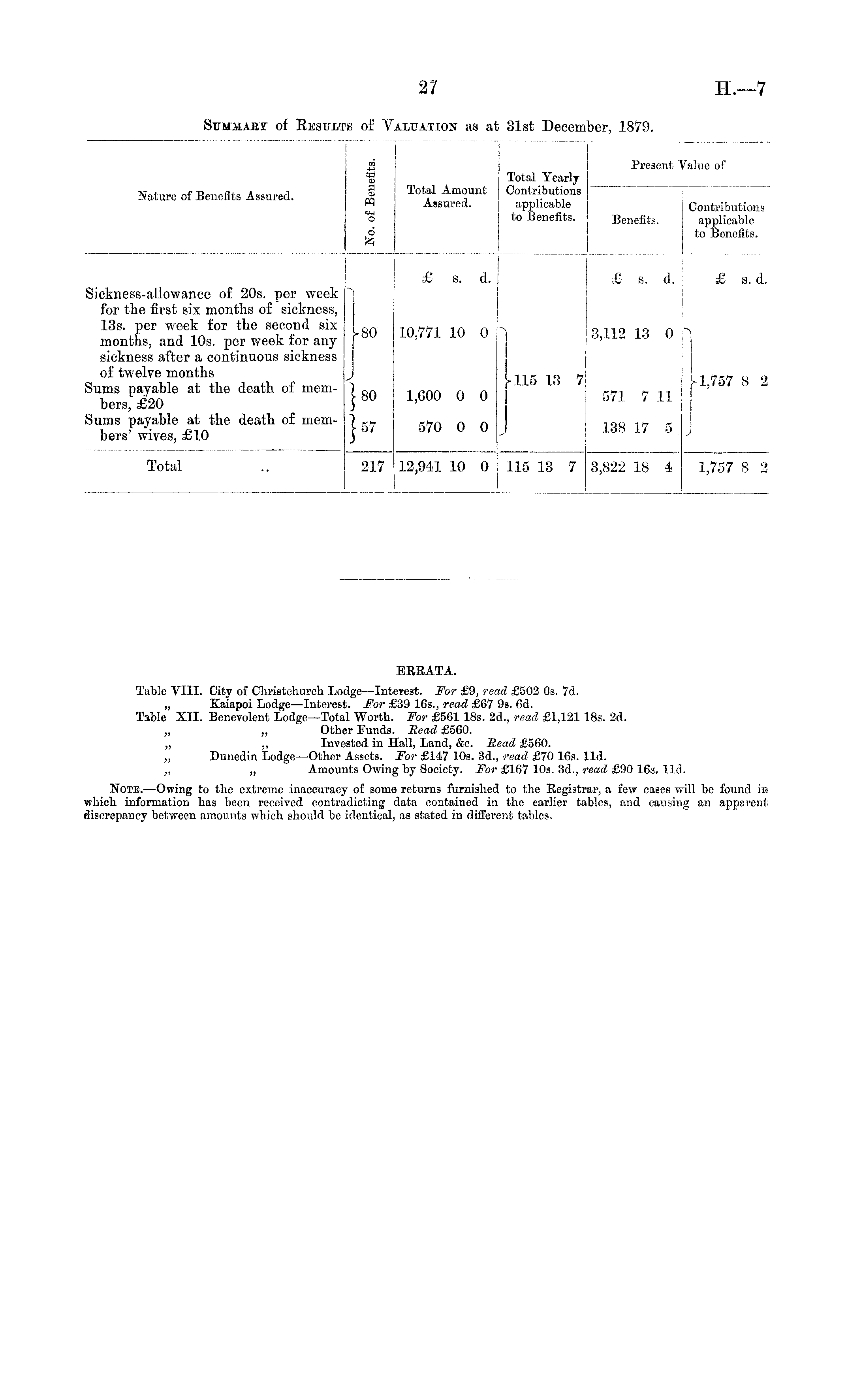 ERRATA. Table VIII. City of Ckristchurch Lodge—lnterest. For £9, read £502 os. 7d. „ Kaiapoi Lodge—lnterest. For £39 165., read £67 9e. 6d. Table XII. Benevolent Lodge—Total Worth. For £561 18s. 2d., read £1,121 18s. 2d. „ „ Other Funds. Read £560. „ ~ Invested in Hall, Land, &c. Head £560. „ Dunedin Lodge—Other Assets. For £147 10s. 3d., read £70 16s. lid. „ „ Amounts Owing by Society. For £167 10s. 3d., read £90 16s. lid. Note. —Owing to the extreme inaccuracy of some returns furnished to the Registrar, a few cases will be found in which, information has been received contradicting data contained in the earlier tables, and causing an apparent discrepancy between amounts which should be identical, as stated in different tables.